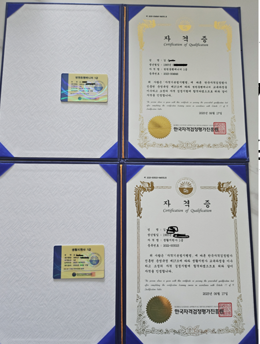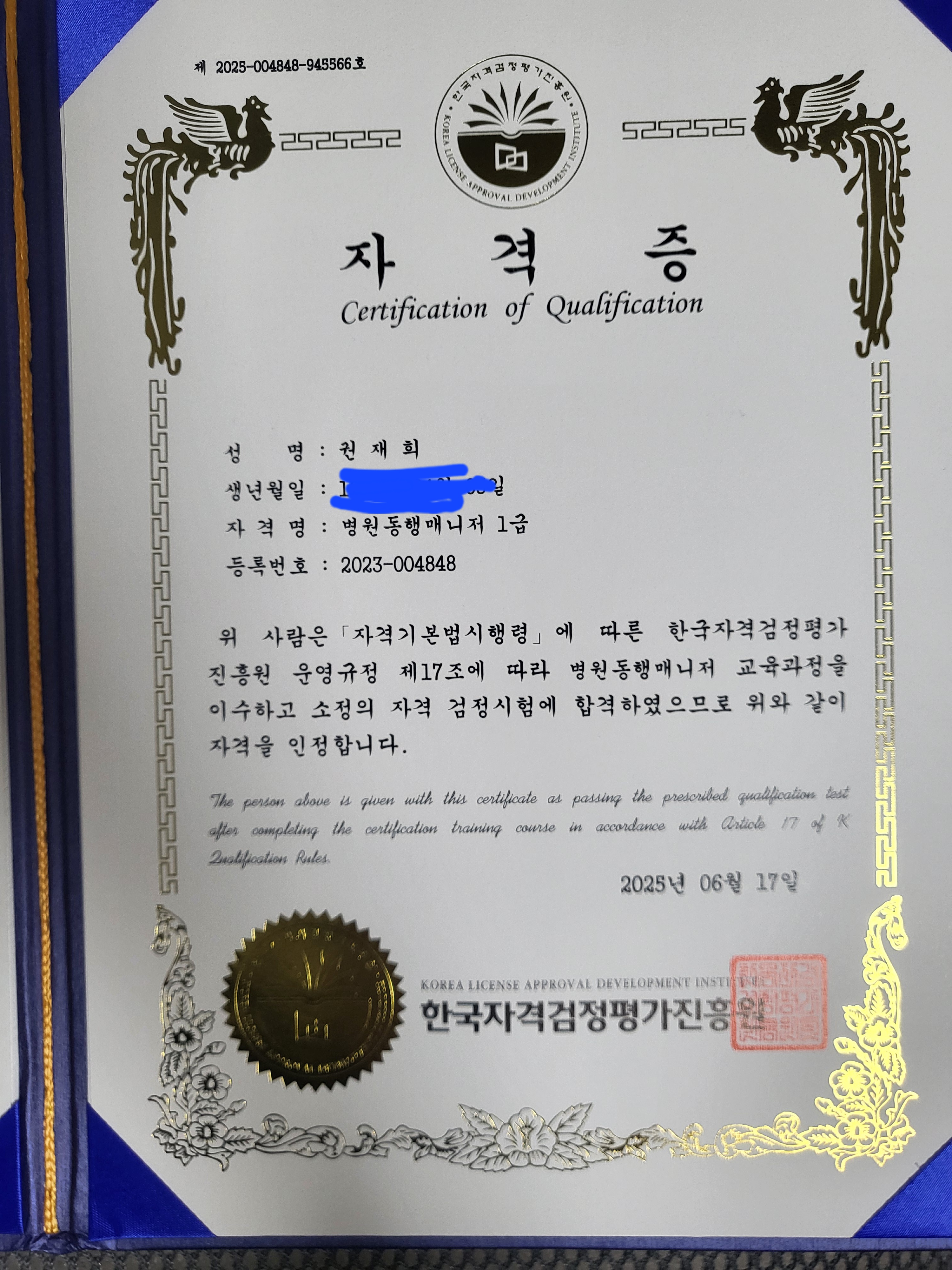 정년퇴임을 한달 앞두고 뭔가 제2의 인생을 준비해야겠다고 마음먹고 검색하다 일단 도전했습니다 병원 동행매니저 1급과 생활지원사1급을 취득하면서 뭔가 사회에 도움이 되는 일을 잘 할 수 있을것 같아 기쁩니다