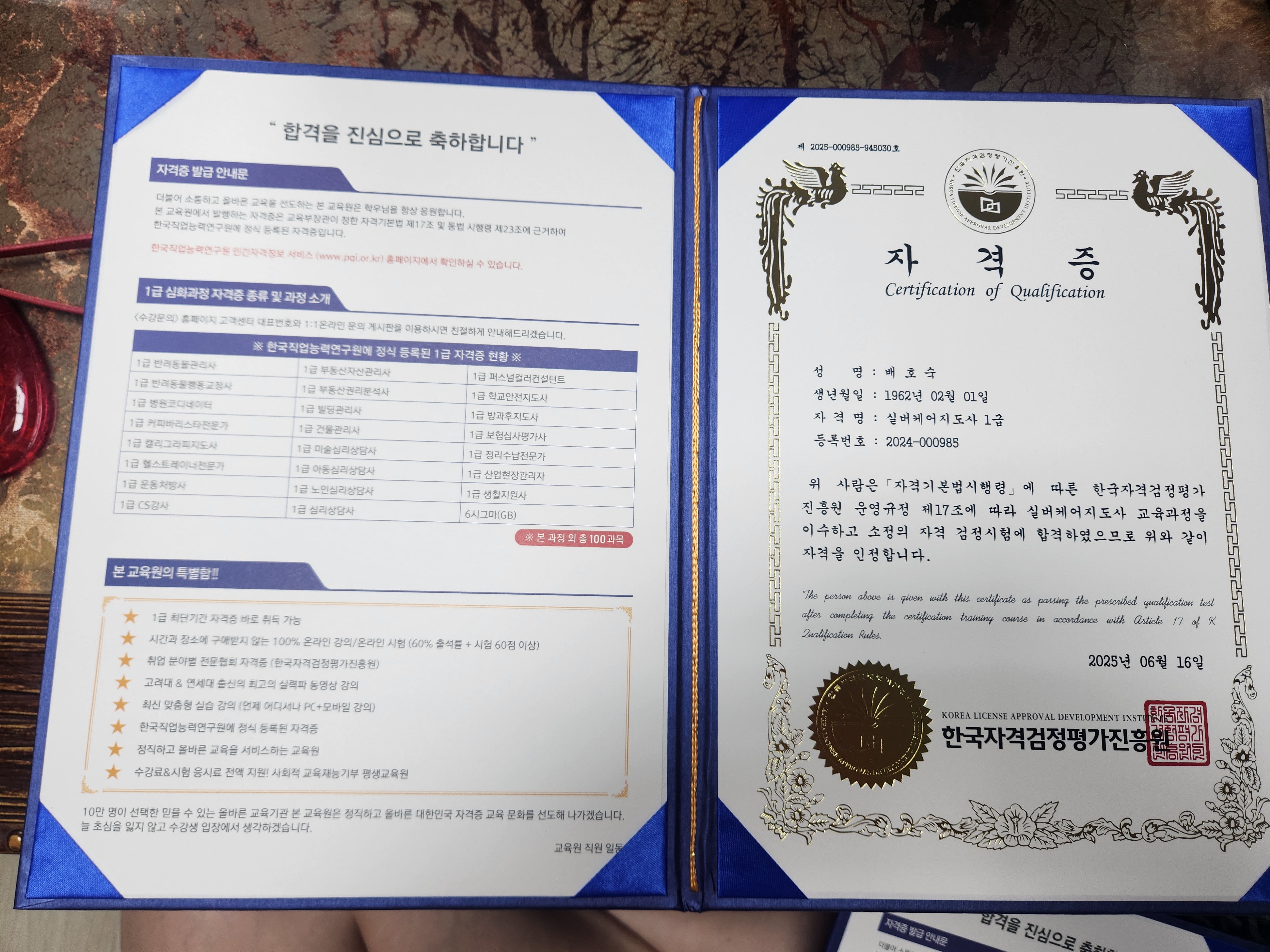 밤 시간을 이용해서 강의를 듣고 시험도 응시하여 합격을 하고 자격증까지 받으니 엄청 뿌듯하네요. 이 일을 하게 될지 어떨지는 미지수 이지만 공부를 하고 자격증 취득은 무료했든 일상에 성취감을 갖게 되고 환갑을 지난 나이에도공부를 할수 있다는게 참 감사하네요.