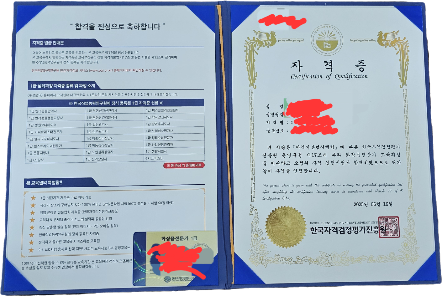 안녕하세요~ 제가 6월 19일날에 시험 합격하고 자격증 발급 신청했는데 바로 어제 6월 21일날에 (내 생일날에^^) 택배가 왔어요^^ 너무 감사해요! 제가 원래 자기 집 청소랑 정리하는 게 좋아하는 편인데 요즘에 여러가지 센터에서 이런 정리수납전문가라는 교육이 있다는 게 보고 관심 가졌는데 돈 내고 하는 게 좀 부담스러워서 한 번 네이버에 들어가서 좀 저렴한 교육 검색해 보니 아예 무료 수강이 있더라구요^^~~~ 그래서 바로 회원가입하고 신청해서 수강 들었고 시험까지 봤어요~ 수강은 너무 재미있어서 넘 발리 다 봤어요~~ 선생님한테 감사하고 이 온라인 교육원에 이런 비대면으로 편하게 들을 수 있는 자격증 수강 만들어 주셔서 정말 감사합니다! 다들 건강하고 행복하고 자기가 좋아하는 일 찾고 사회에서 인정 받으시길 바라요!