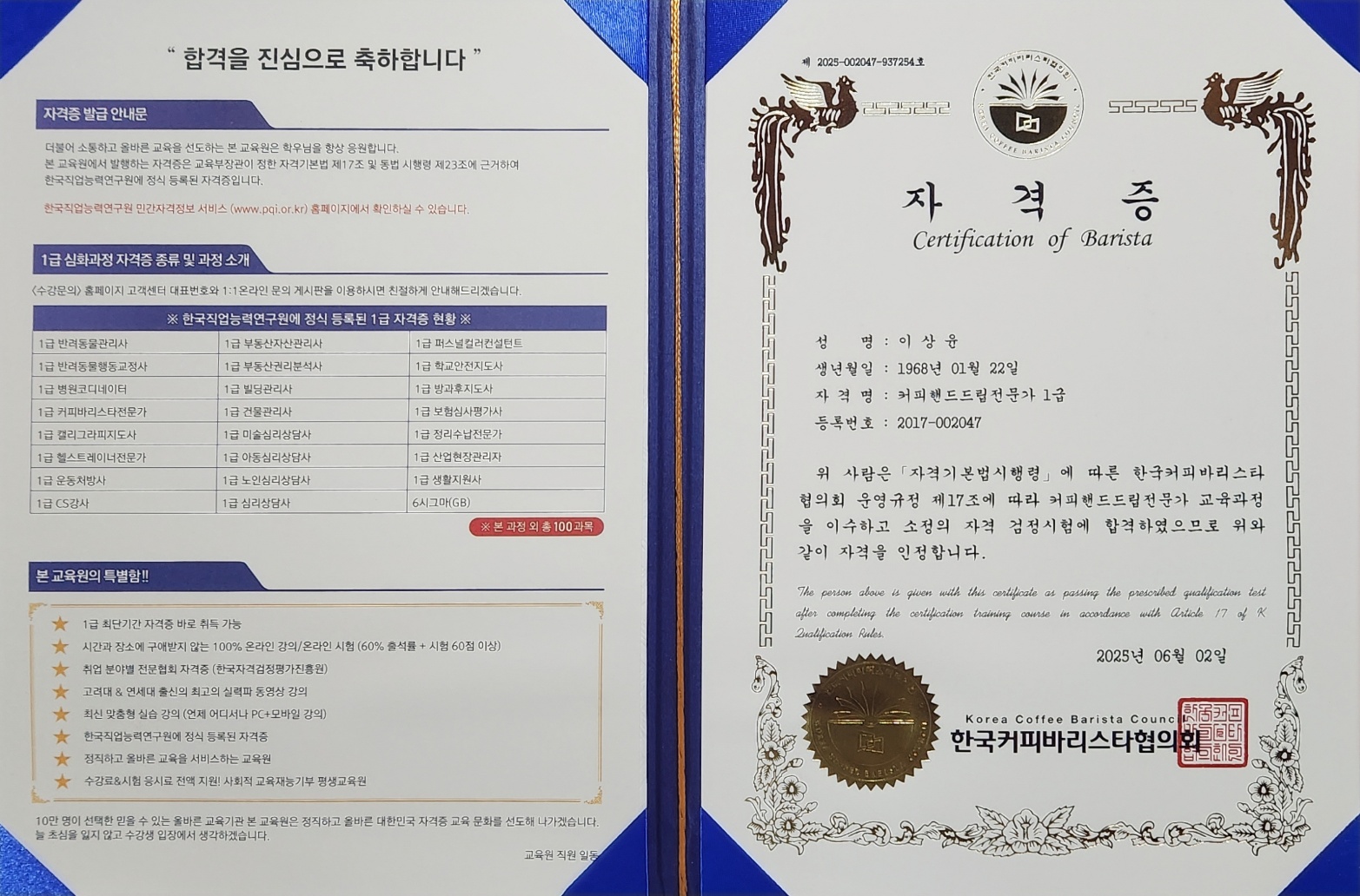 예기치 못한 사고로 장애를 갖게 된 후, 우울한 시간을 보내다 우연히 한국자격증협회를 알게 됐습니다. 커피를 좋아했던 터라 커피바리스타 자격증 과정에 도전하게 되었고, 무료 강의와 예상문제만 잘 따라가니 어렵지 않게 합격할 수 있었습니다. 자격증이 도착했을 때, ‘나도 할 수 있구나’라는 생각에 가슴이 벅차올랐습니다. 덕분에 지금은 손뜨개도 도전 중이고, 앞으로 노후엔 작은 커피공방을 열어보려는 꿈도 갖게 됐어요. 혹시 망설이는 분 계시다면 꼭 해보세요. 시작이 반이고, 시간은 흘러가니까요. 한국자격증협회 덕분에 새로운 자신감을 얻었습니다. 감사합니다!