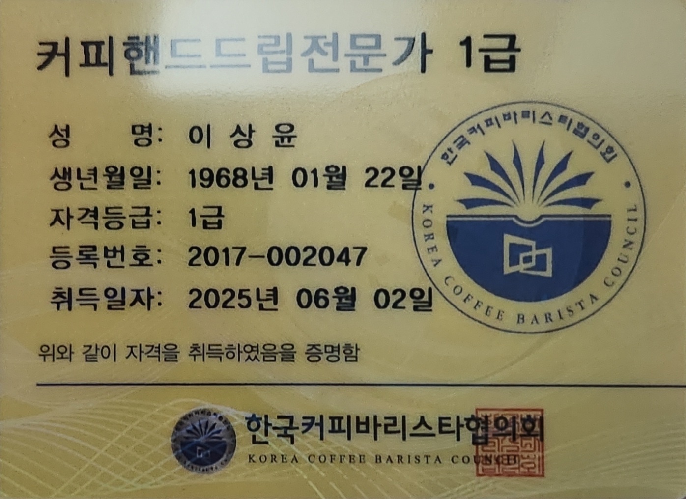 펜데믹이후 더욱 어려워진 시대 참 많은 고민을하는 시기인것 같습니다. 뭐라도? 해야한다는 소명이래 바리스타 취득이후 핸드드립을 도전하여 무난히 취득하게 되었습니다. 향후 또? 어떤 난관이 올지 모르지만, 직업의 다양성의 필요를 느껴 작은 성과를 거두게되어 큰 힘이됩니다.감사합니다.