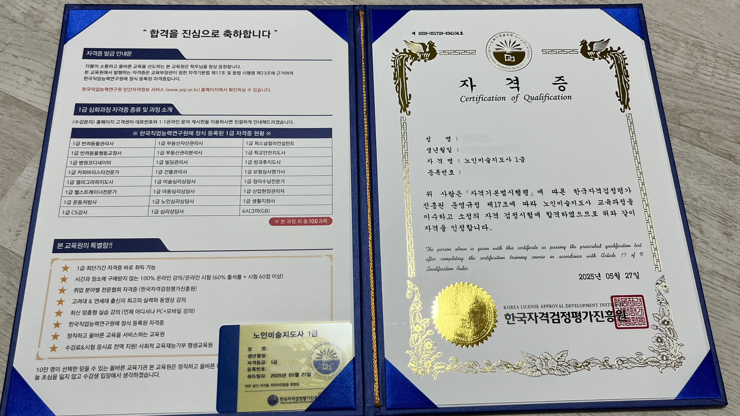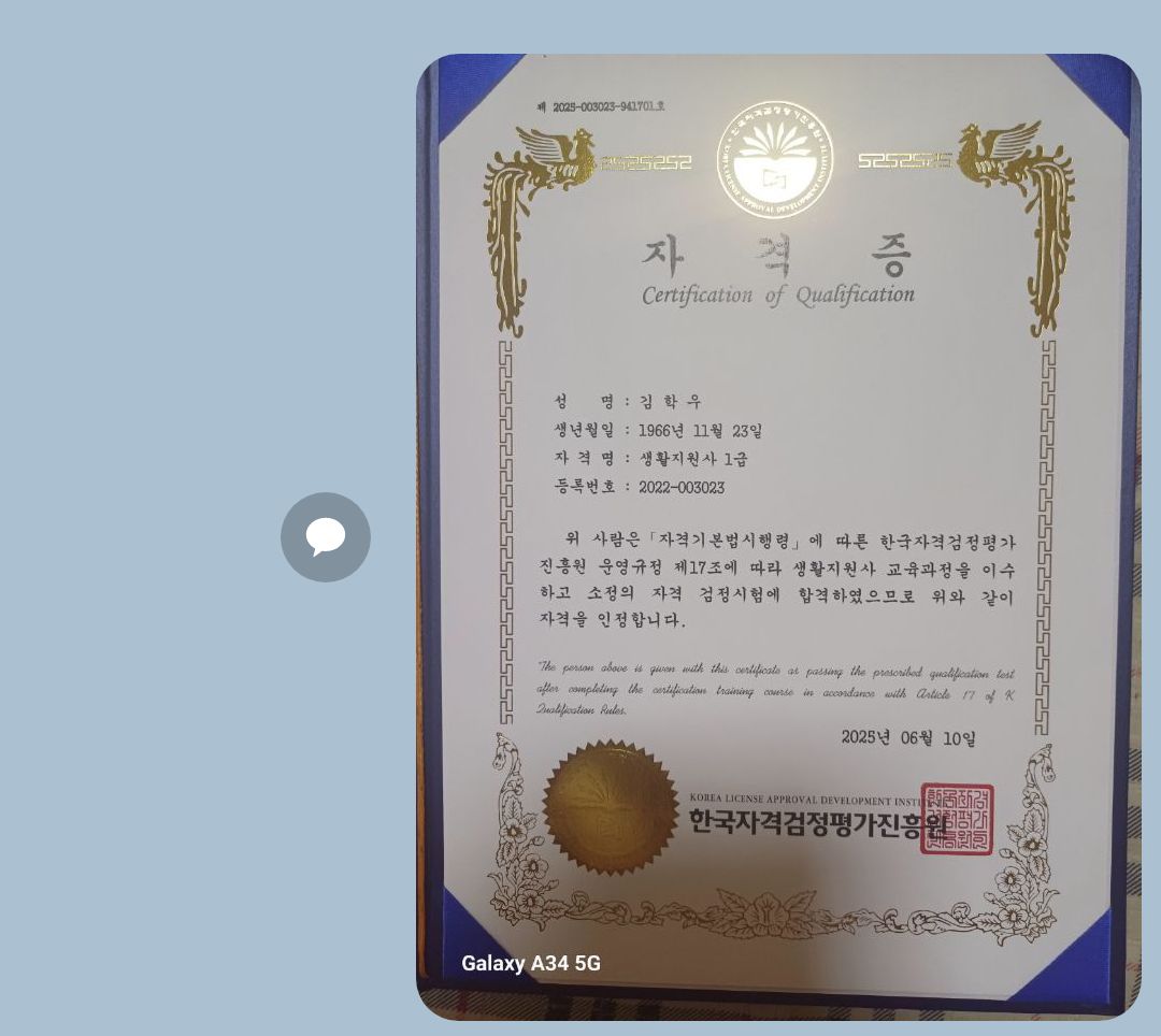 계속 미뤄왔던 노인운동지도사1급 드디어 내품에 받는 순간 왈칵 눈물이 났어요. 생각만 하다가~ 고민만 하다가~ 시간이 흘러가니 어디를 선택할지 고민도 엄청 되더라고요.그런데 우연히 한국자격증협회 합격 후기글들을 읽어보니 용기가 났어요. 알아듣기 쉬운 강의와 시험내용등 제가 할만하더라고요^^ 겁먹지마세요~~도전!!!! 할수있어요~ 너무너무 감사합니다.저에게 자신감을 주셔서~다른 자격증에도 도전!!!!!!!