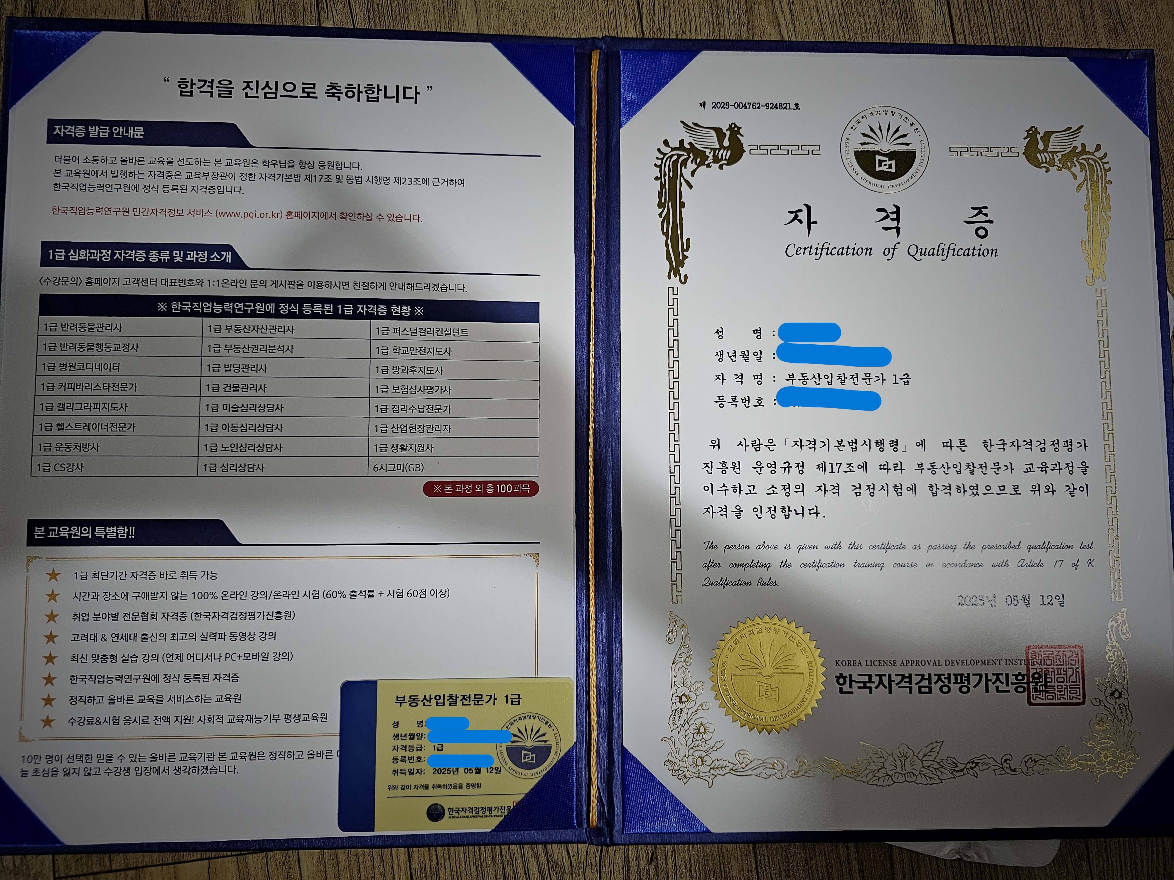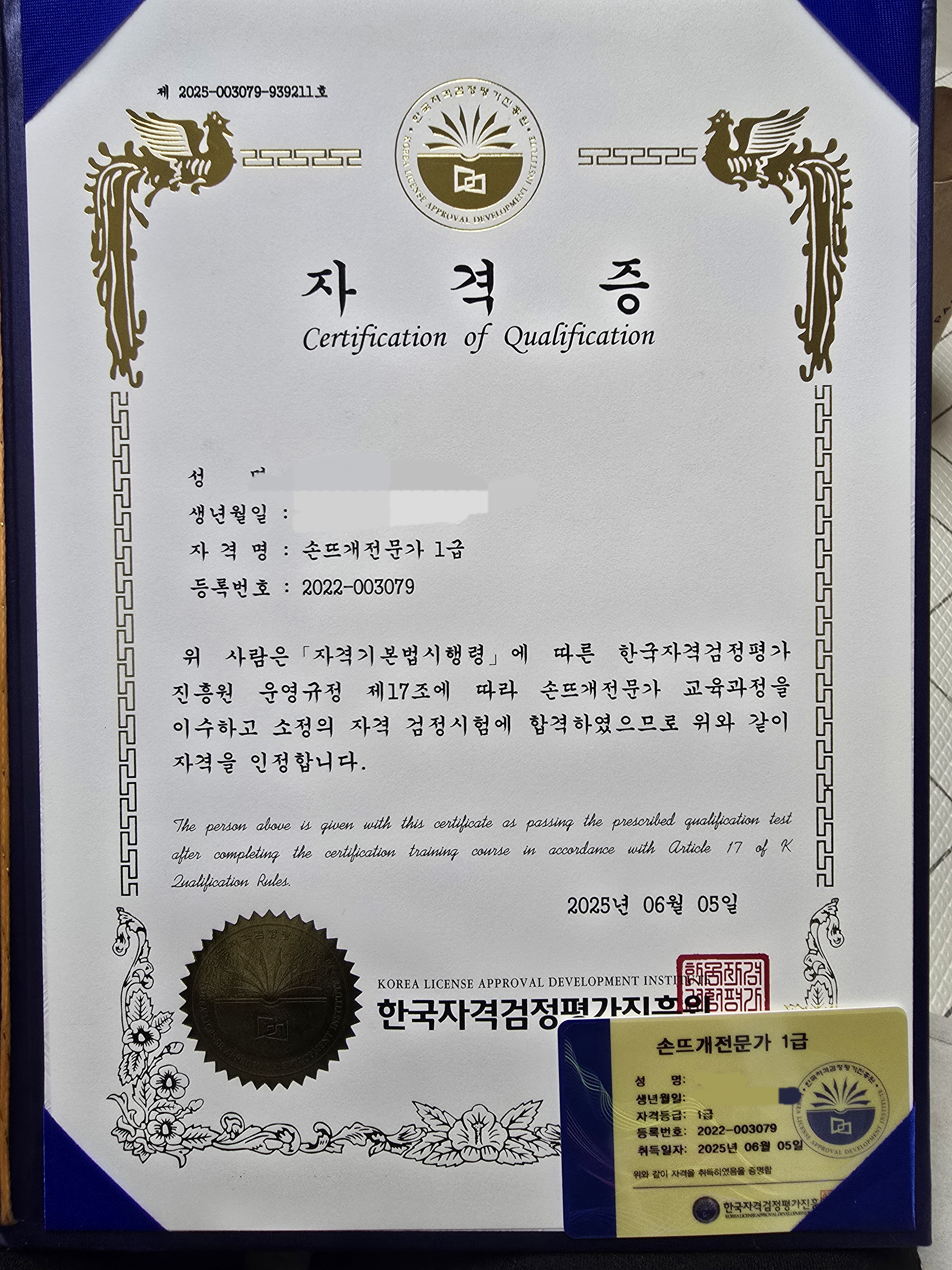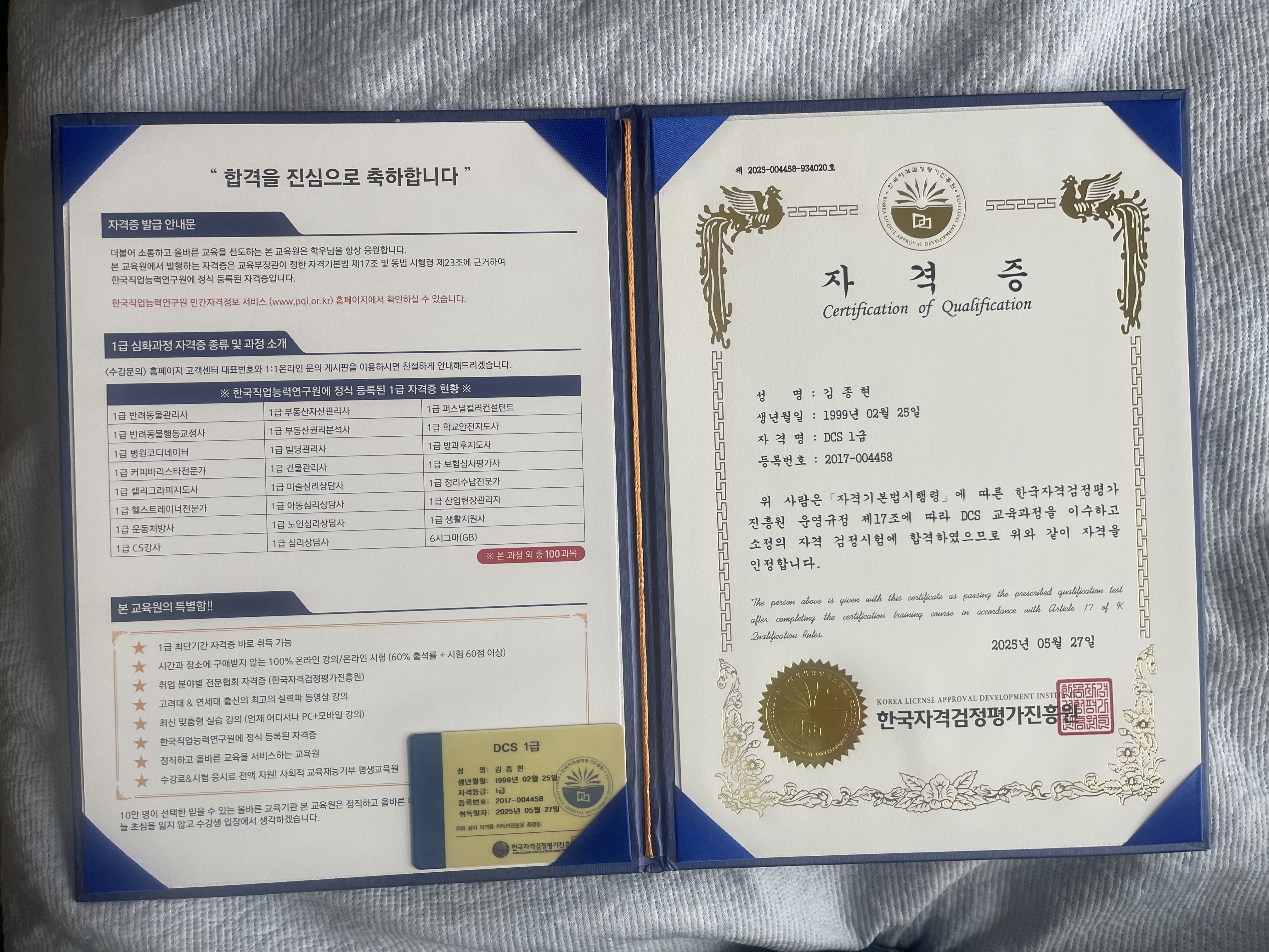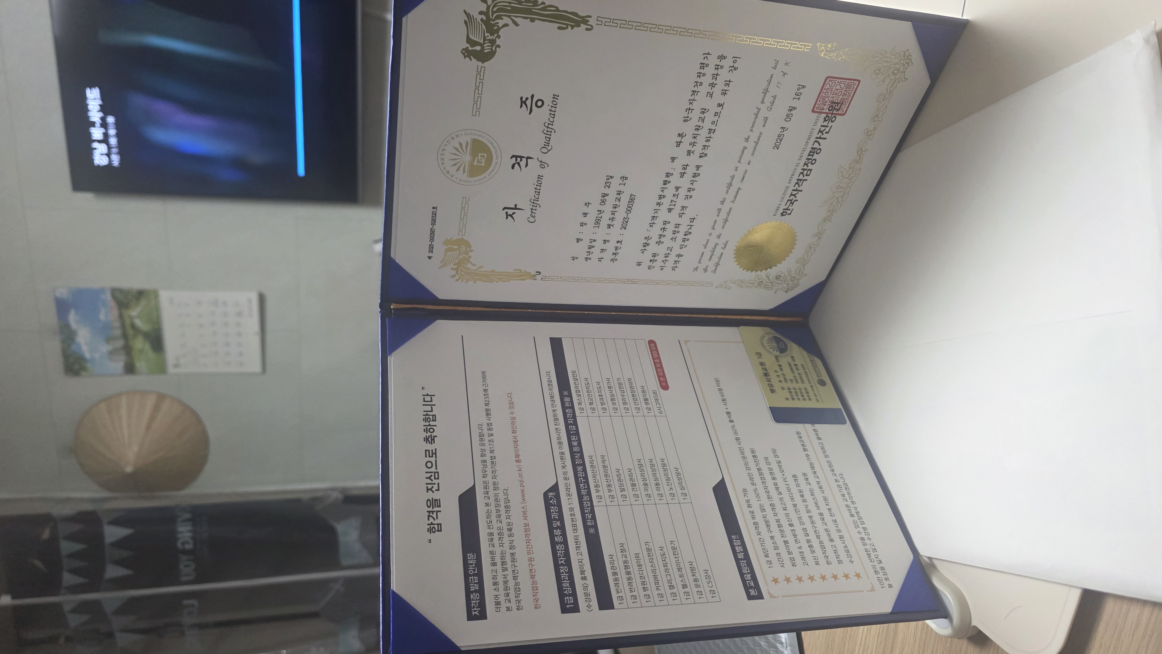 처음 시험은 떨어지고 2번째에 아슬아슬하게 붙었어요, 좀더 열심히 할껄 싶었습니다. 그래도 한걸음 나아갔다 생각하니 기분이 정말 좋아요! 다른 과목도 더 공부해서 자격증 따고 싶어졌어요, 다음엔 좀더 열심히 해서 좋은 점수 받고싶어요! 자격증 받는데 까지 기다리는 시간이 너무 떨렸어요, 상장식과 카드식이 동시에 있어 뭔가 더 있어보여요~