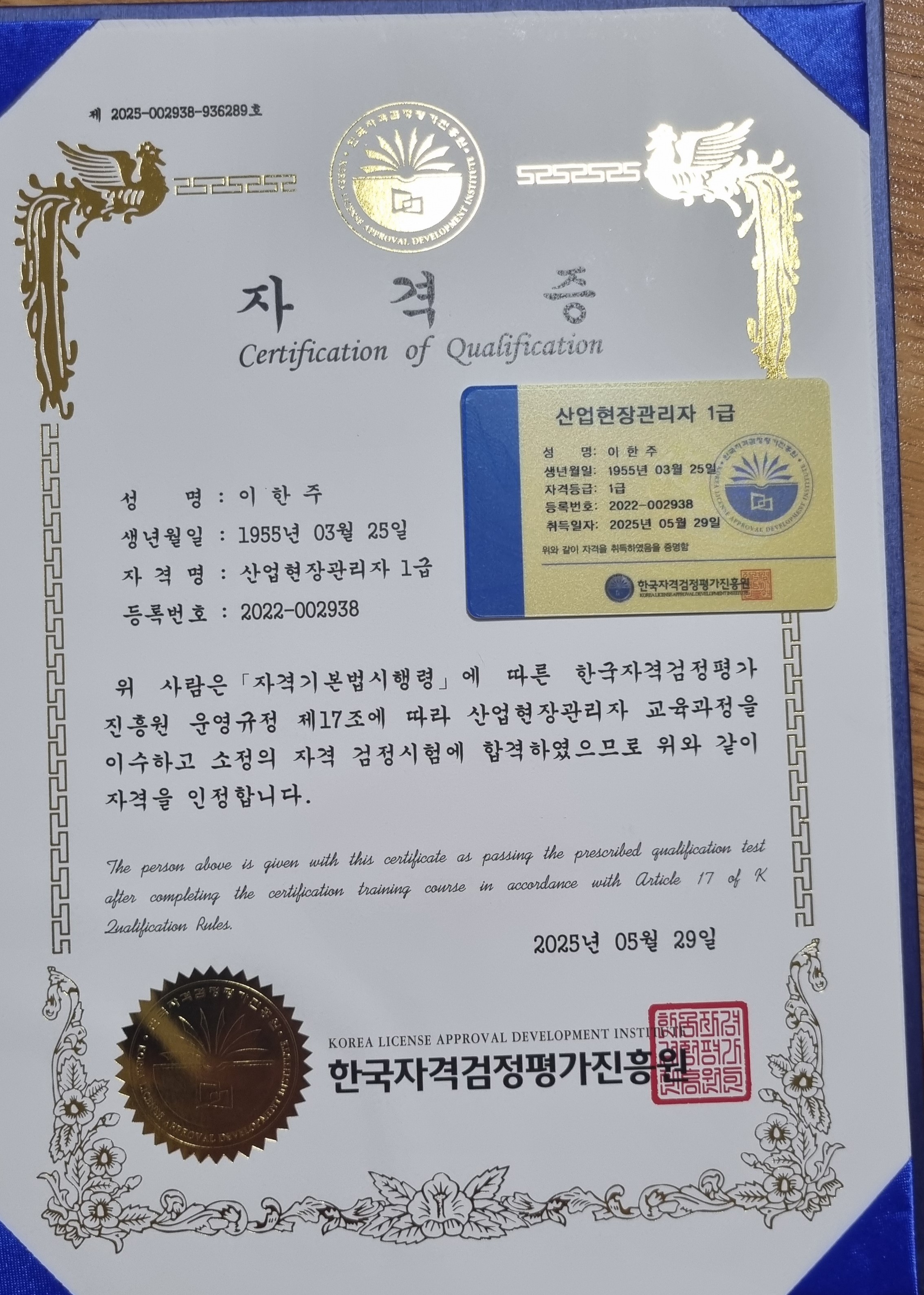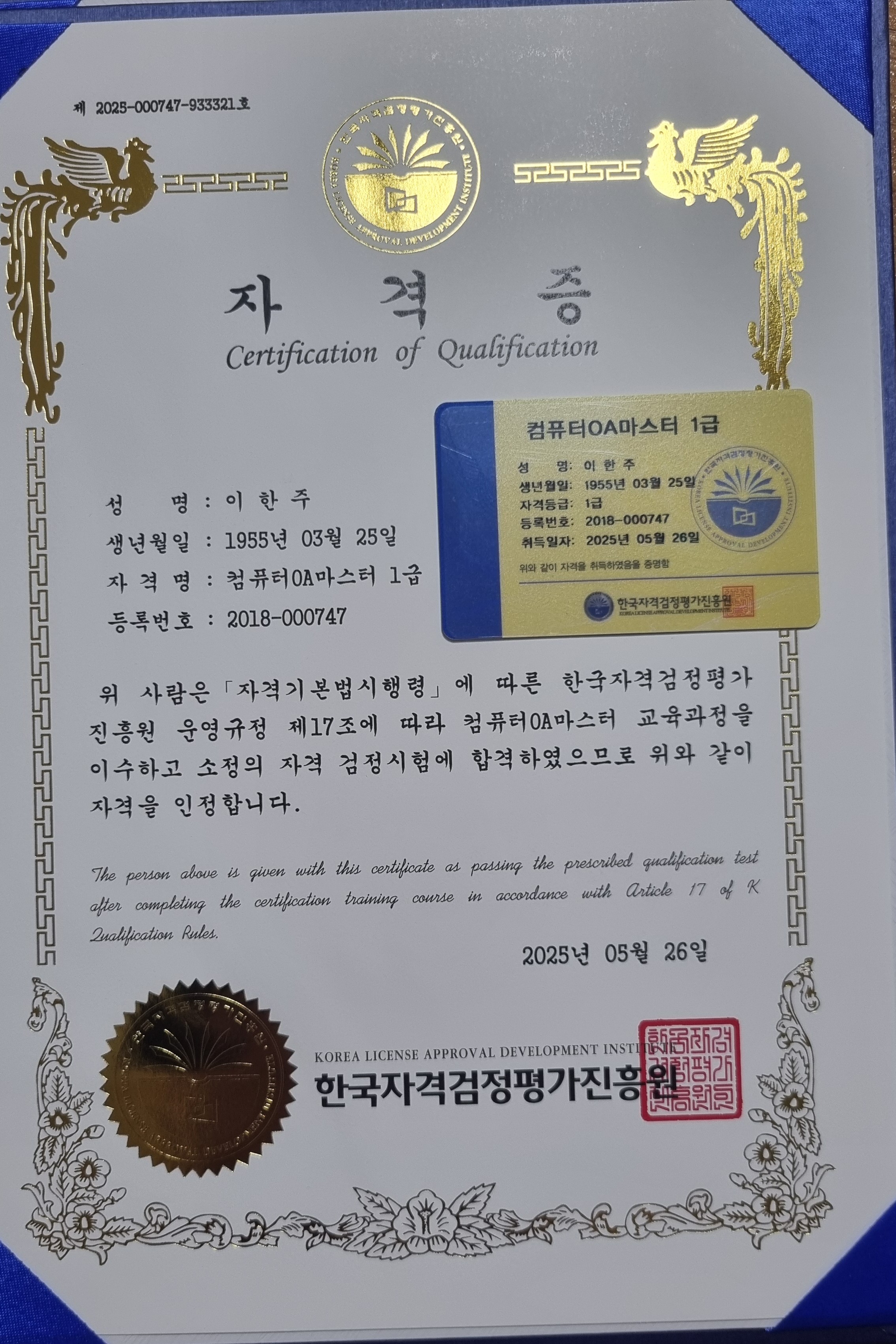 열심히 하니까 다 되네요.. 일 하면서 틈틈이 강의 듣고 했는데 전혀 어렵지 않네요. 제가 지금까지 획득한 자격증은 블록체인, 컴퓨터OA마스터, 파이썬, 산업현장관리자, 안전지도사, 학교안전지도사, 마지막으로 엑셀전문가는 시험보고 자격증 신청 해 놓고 있습니다. 여러분 누구나 다 할수있으니가 열심히 힘내세요.. 그리고 강의해 주시는 교수님들 감사합니다..