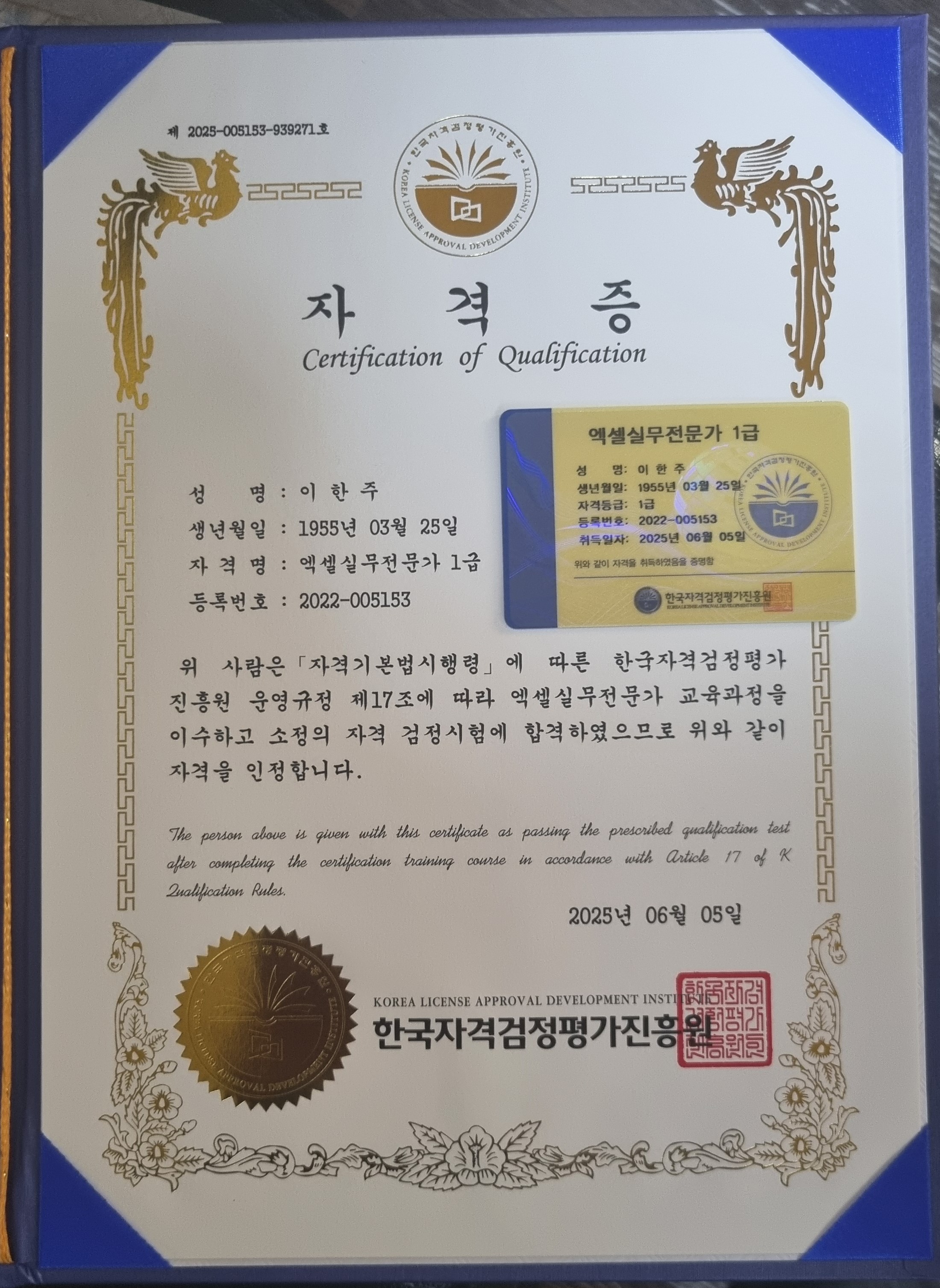 오늘 엑셀전문가 자격증을 7번째로 받았습니다. 많은 시간을 들이지 않았지만 강의 내용이 자세하고 알기쉽게 해 주셔서 나같이 많이배우지 못한 사람도 쉽게 도전해 볼수있었습니다. 처음엔 내가 할수 있을까 하는 마음이었는데.. 막상 시작하고 보니까 어느듯 7번째의 보람을 느껴 봅니다.. 다른 분들도 힘내서 해 보시길 권유드리면서 모든 교수님들께 감사한 마음으로 작성해 봤습니다..