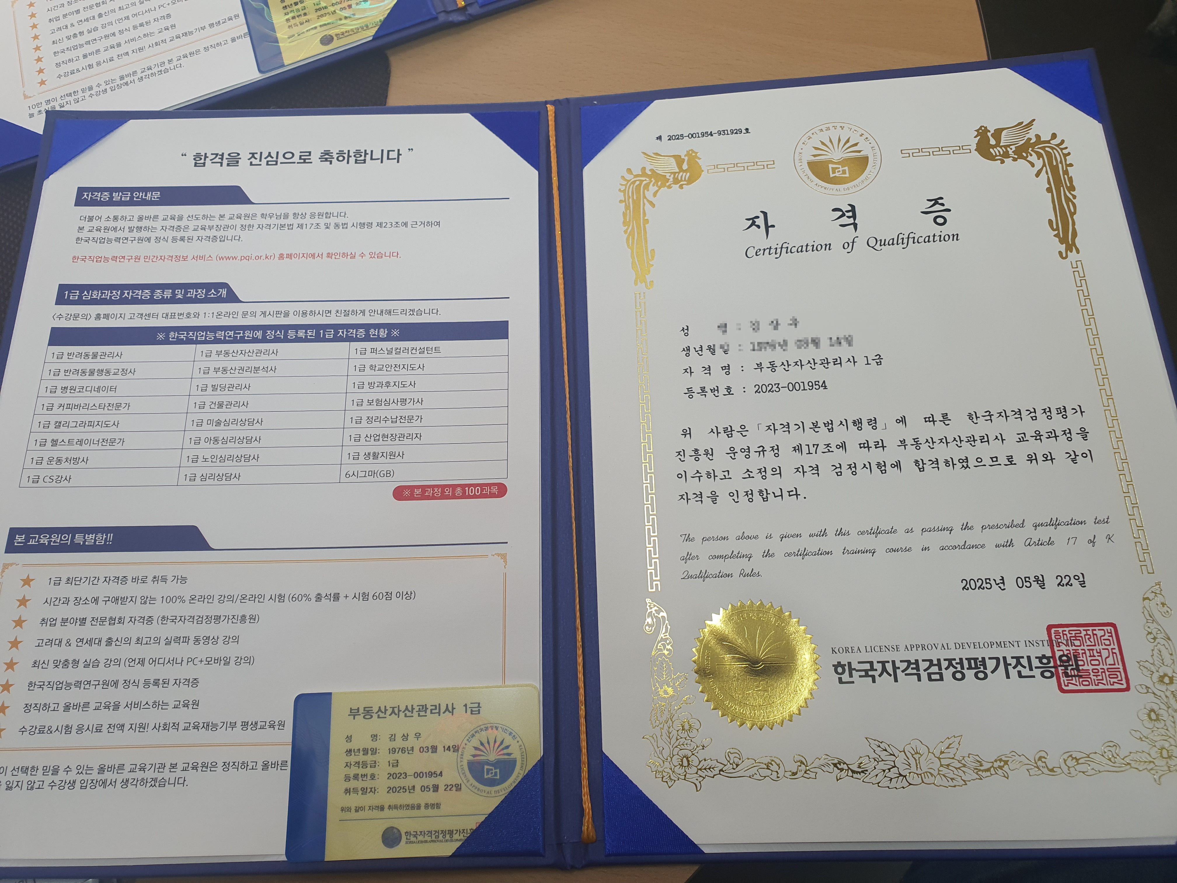 업무적으로도 그렇고 평소에 관심이 많은 자산관리쪽 이라 너무 기쁩니다. 재태크 쪽도 관심이 많고 부동산에도 관심이 많았는데, "나도 할수있다" 라는 자신감을 갖고 열심히 동영상강의를 보며 주경야독 하며 틈틈히 공부한 결과 좋은 결과가 있었습니다. 여러학우님들도 도전해 보세요.. 시간되면은 다른 과목에도 도전해 보고 싶습니다. 평생학습 평생교육입니다.