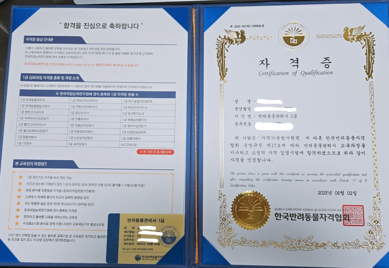 공부만 열심히 한다면 누구든 합격 할 수 있을 정도로 선생님이 설명을 잘 해주시고 관심 분야여서 더욱 열심히 들을 수 있었습니다!! 관심분야이신분들, 반려동물을 키우고 계신 분들 모두 수업을 듣고 간식을 만들 수 있을 것 같습니다! 좋은 강의 감사합니다.