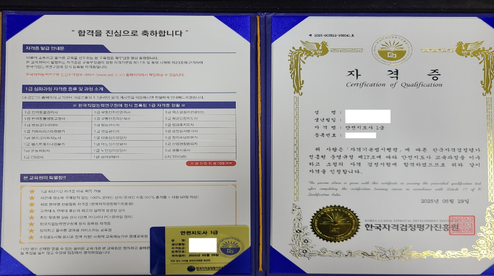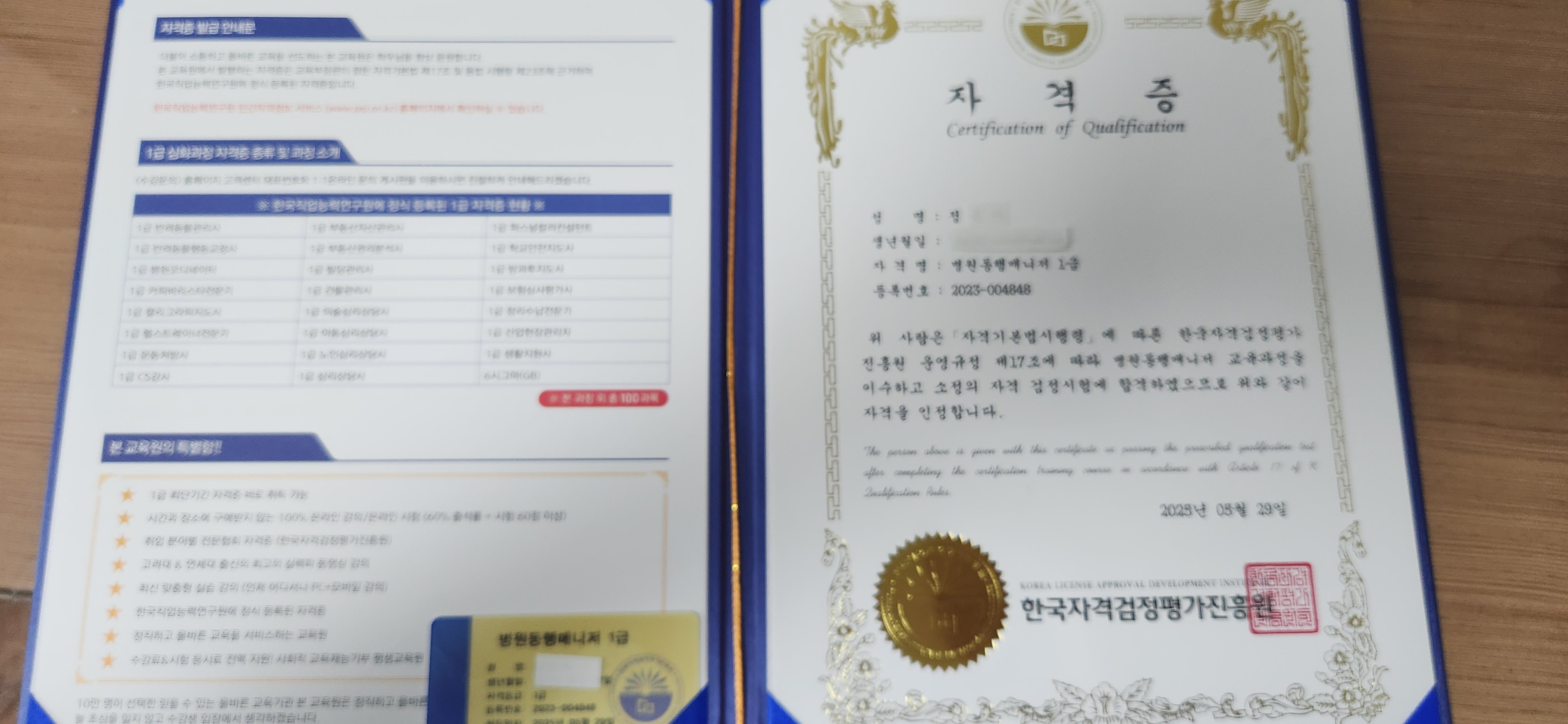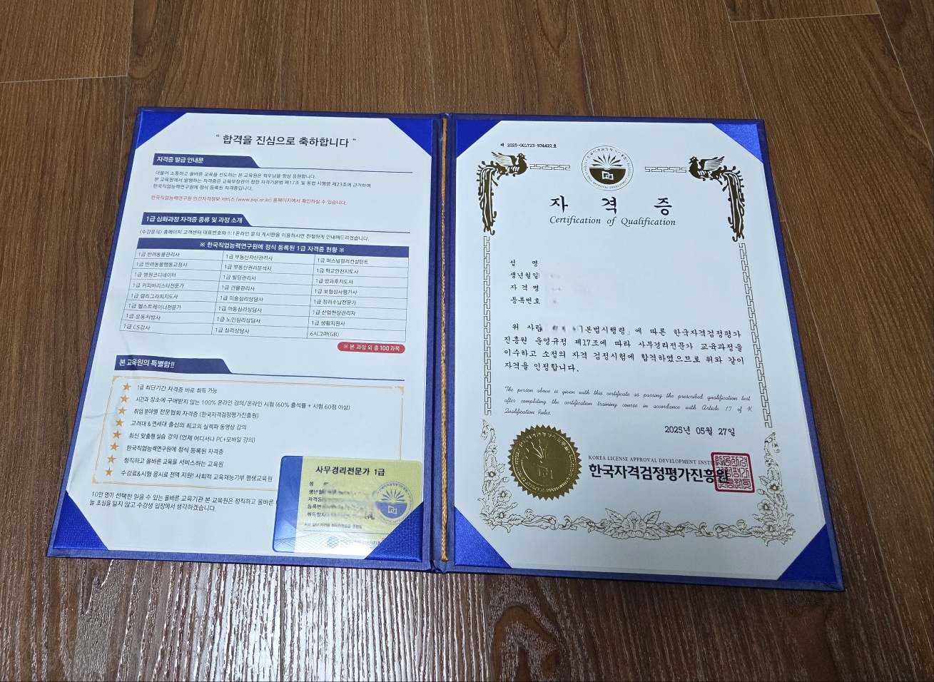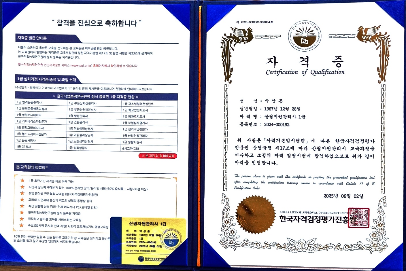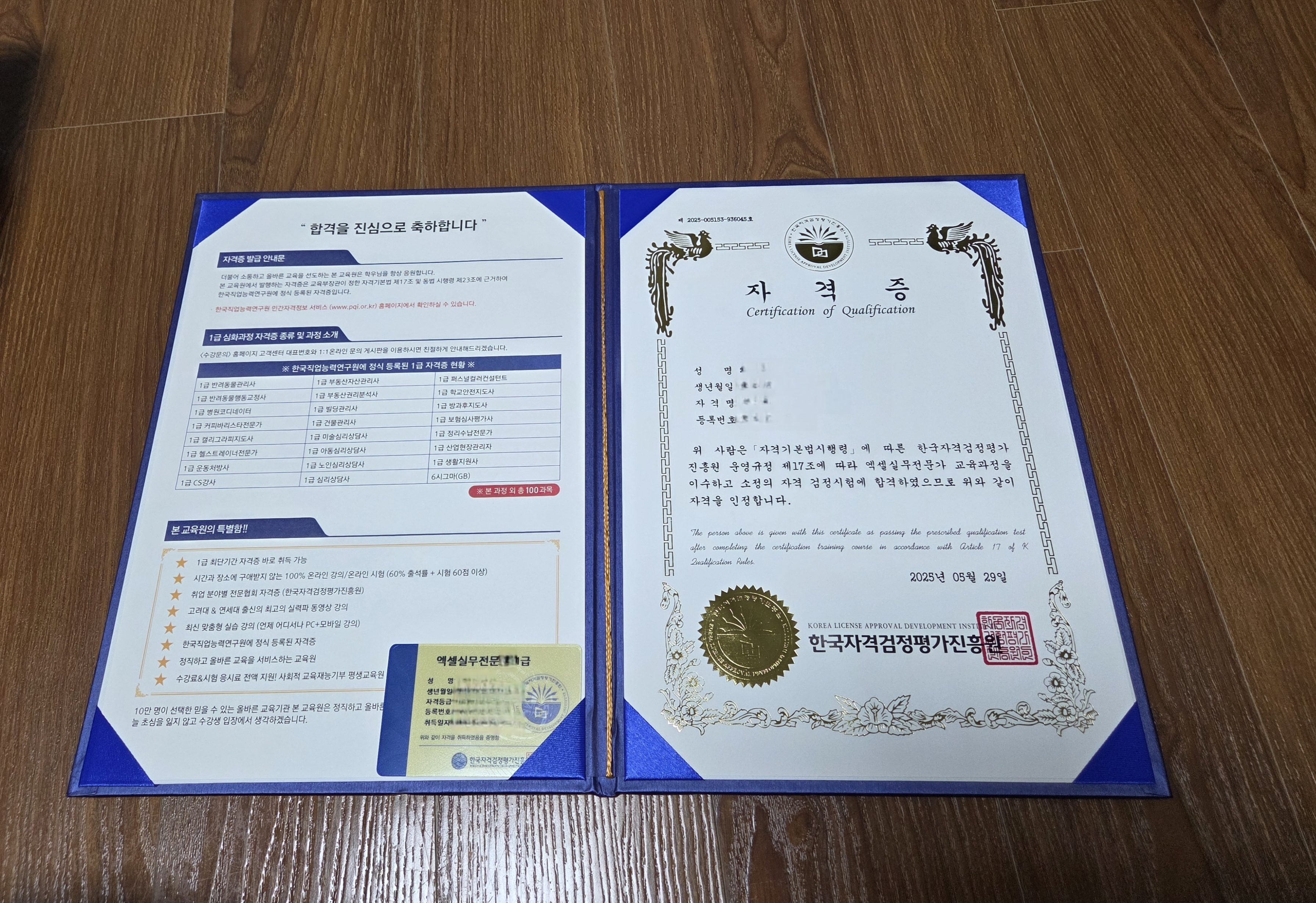 직장생활하면서 필요한 교육을 알아보고 있었습니다. 그러다가 한국자격증협회를 알게되었고, 교육도 듣고 자격증까지 취득할수 있다는걸 알고 바로 수강신청하여 시작하여 몇일전 합격하였습니다. 일단 온라인강의라서 편하게 교육을 들을수 있어서 좋았으며, 강의내용도 알차고 좋았습니다. 수강후 자격증을 취득하여 매우 기쁘고 대른 교육도 수강하고 싶습니다.