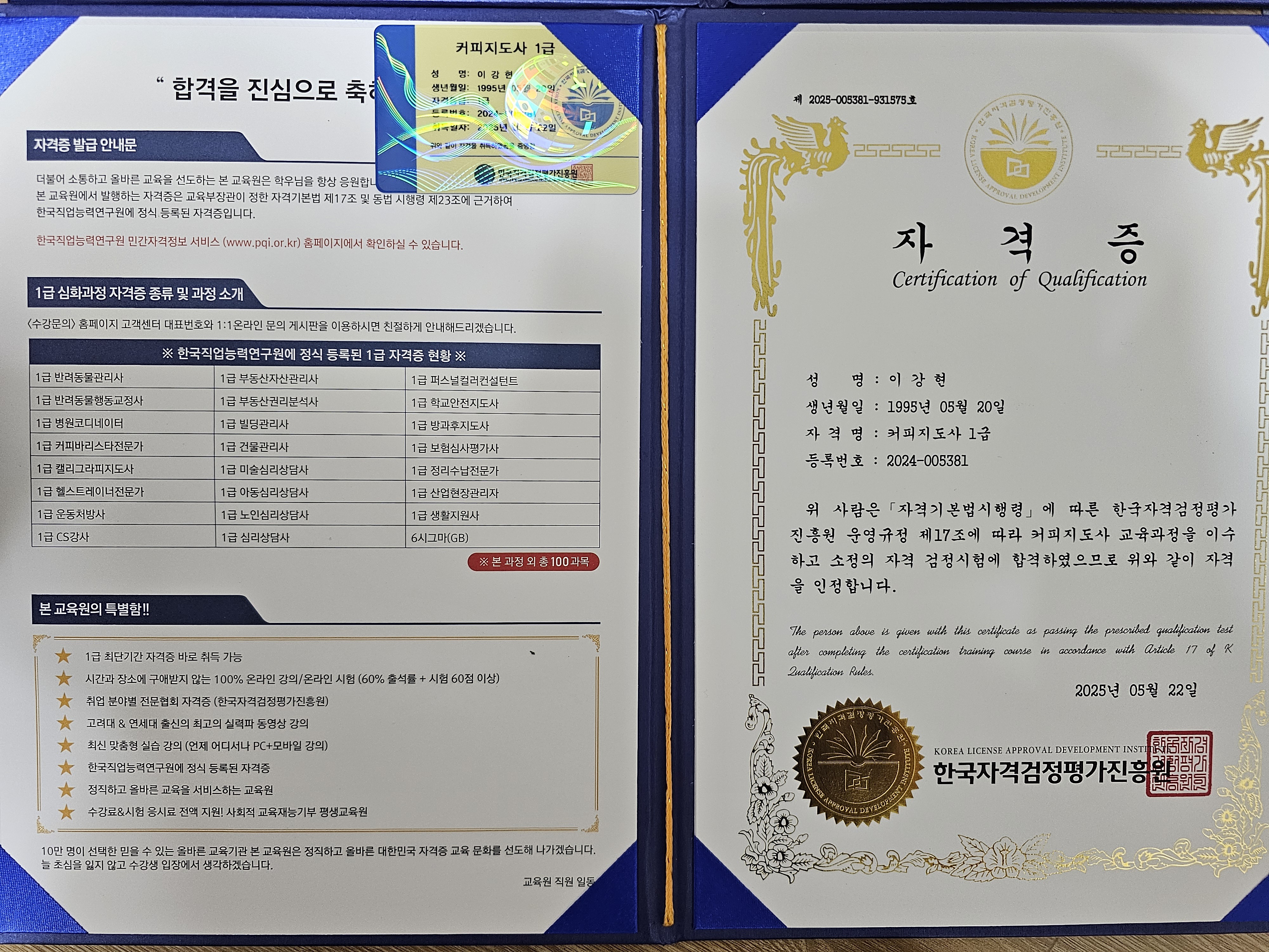 일하면서 하기 좋고 무료라는게 너무 좋아요 커피 자격증 필요했는데 너무 좋네요 다른커피종류 있고 너무 좋아요 ㅎㅎ