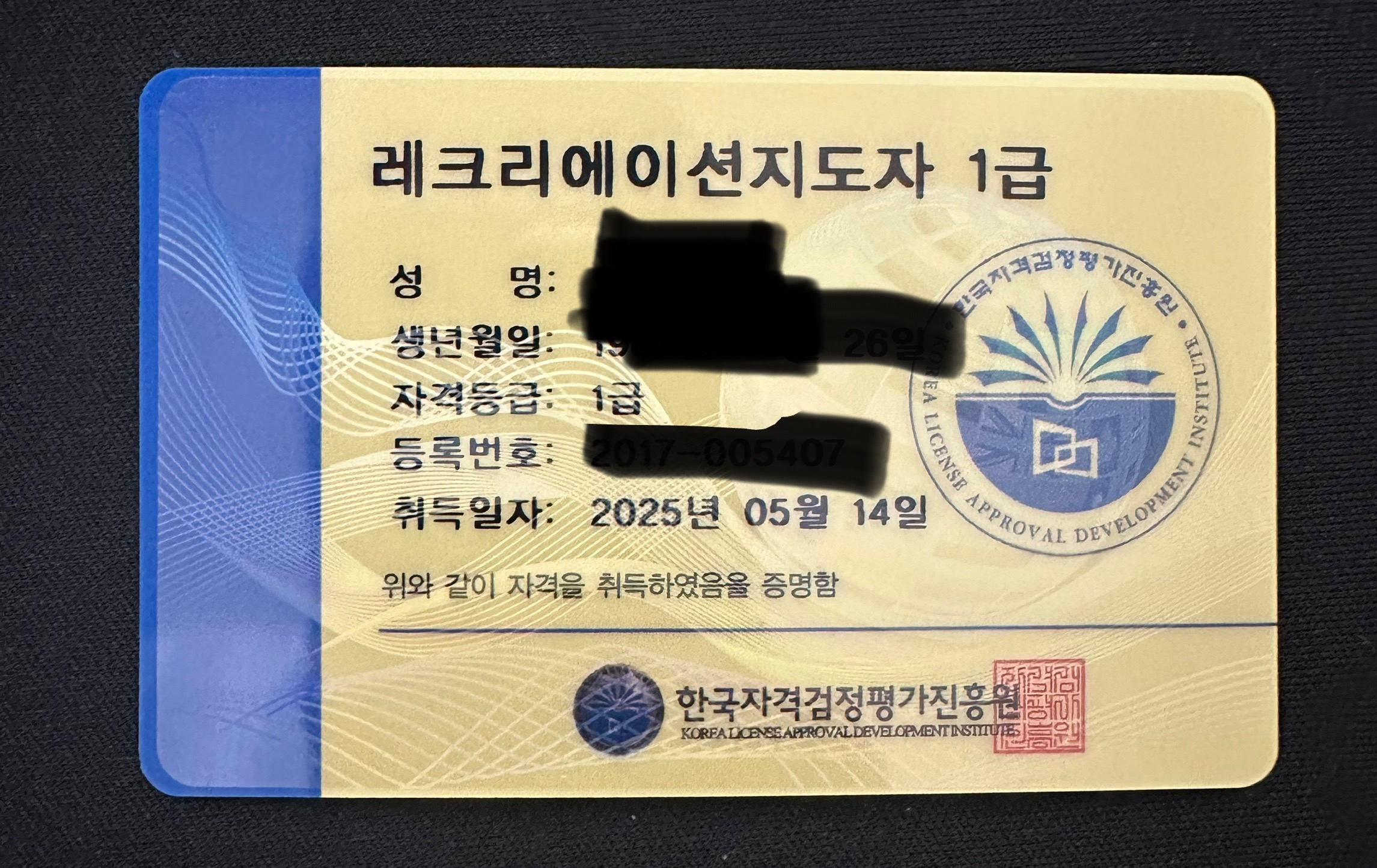 평소 레크리에이션에 관심이 많았꼬, 언젠가 저 자격을 꼭 따고 싶다 하면서도 취득하지 않고 있던 자격증인데, 이번에 이렇게 취득하게 되어서 너무 기쁩니다! 어렸을 때부터 막연하게 꿈꿔왔지만 이젠 꿈에 한 발짝 더 다가서니 너무너무 설레입니다. 진행방법과 부족한 부분을 많이 느끼고 깨닫고 더욱 다듬어 레크리에이션 강사로 도전 하겠습니다!