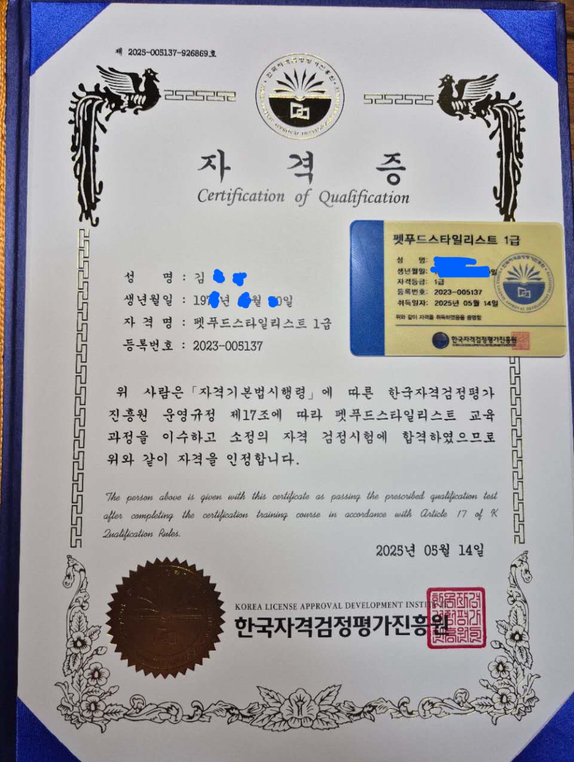 오랜 해외생활에 자격증이란걸 알겠어요 처음엔 내게 자격증이란 상상도 못했습니다. 두려움과반신반의마음 하지만 열심히 강의듣고하다보니 어느새 저도 펫푸드스타일리스트1급이라는 자격증이 생겼습니다. 반려견 두마리 키우는데 도움이될것같아요 반려과정에 또다른 강의 들어요 자신감이 생겼어요~ 고맙습니다, 한국자격증협회~
