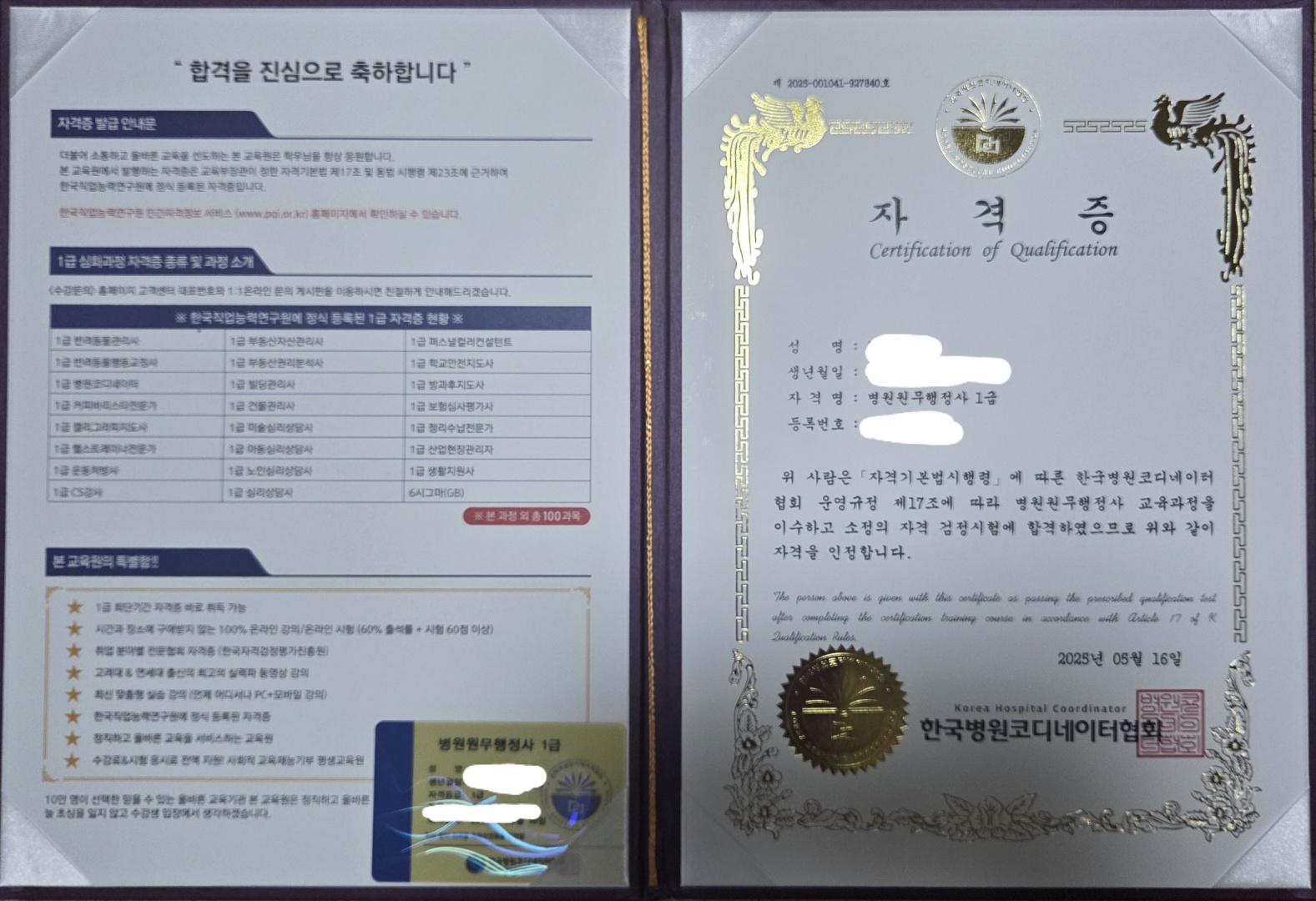 취업 준비 중에 어떤 자격증을 따야 취업이 잘 될까, 어떤 일을 해야 할까 생각해 보고 찾아보다가 한국자격증 협회가 떠있길래 들어와서 강의가 무료인 걸 보고 평소 조금 관심이 갔던 병원 원무행정사에 도전해 봤는데 바로 합격했어요 자격증 강의가 무료이고 시험 응시료도 없어서 조금 의심이 돼서 민간 자격정보 서비스 사이트에 검색해 봤더니 한국자격증 협회가 안 뜨더라고요 그래서 문의전화로 여쭤봤더니 한국자격증 협회는 자격증 관련된 일과 교육을 맡고 있고, 자격증을 발급해 주는 건 한국 코디네이터 협회라고요! 그래서 다시 확인해 봤더니 바로 뜨길래 의심을 접고 자격증 발급 신청을 했어요 정말 친절하게 설명해 주셨어요!! 저는 병원 코디네이터 자격증도 도전해 볼 생각입니다 감사합니다!!