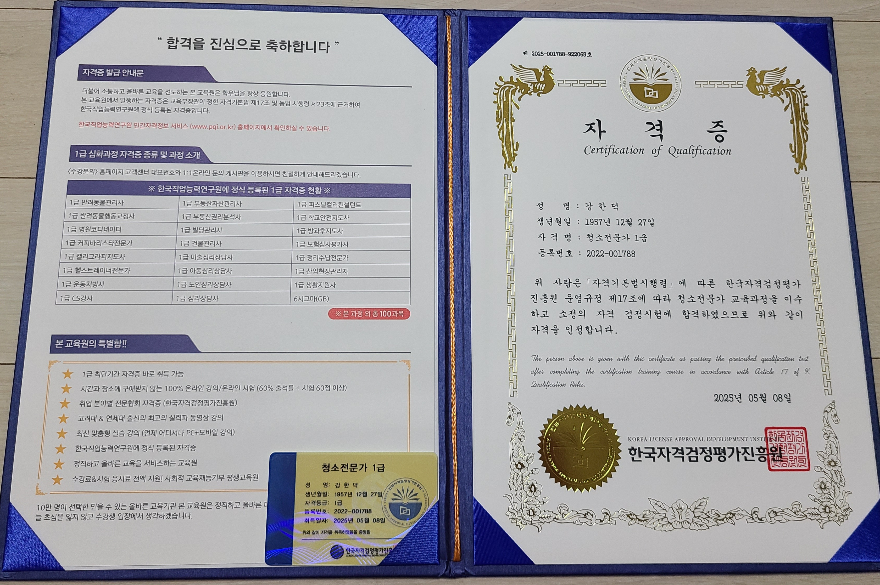 저는 여러해 청소업에 종사하는 사람입니다. 현장에서 일어나는 작업은 완벽하게 처리하고 있지만 새로 들어오는 사람에게 정확하고 체계적인 교육을 할 수 없다는 것이 너무 짐이되어 고민하던중 한국자격중협회 강의 소개받아 1강 부터 25강까지 듣고 반복해서 들으면서 메모하고 현장에 적용도 하면서 이렇게 편리한 교육을 만든 관계님들께 너무 감사 했습니다. 현장에서 내가 하던 작업도 문제는 없지만 강의를 통해 학습한 방법을 적용해서 더 높은 품질의 작업을 해보겠습니다. 2주의 짧은 시간에 강의를 통해 자격증도 습득할 수 있어 너무 감사합니다. 제게 필요한 5~6종의 자격증도 도전해 보고 싶고 직원 동료들에게도 적극권하고 싶습니다. 감사합니다.