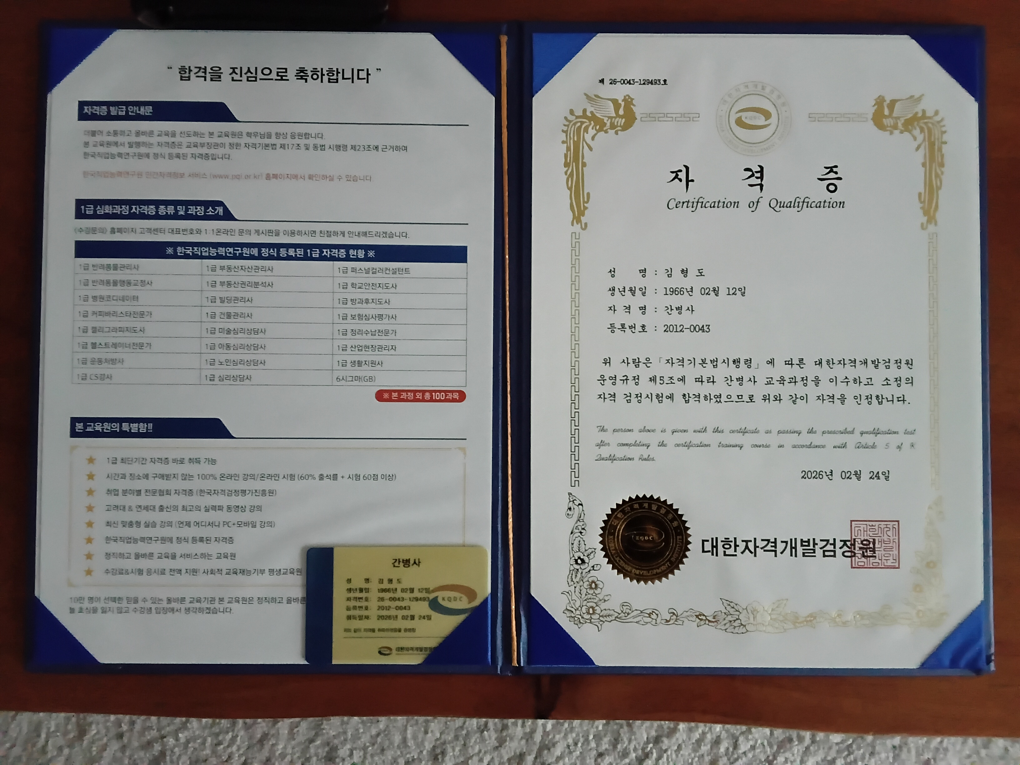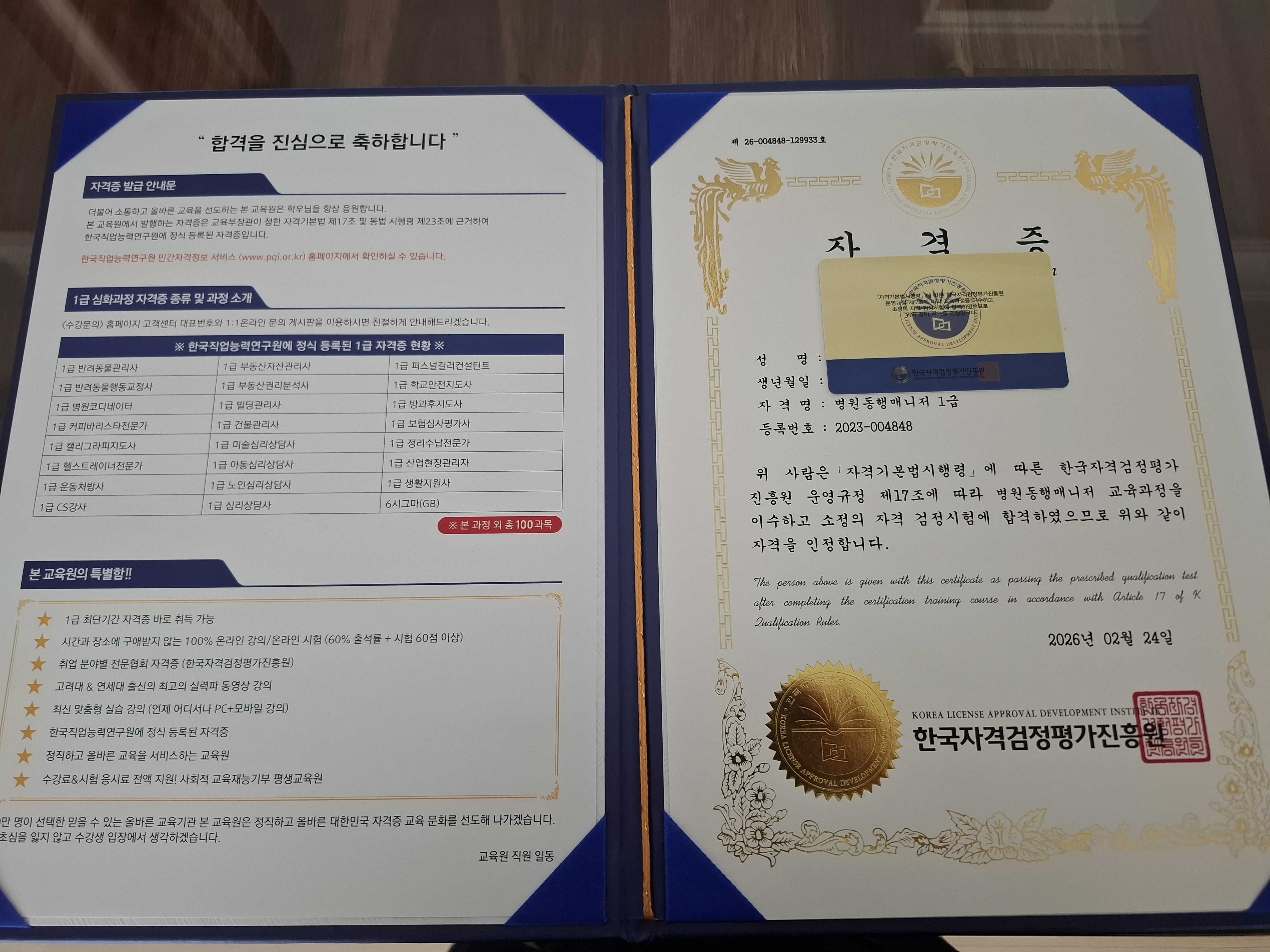 가족중 뇌경색으로 입원치료를 받고 있는데 교육을 수료하여 당당히 합격해서 자격증을 가지고 직접 케어할수 있어서 마음이 든든 합니다.
