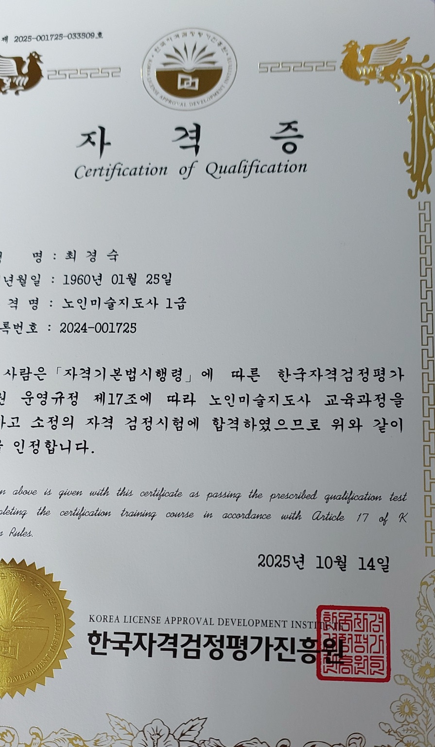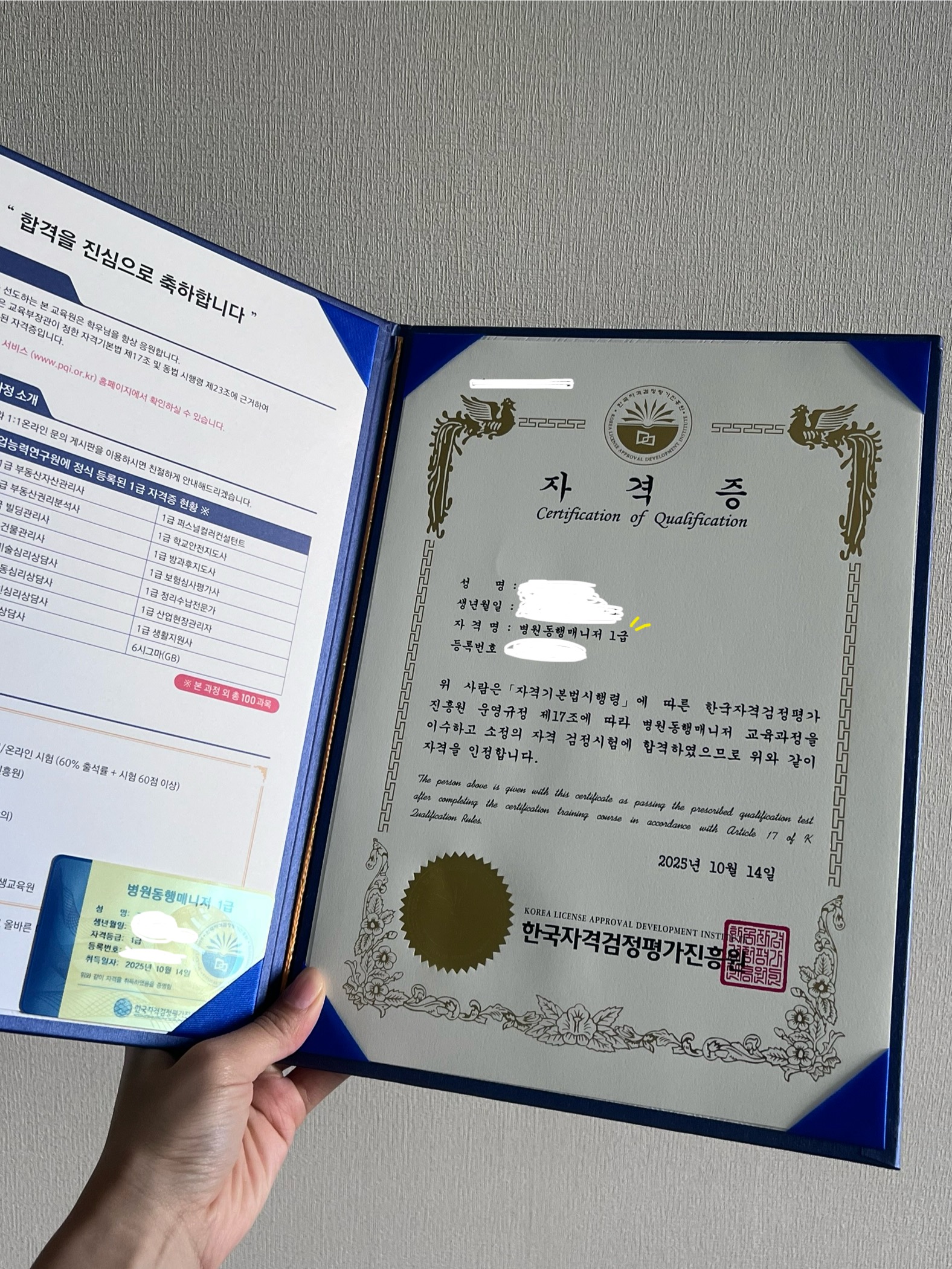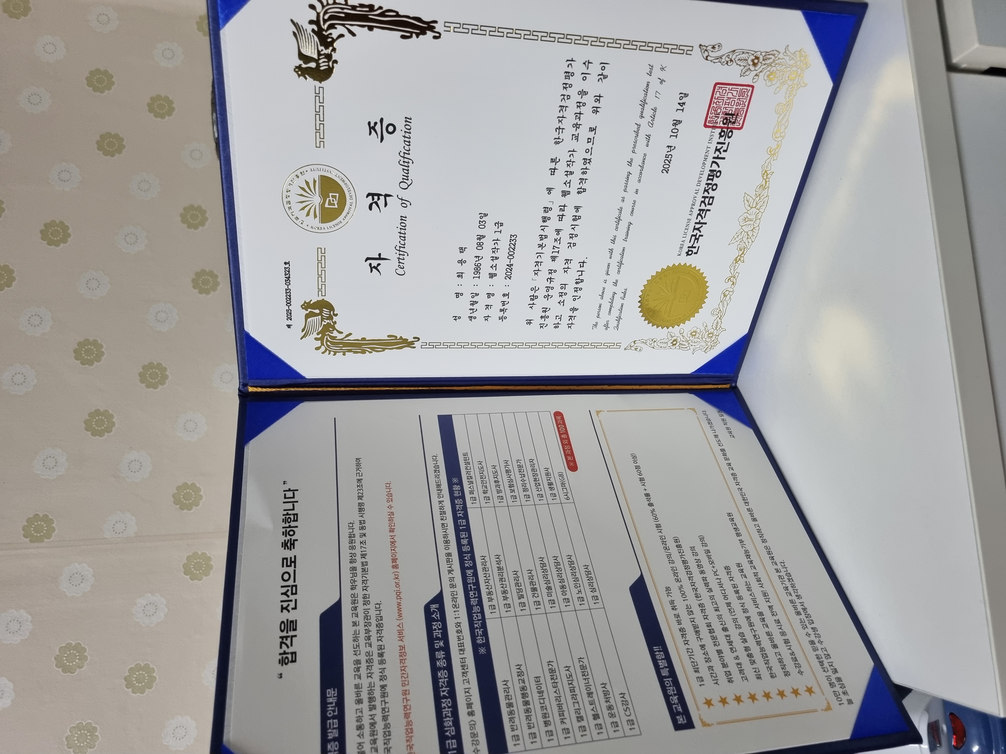 어느 날 문득 사이트 서치하던 중에 한국자격증협회의 사이트를 알게 되었읍니다. 많은 자격증들 중에 병원동행매니저의 자격증이 앞으로 보람되고, 유익한 일이라 생각되어 유능한 교수님의 강의도 듣고, 기출문제도 풀면서 준비하고 자격증에 응시하게 되었습니다. 많은 응원 부탁드립니다. 감사합니다.