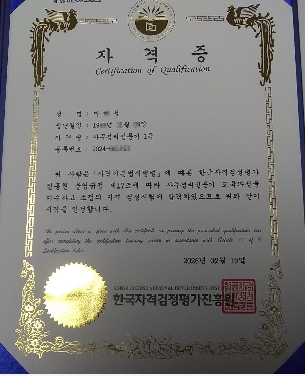 아파트 관리사무소에서 경리업무를 누구보다 열심히, 성실히 근무했다고 자부했지만 관련 전공자격증같은 내세울만한 게 없어서 알게 모르게 여러가지 불이익을 받았는데 늦게나마 사무경리 자격증을 취득하게 되어서 기쁩니다. 제 스스로에게도 자신감이 생깁니다.