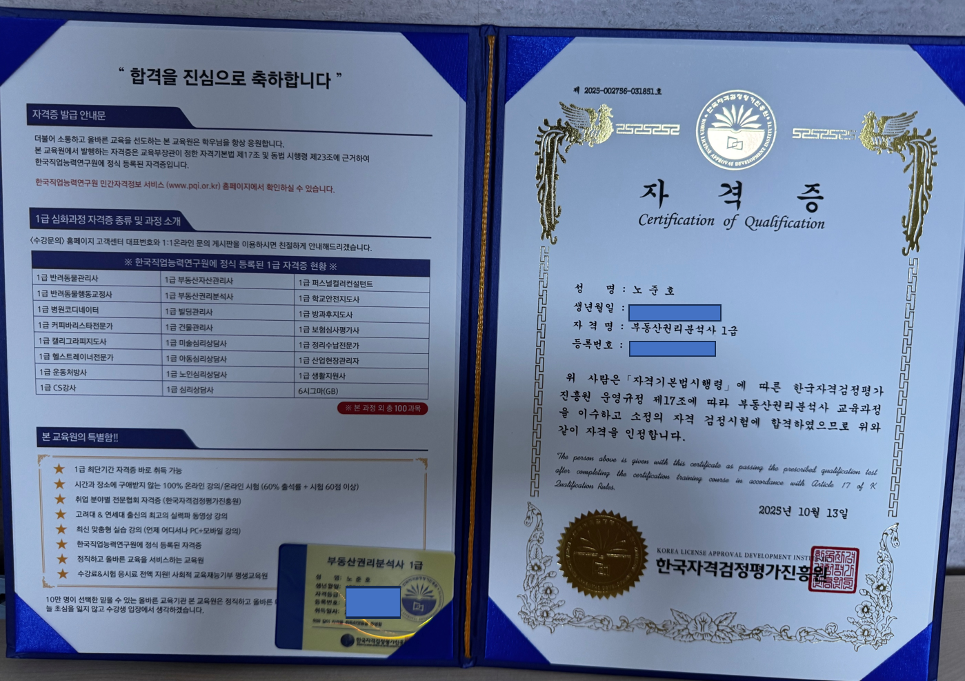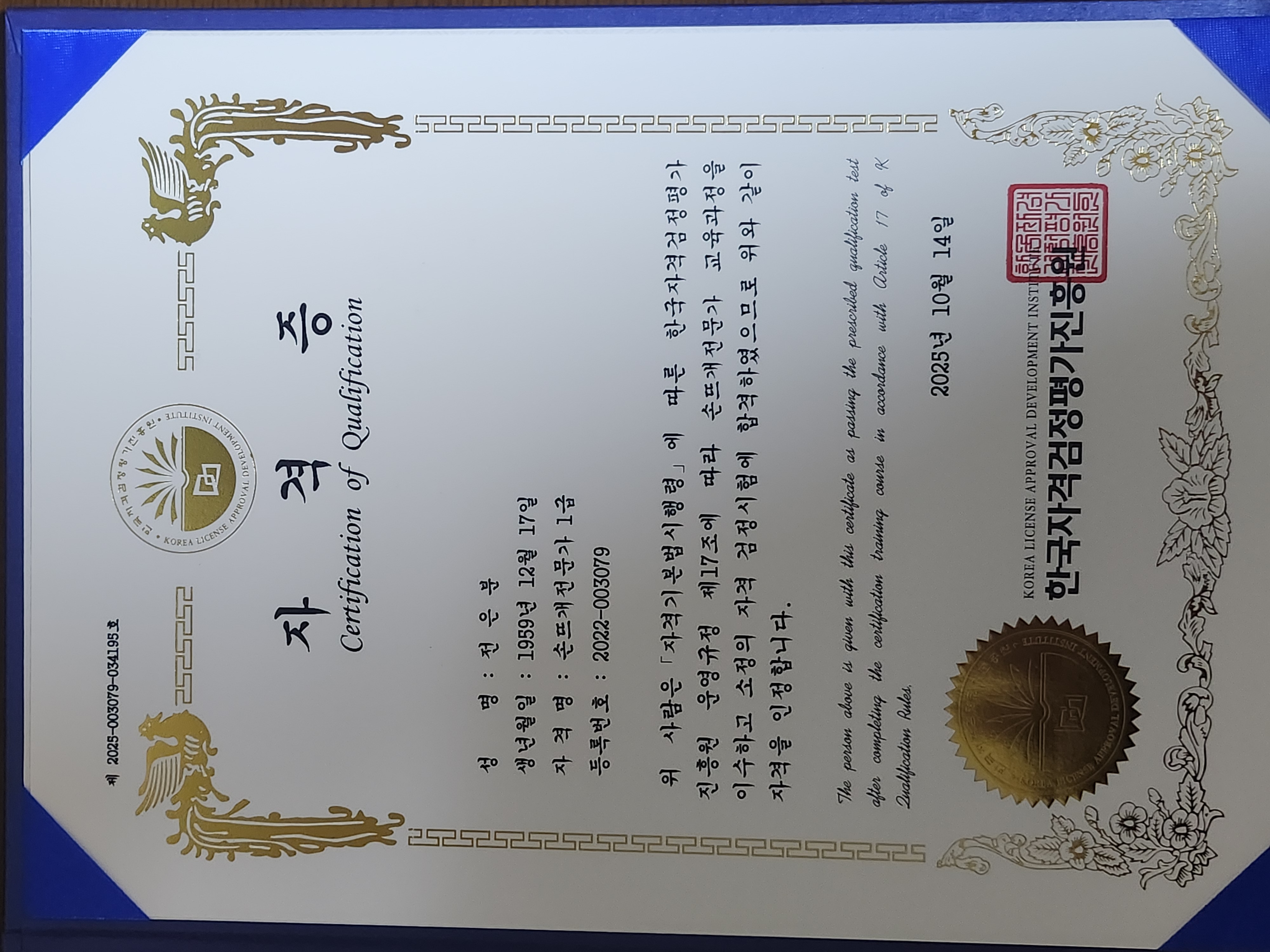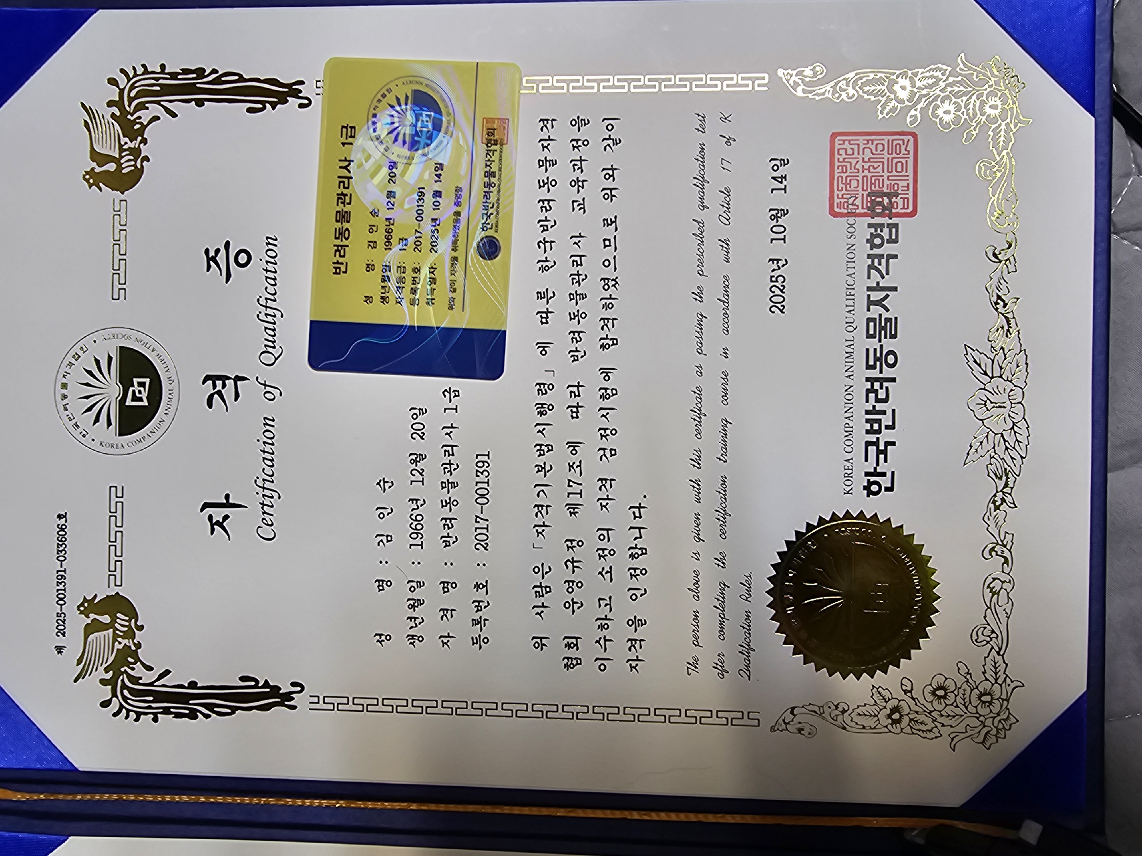 항상 제 곁에는 반려견이 있는지 어언 40년이 되었네요. 지금은 동물 생산업,판매업 준비중이라 합격을 해서 자격증을 오늘 받았어요. 3일만에 자격증 받았어요. 무지 빠른게 도착했고 강의 내용이 쉽고 이해하기 편한 강의라서 이해가 쉬웠나봐요. 그래서 한번에 합격했어요. 나이가 많다보니 자격증 다 받고 싶어도 이 나이에 취직도 못하는 나이라 진즉 알았더라면 더 좋았을걸 하네요