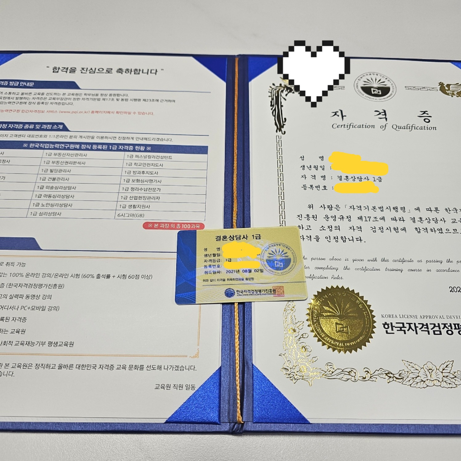 어려서부터 공부랑은 거리가 멀었던 제가 이 나이 먹고 자격증 공부를 한 다는 것 자체가 큰 도전이였어요. 그런데 주위에서도 많이 취득했다는 이야기를 듣고 자신감을 얻어 시작하게 되었죠. 그리고 결국은 제 손에 들어온 자격증을 보며 눈물이 찔끔 나기도 했답니다. 늙어서도 하면 된다는 마음가짐을 가질 수 있게 해준 고마운 한국자격검정평가진흥원입니다.