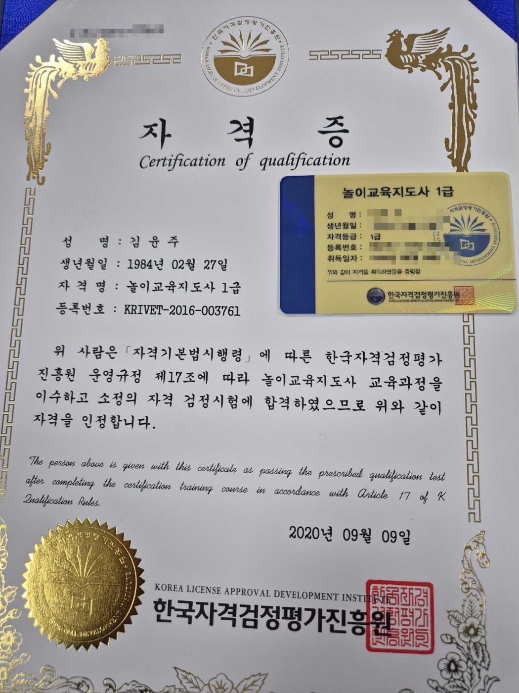 3주 만에 원하던 놀이교육지도사1급 자격증 취득했어요~!!!