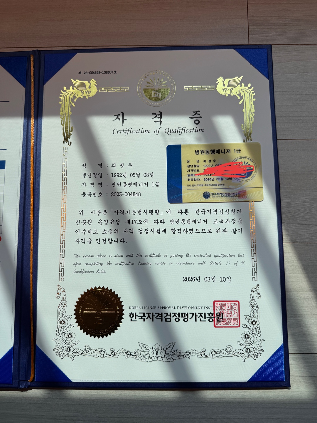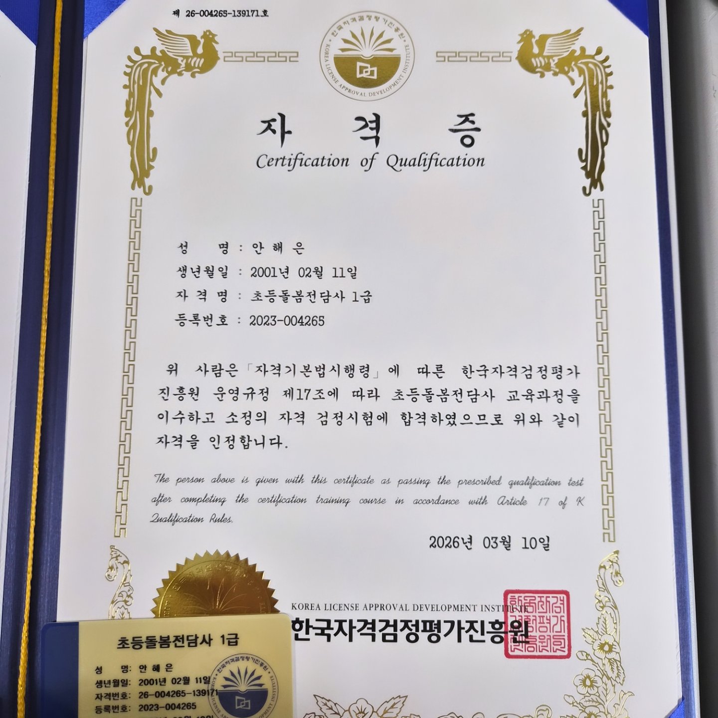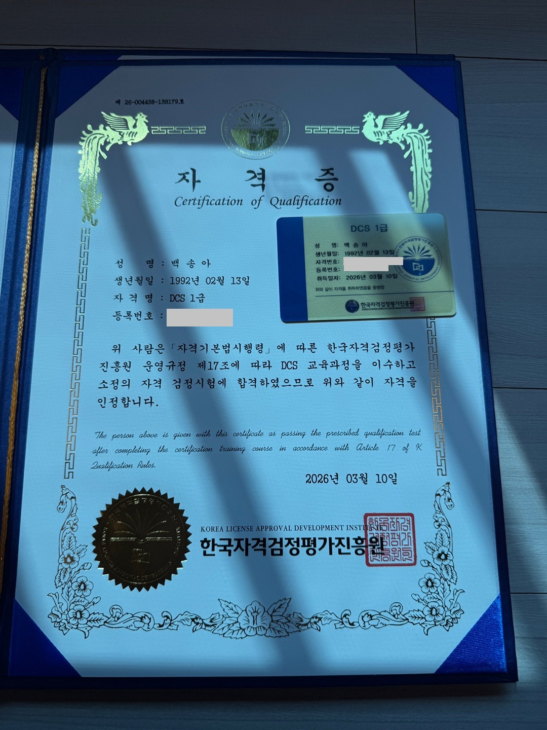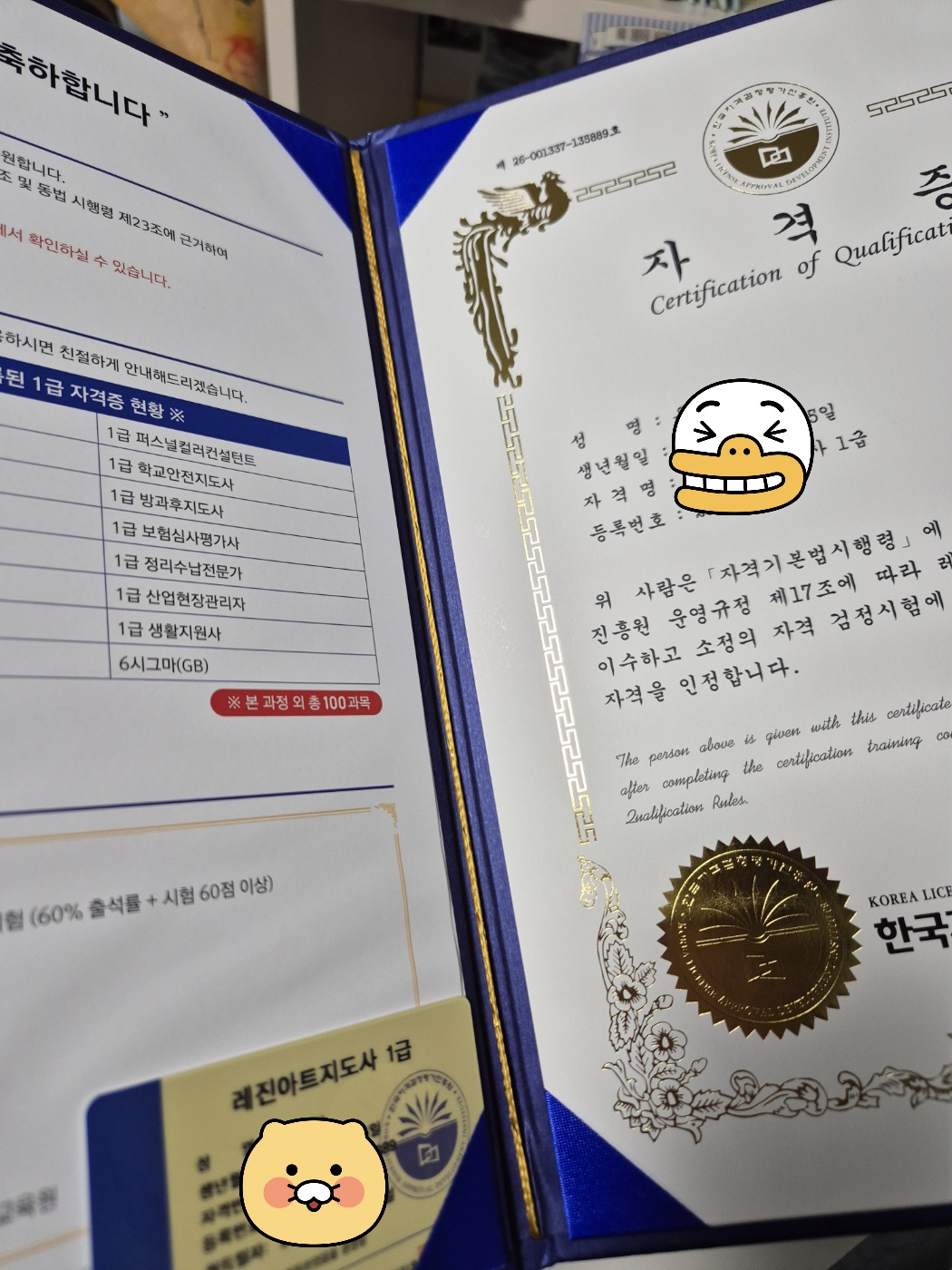 처음으로 받은 자격증~ 너~무 좋아요~><