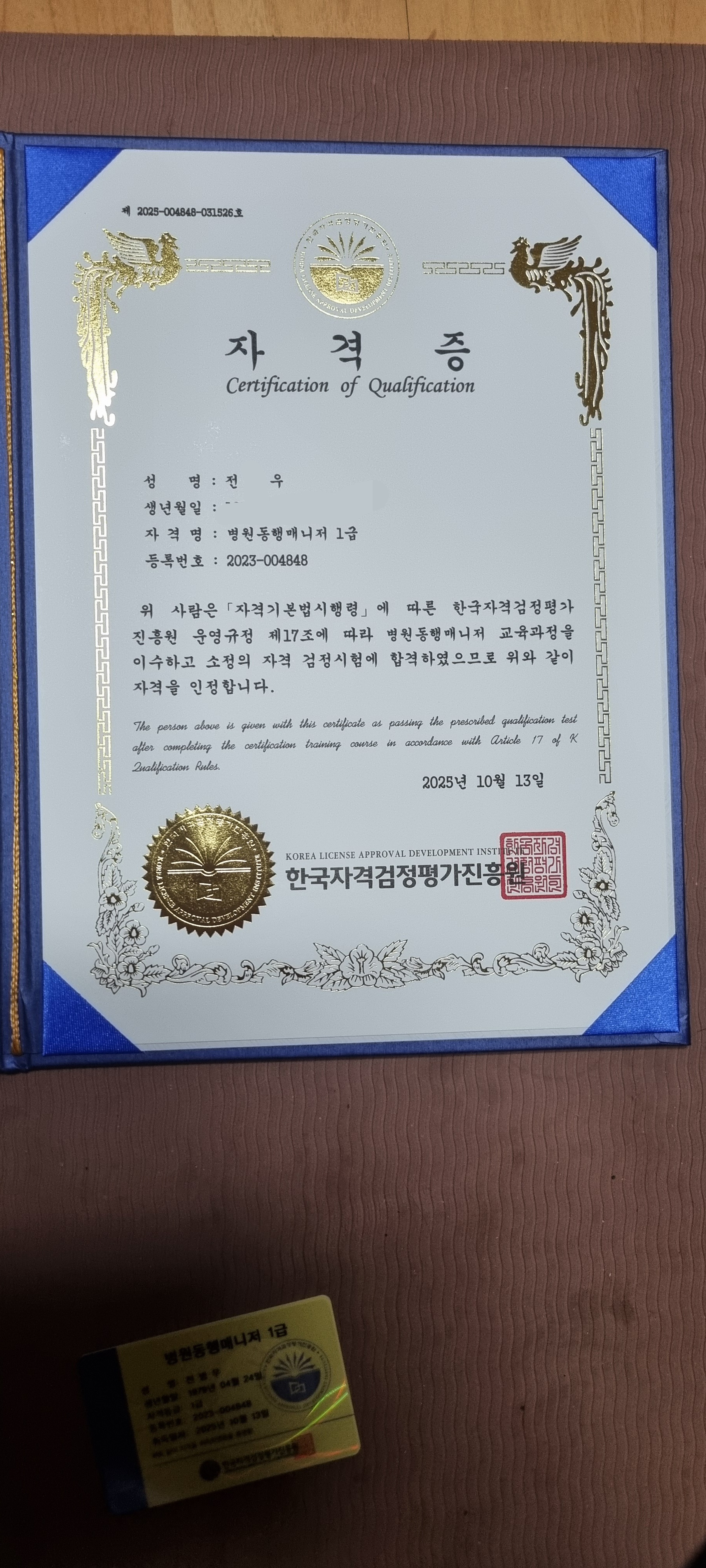 요즘 괜찮은게 뭐가있나 알아보다가 병원동행매니저가 전망이 좋다고하여 준비하고 자격증 취득했습니다. 이제 생활지도사하고 강의 듣고있습니다. 여러가지로 좋네요