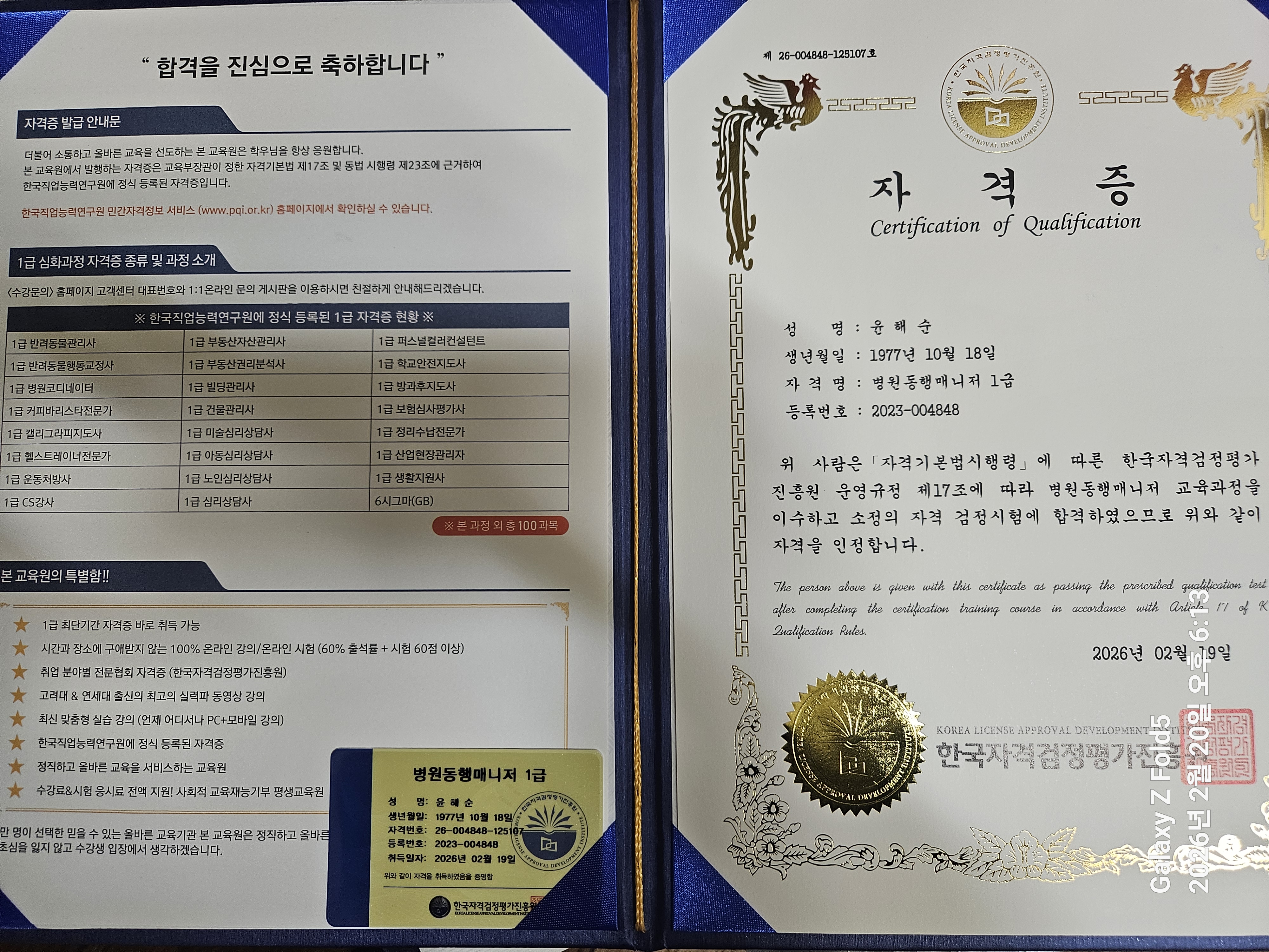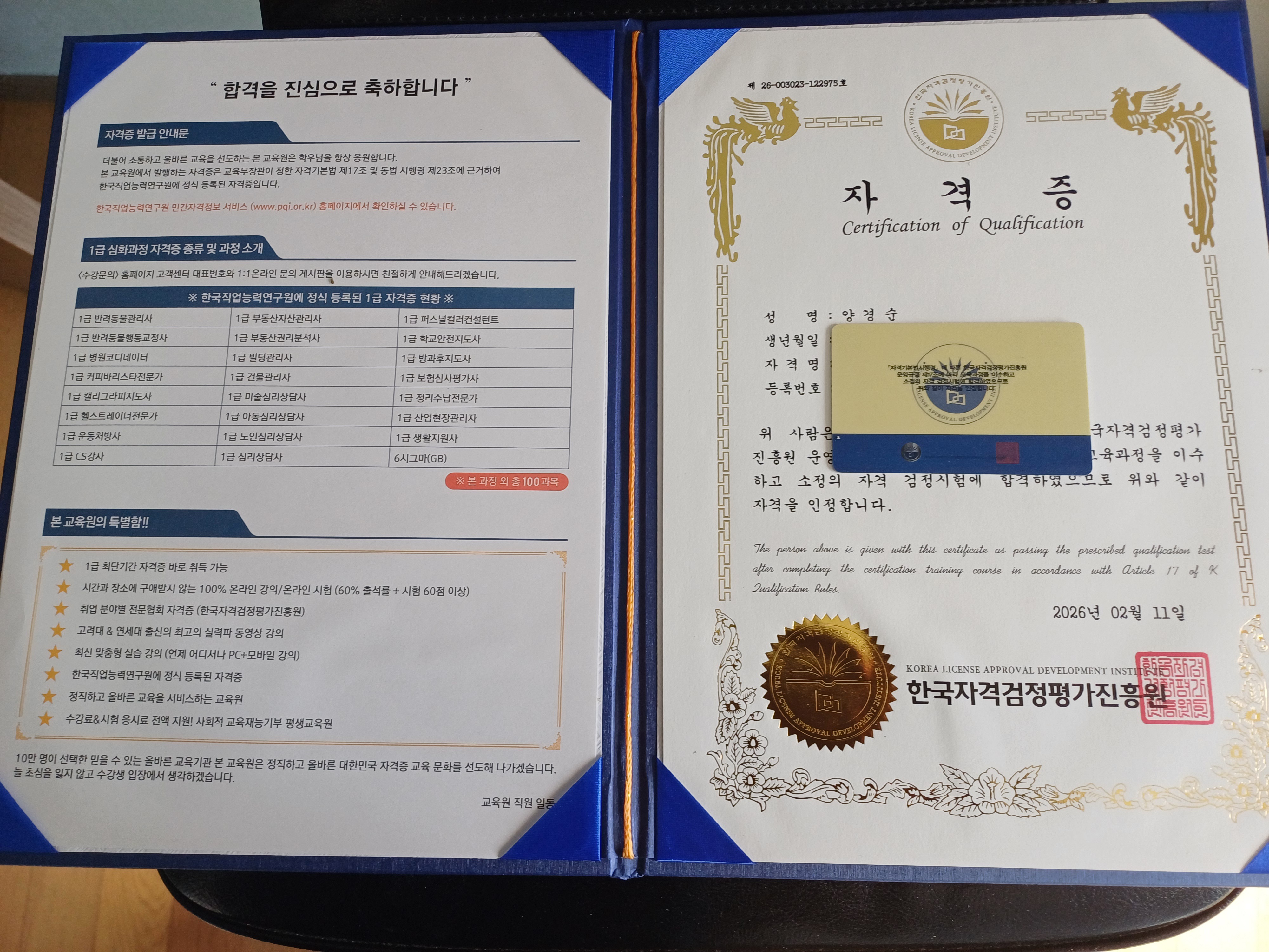 병원동행매니저1급 자격증 취득하였습니다.^^ 온라인 강의로 시간적으로 좋았고, 강의 내용도 유익했습니다. 고령화, 1인가족 증가로 자격증 활용이 도움이 될수 있음에 생각되었고, 프리랜서 활동도 가능하니, 앞으로 도움이 될꺼라 생각됩니다. 합격! 오랜만에 가져본 성취감입니다. ^^ 모두 응원합니다.
