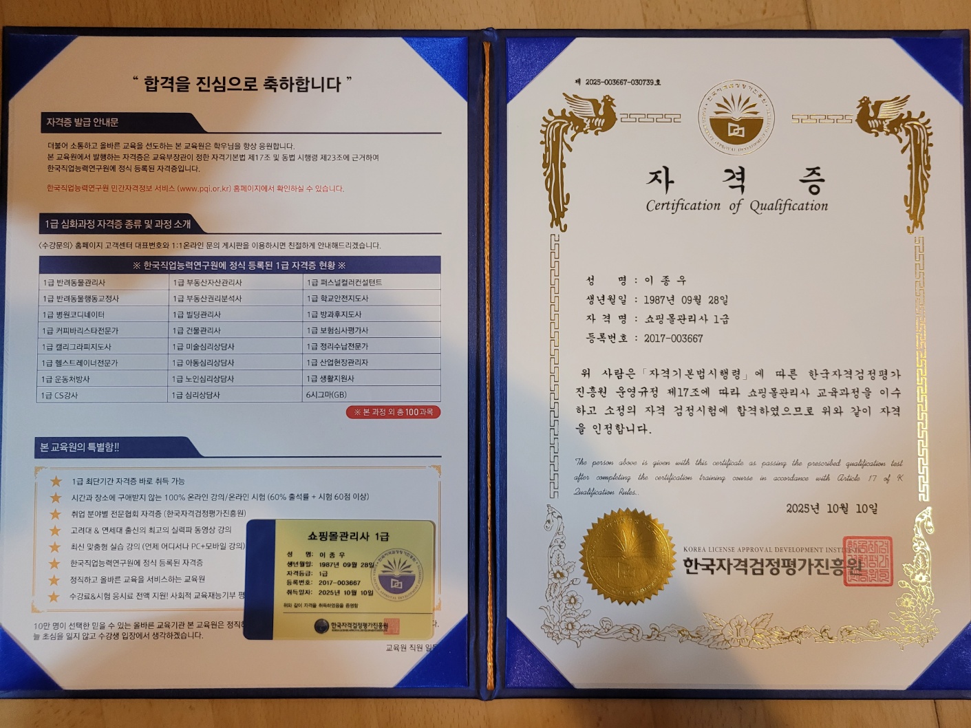 추선연휴내내 자격증 협회의 동영상 강의를 들었네요 시험은 수월하게 진행 됐지만 동영상 강의에 추석연휴 전체를 투자했네요 덕분에 자격증을 여러개 받을 수 있어서 뿌듯합니다. 한국자격증협회의 자격이 대외적으로 공신력이 커지면 더 좋을것 같습니다. 자격증 인증에 대한 논란은 그렇더라도 어쨌든 동영상 강의를 듣는 시간만큼 해당 과목의 기본지식을 습득할 수 있었고 멋진 자격증도 받을 수 있어서 좋았습니다.