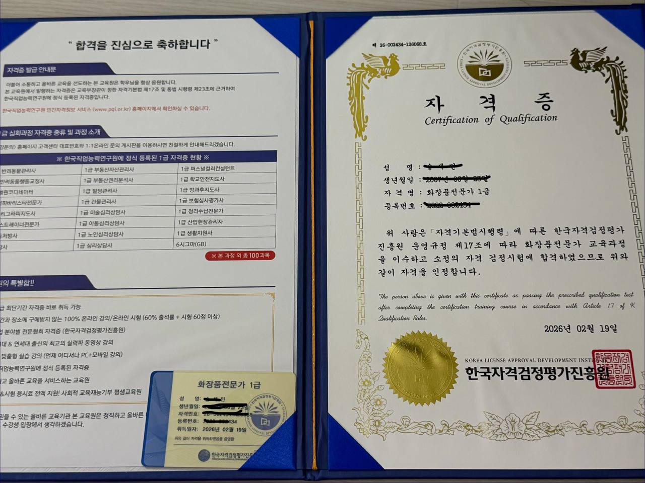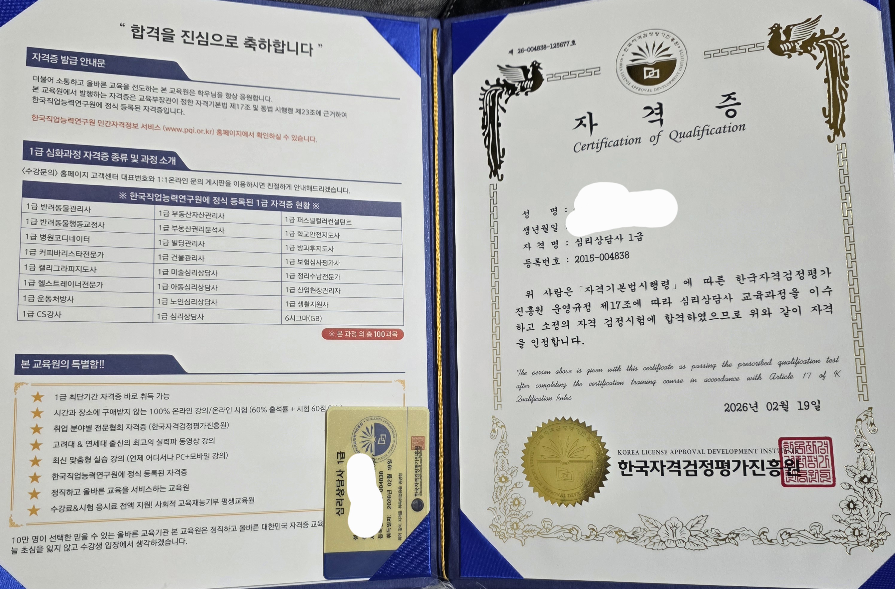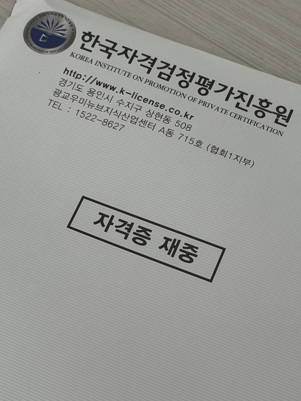 국가 자격증은 아니지만 그래도 자격증으로 활용할 수 있을 거 같아 기분이 좋습니다. 자격증과 수료증 너무 맘에 들구요 뿌듯하네요