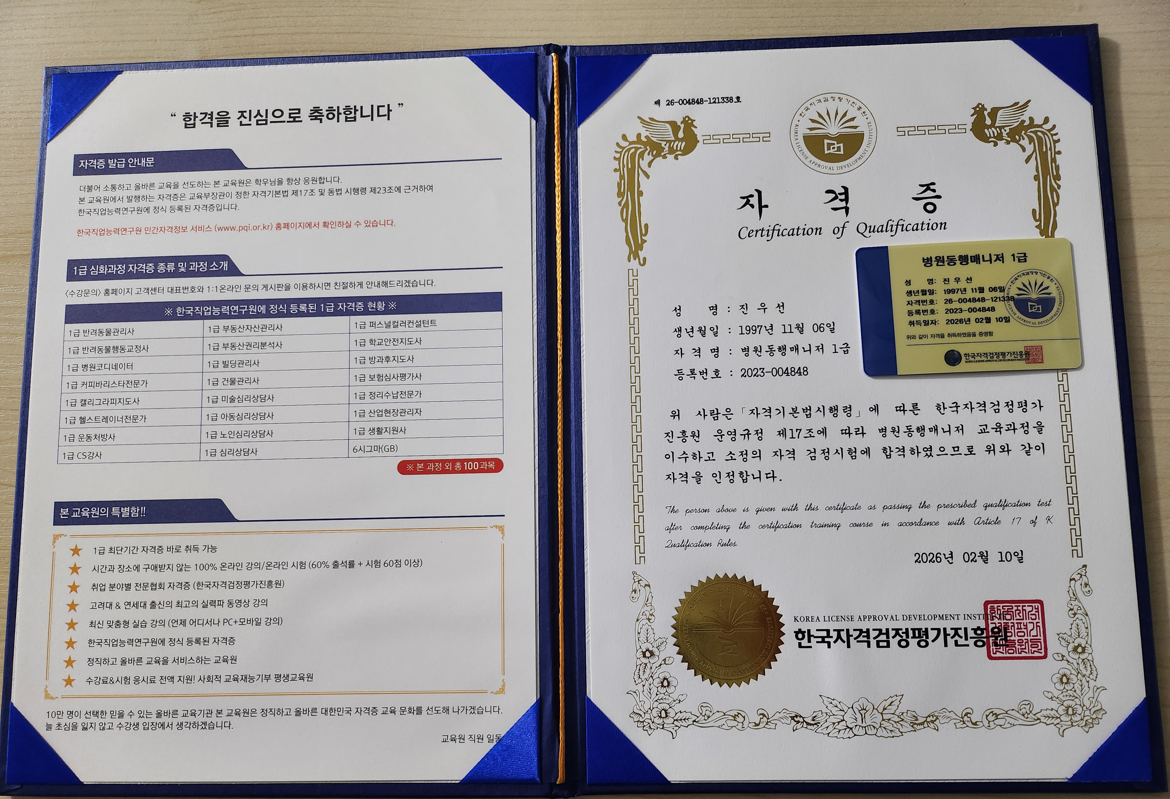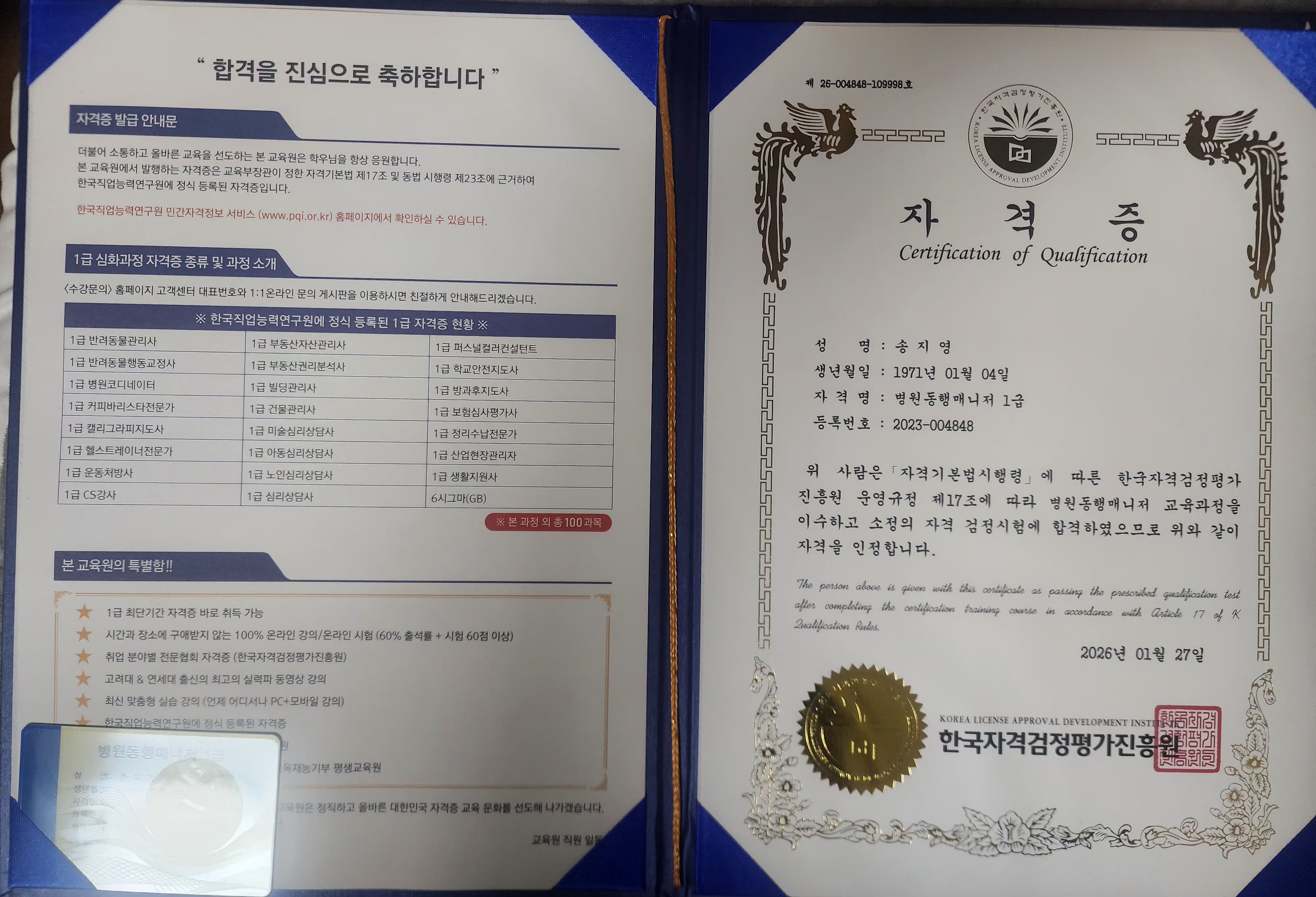 평소에 관심 있었던 분야였는데 여기서 좋은기회로 강의 듣고 합격했네요 나이가 좀 있는데 여기 교수님들이 알기쉽게 잘 가르쳐 주셔서 좋았어요