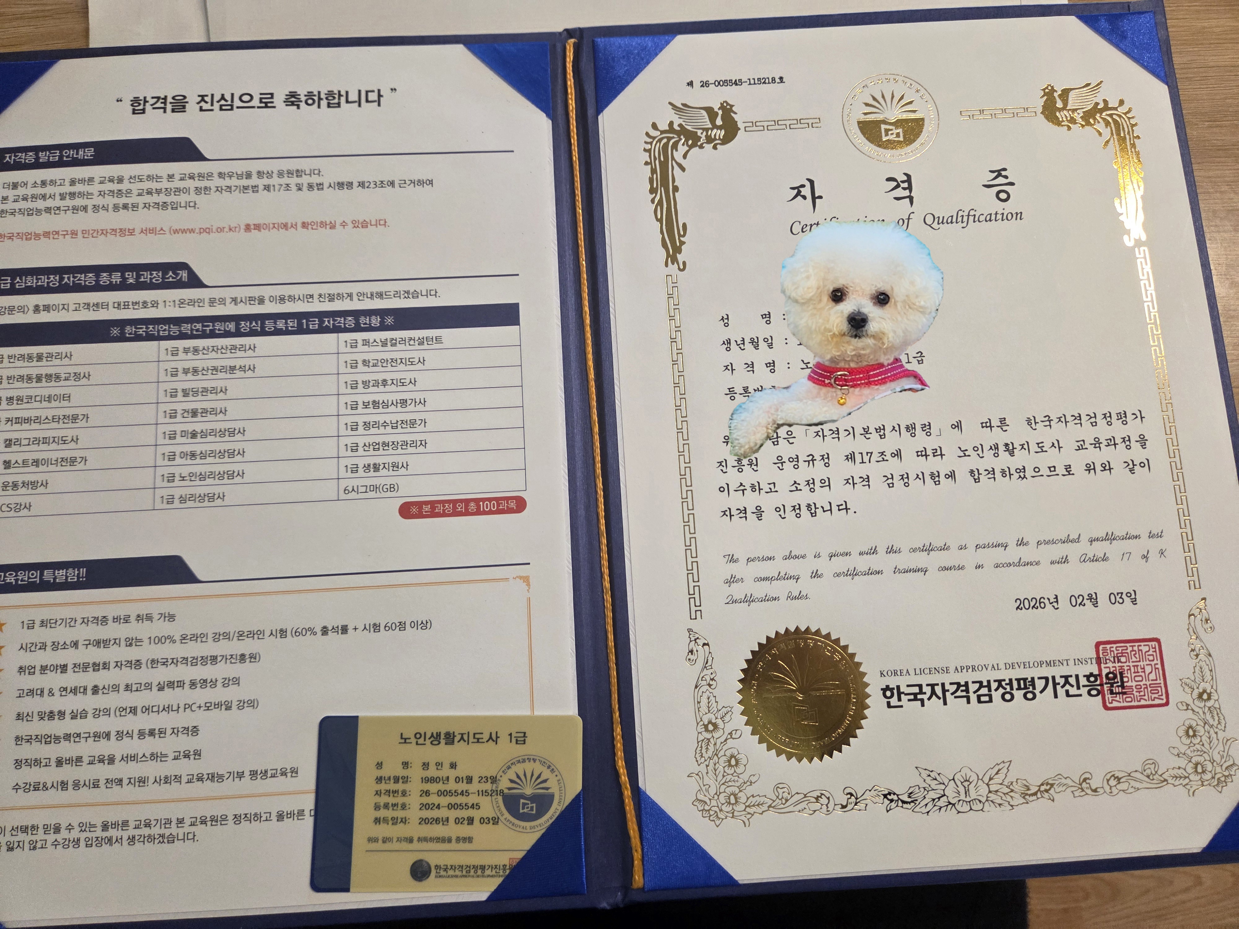 20대 초반에 제가 좋아하는 분야의 자격증을 재미있고 쉽게 공부해서 자격증까지 딸 수 있도록 기회를 가지게 해준 한국자격증협회에게 너무 감사한 마음으로 제 이름이 새겨진 자격증을 매일 눈으로 보니 인생을 열심히 살 수 있는 힘과 행복을 얻으며 지내고 있어요! 앞으로도 공부하고 싶은 게 있으면 무조건 이곳에서 도전해보려고요~^^