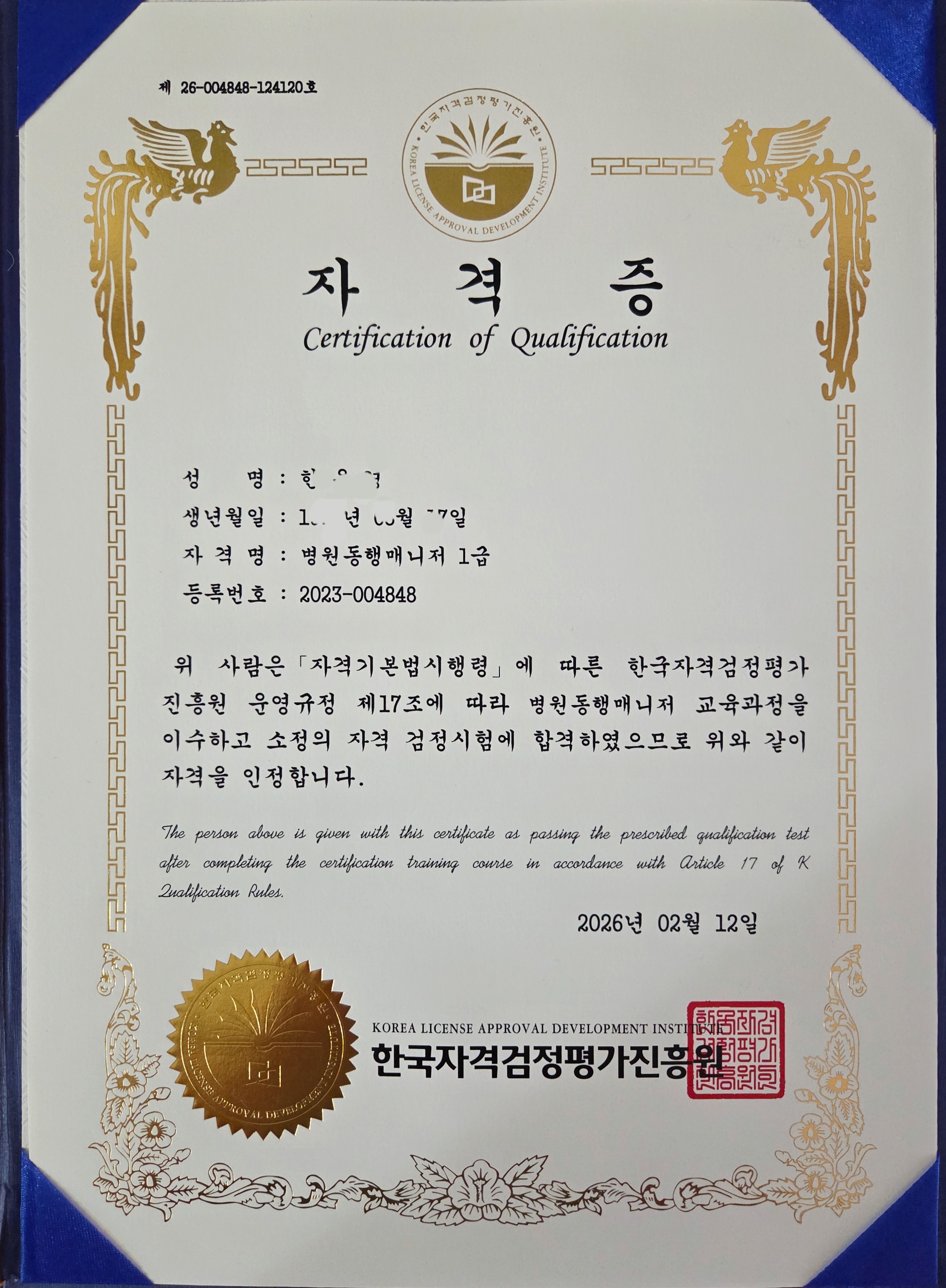 평소 사회적 약자, 돌봄과 노인, 한부모가정 등에 관심이 많았는데 촘촘한 복지 서비스에 병원동행매니저1급 자격증을 따고 합류할 기회를 얻게 된 듯하여 무척 감사하고 기쁩니다. 온라인 강의에도 불구하고 강사님께서 귀에 쏙쏙 들어올 수 있도록 강의를 잘 해 주셨고 내용도 무척 진지하고 섬세하여 감동받으며 들었어요. 상장형 자격증과 카드형자격증 동시에 받으니 자격증취득한 것이 실감납니다. 이력서를 준비하여 관계기관에 연계하여 보람 느끼며 열심히 병원동행매니저 활동을 하겠습니다. 고맙습니다. "한국자격증협회"에 감사드립니다. 새해 복 많이 받으세요.