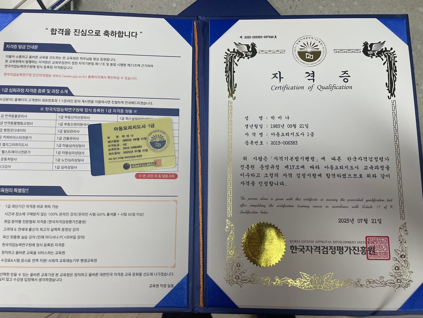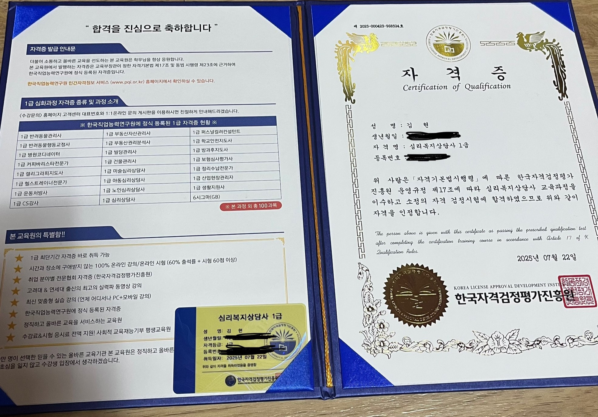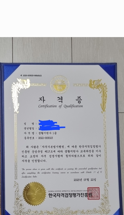 3과목을 신청해 공부하고 있습니다. 그중 첫 번째 시험이었던 생활지원사 1급에 합격하게 되어 정말 기쁘고 뿌듯합니다. 강의를 들으면서 새롭게 알게 되는 부분도 많았고, 실제 생활에 바로 적용할 수 있는 유용한 지식들도 많이 배울 수 있었습니다. 앞으로 남은 2과목도 끝까지 열심히 공부해서 꼭 자격증을 취득하겠습니다.