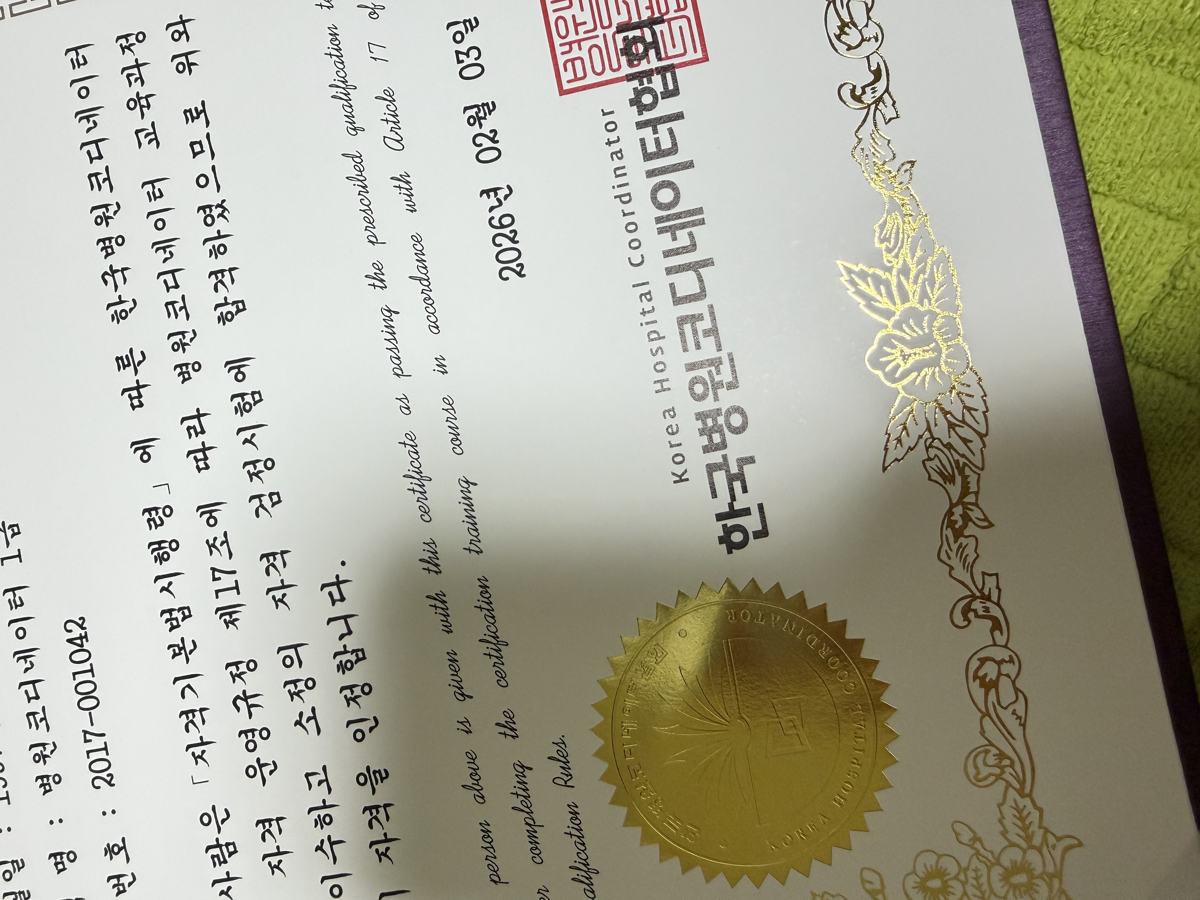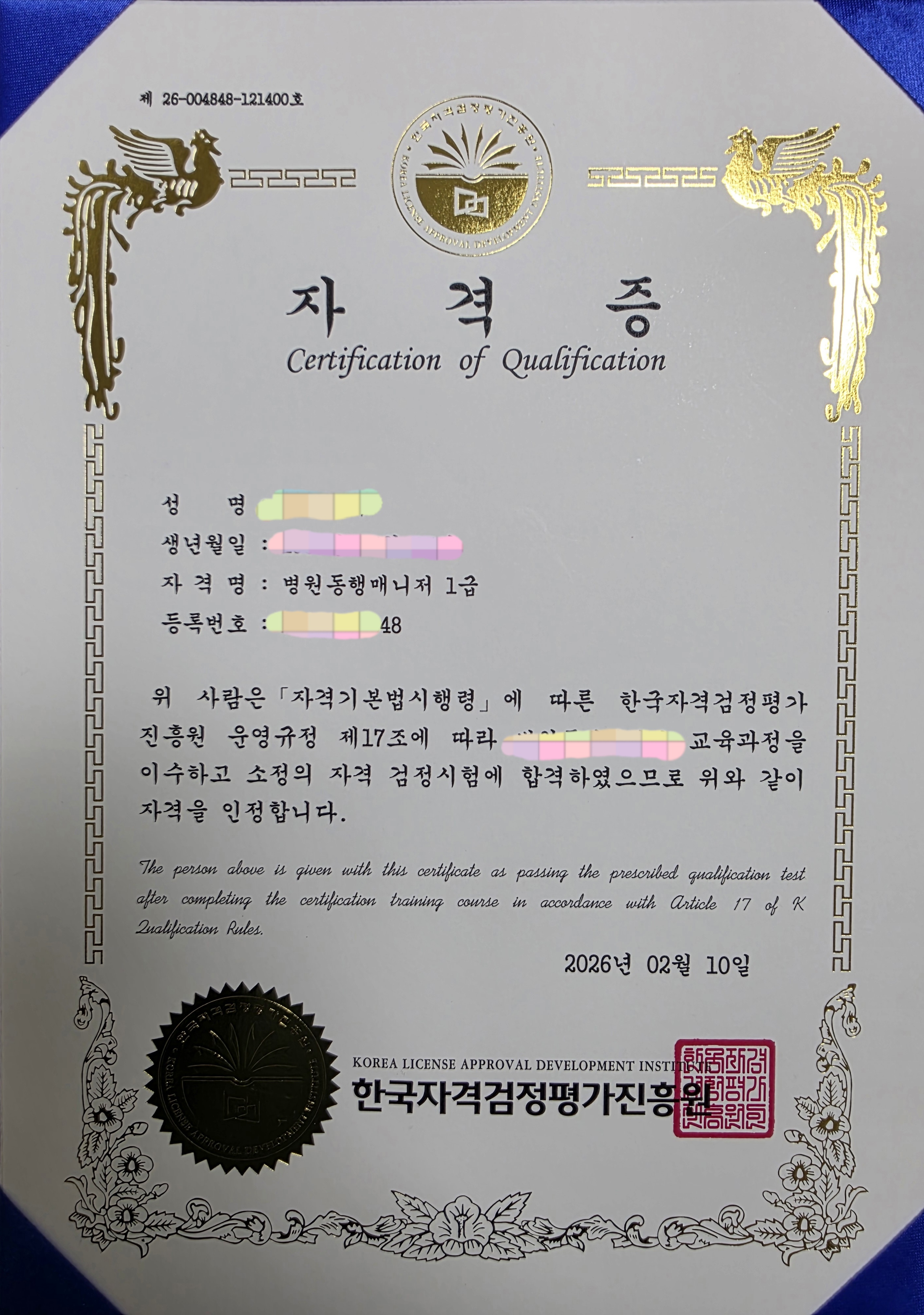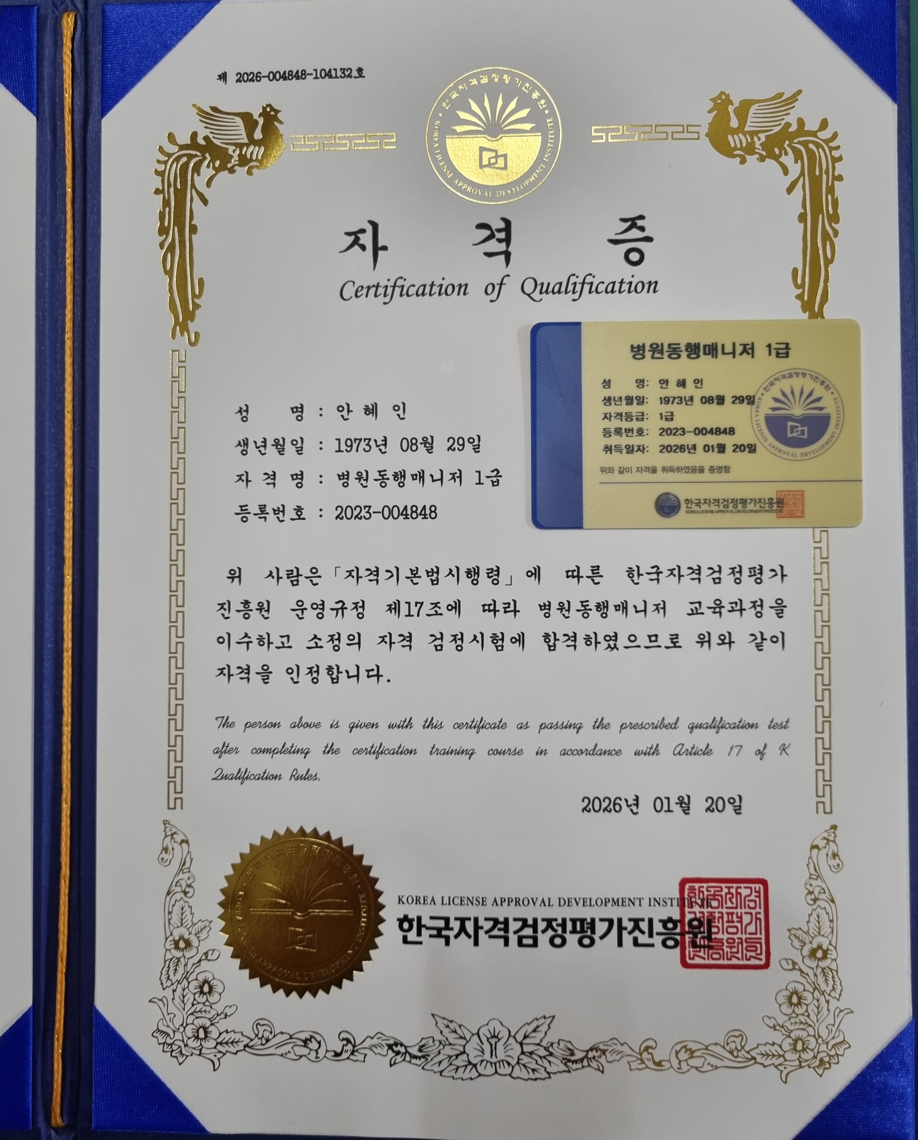 지인 통해 병원동행매니저 자격증이 있다는걸 접하고 온라인 강의로도 취득할 수 있다해서 틈틈히 공부해서 합격 했습니다. 앞으로 다른 강의도 듣고 활용해서 두번째 직업도 열심히 준비해볼까 합니다! 감사합니다~