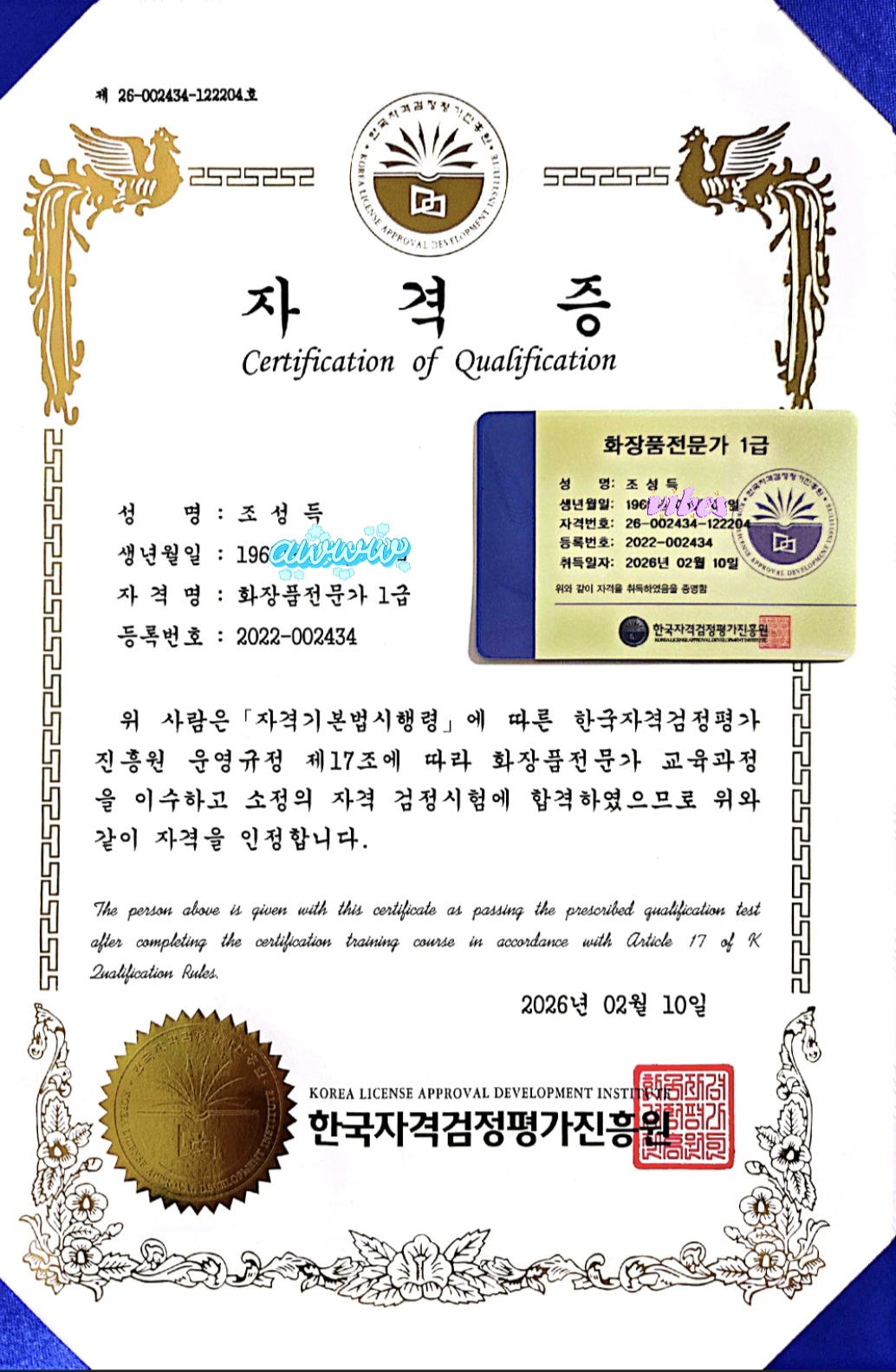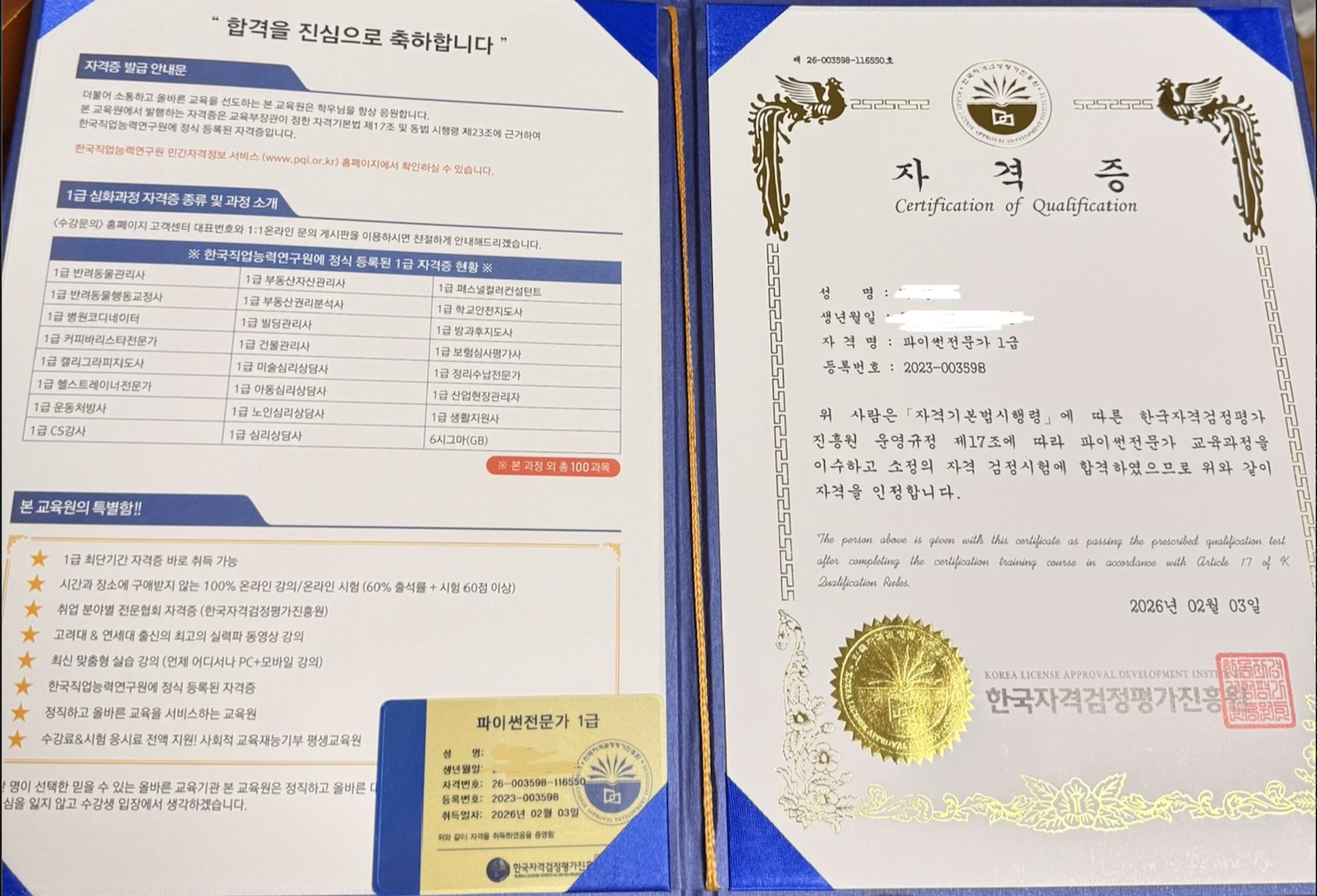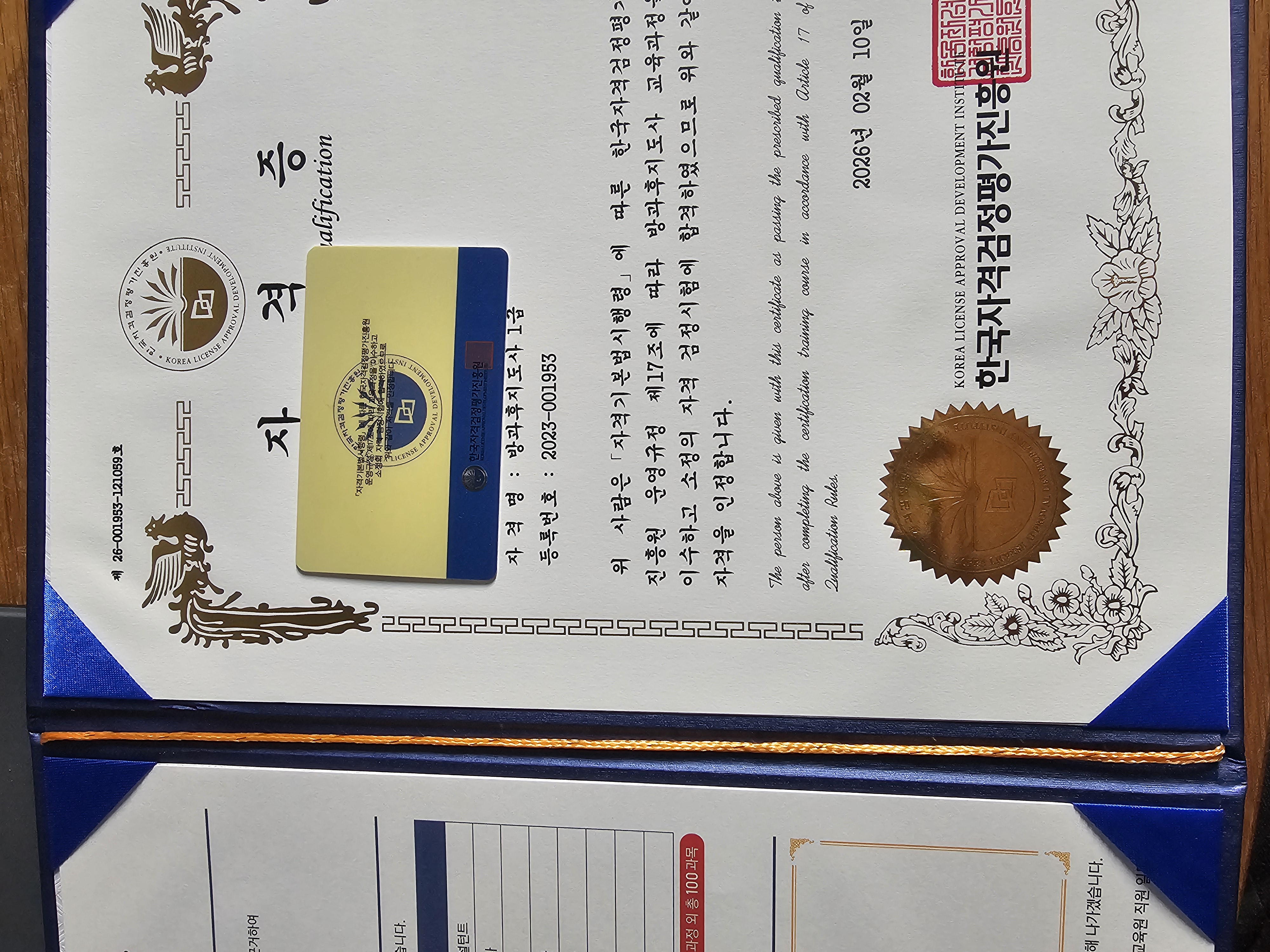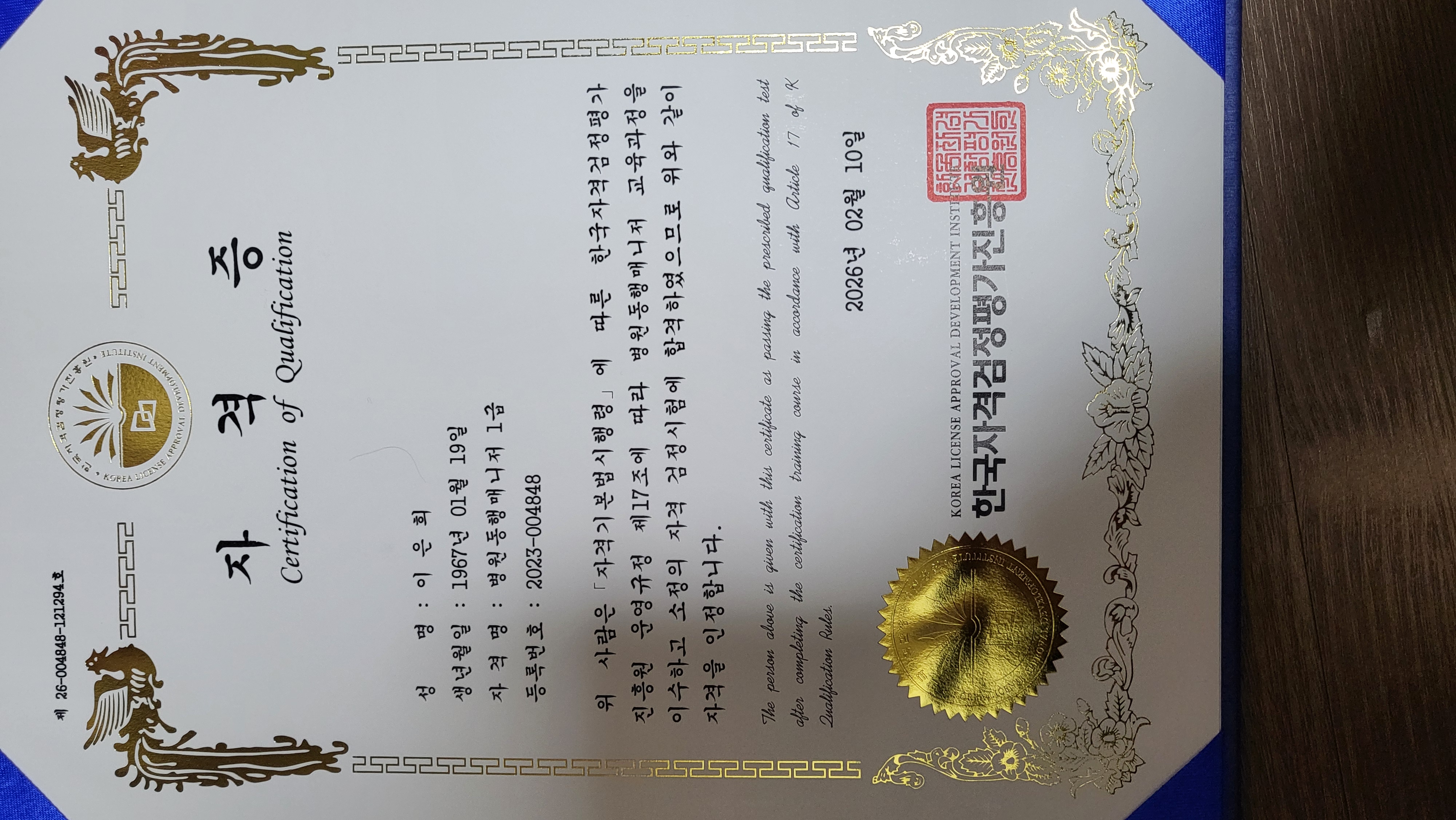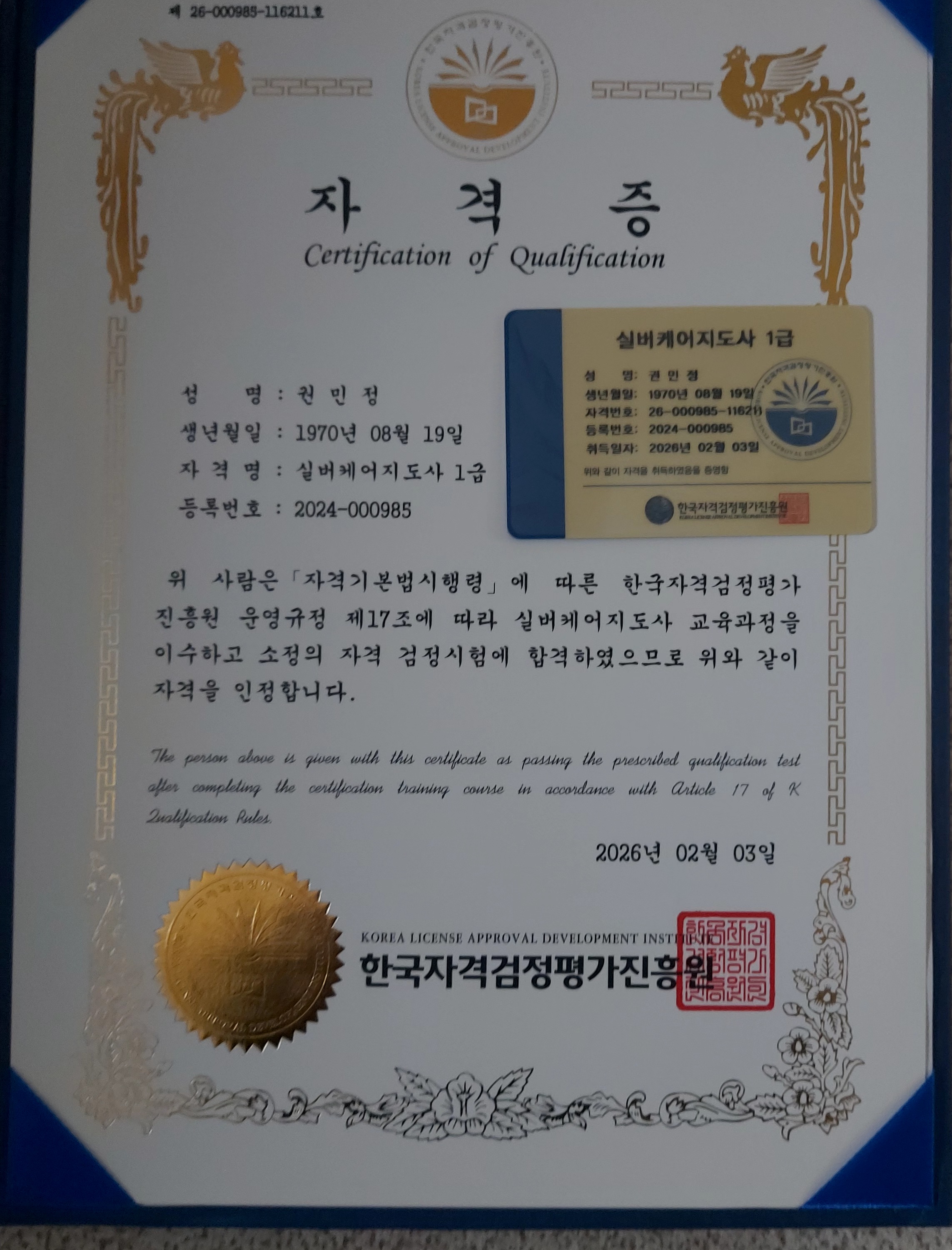 젊었을 때부터 자격증 하나쯤 따고 싶었던 갈구하며, 열씸히 사회생활에 종사했지만,운전면허증 밖에 없었는데, 드디어 전문가 자격증을 받아보니, 가슴이 뭉클합니다.아직 할수있구나라는 용기와 자신가신감도 생기고 좀더 열씸히 살아야겠다는 희망이 생겼습니다. 감사합니다^^♡