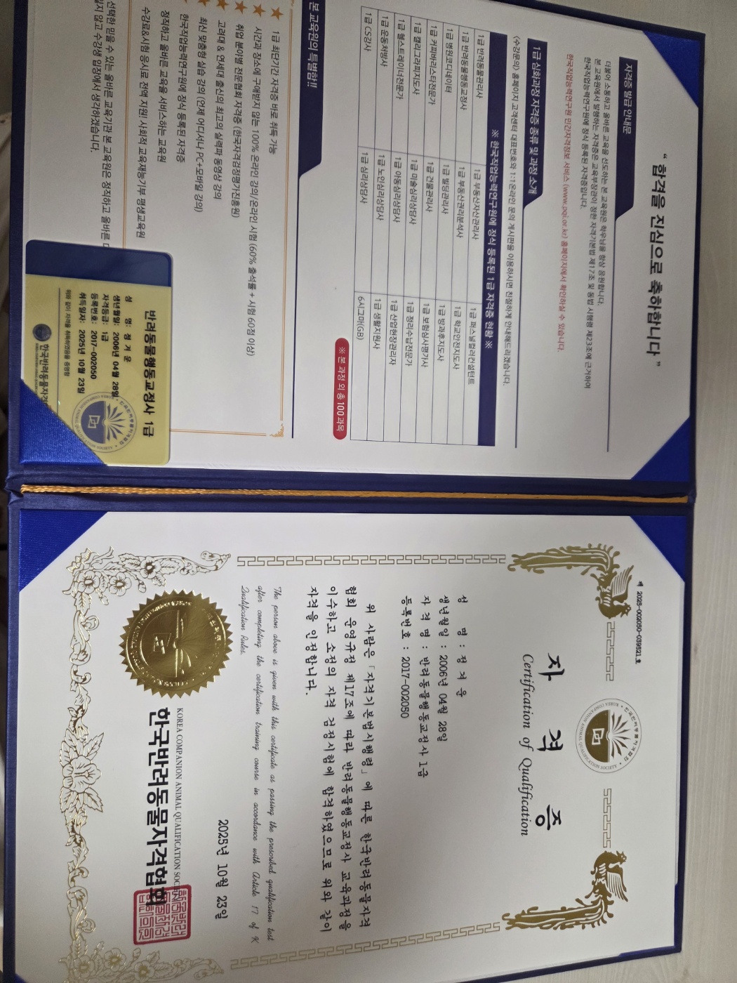 강아지를 키우니 반려동물에 관한 자격증 하나 있으면 좋겠다고 생각해서 듣게 되었고 강의 잘 듣고 예상문제 풀어보니 합격했습니다.
