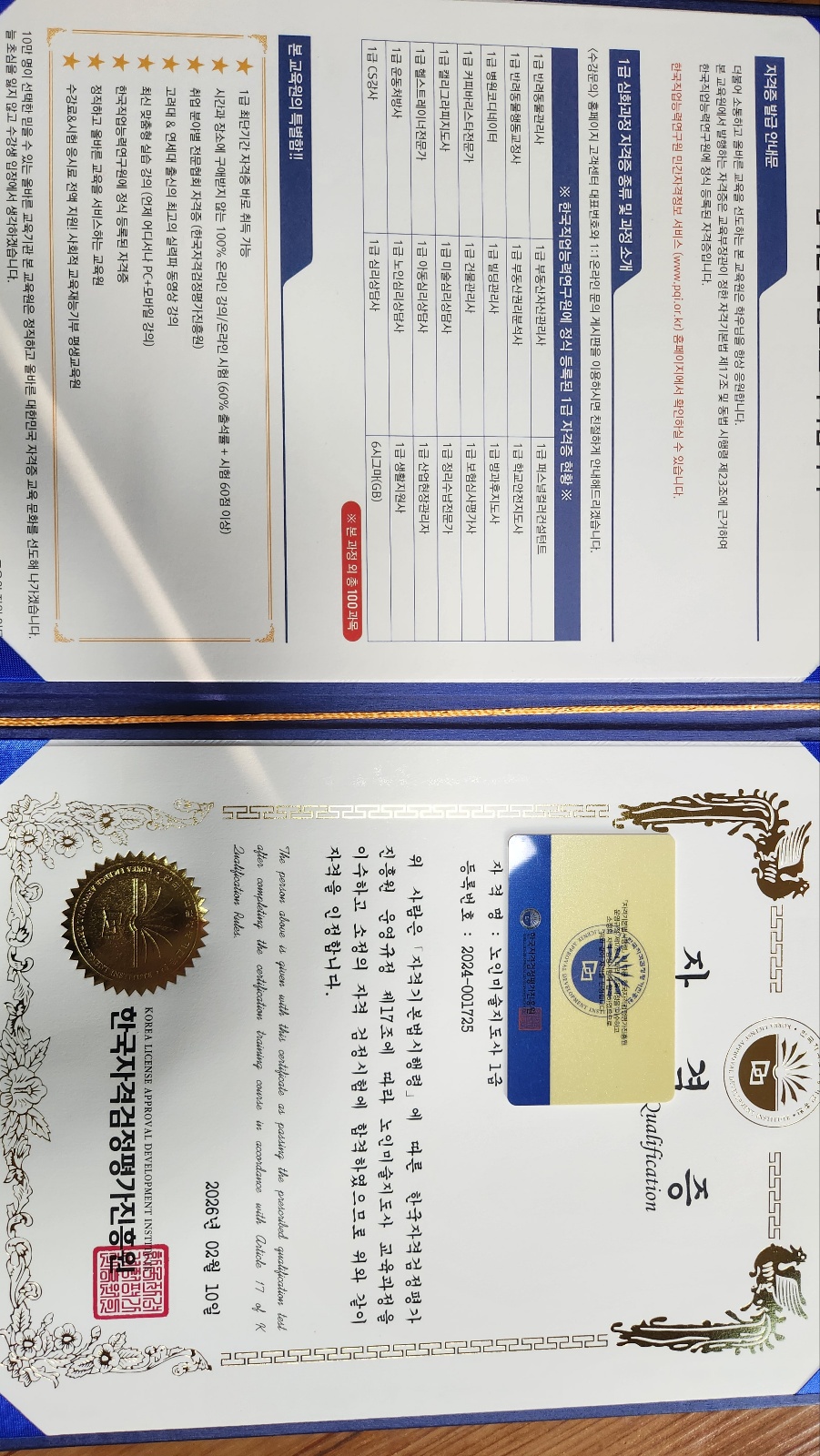 직장을 그만두고 하고 싶은 자격증을 찾다가 한국자격증협회를 알게 되었어요 강의도 상세히 잘가르쳐 주시고 기출문제도 있어서 합격하게 되었어요 감사합니당