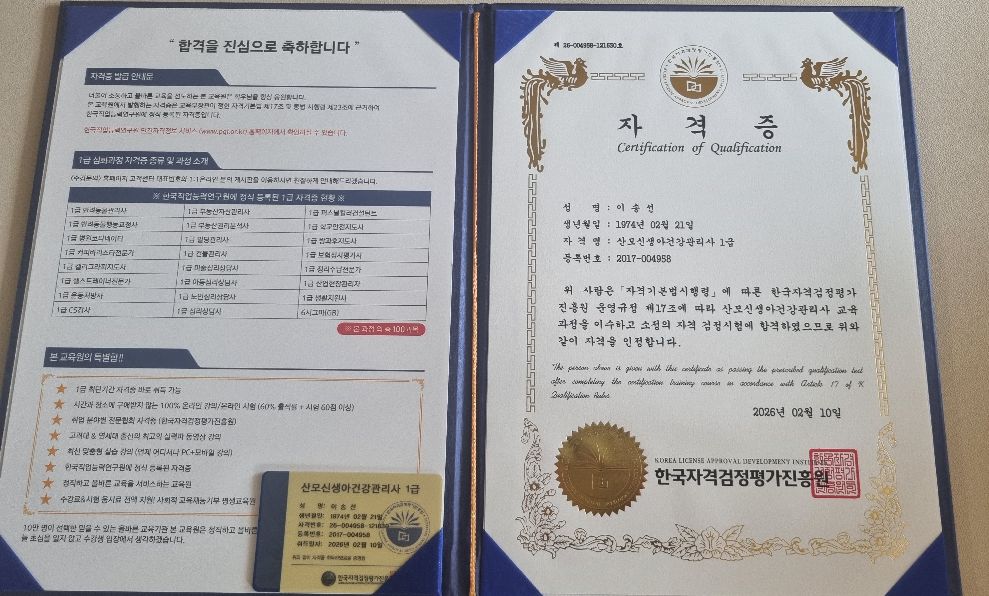 지인을 통해 산모신생아건강관리사라는 전문 과정이 있다는 걸 알게 되어 강의를 듣게 되었어요. 강사님의 쉽고 재밌는 강의 덕분에 한번에 쉽게 취득하게 된 것 같아요. 무료 강의로 자기 계발을 할 수 있다는 점에서 최고입니다.