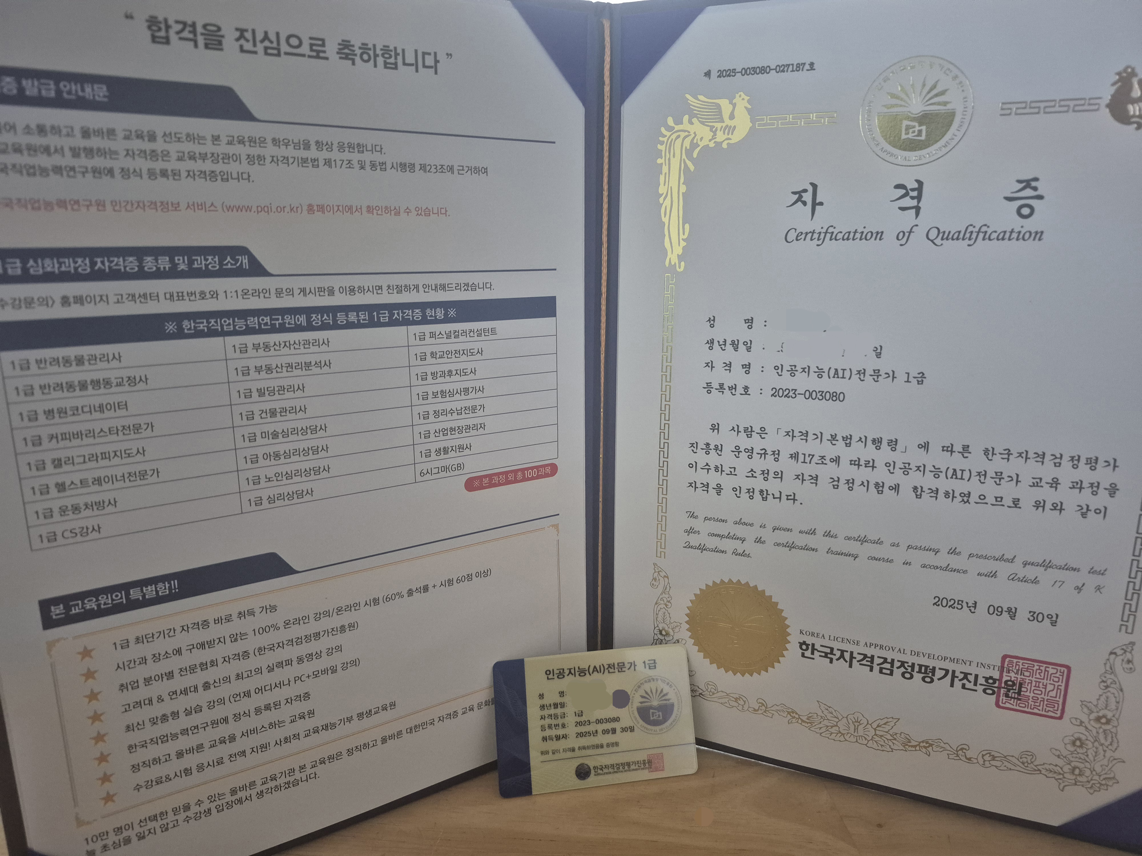 안녕하세요 요즘들어 AI에 관심이 많았지만, 전문적인 지식이 부족해서 자격증이 뭐가 있을까 찾다가 우연히 한국자격증협회 사이트를 알게 되어 1급 자격증을 취득했습니다!! 감사드리고 다른 IT자격증도 도전할 예정입니다^^!!