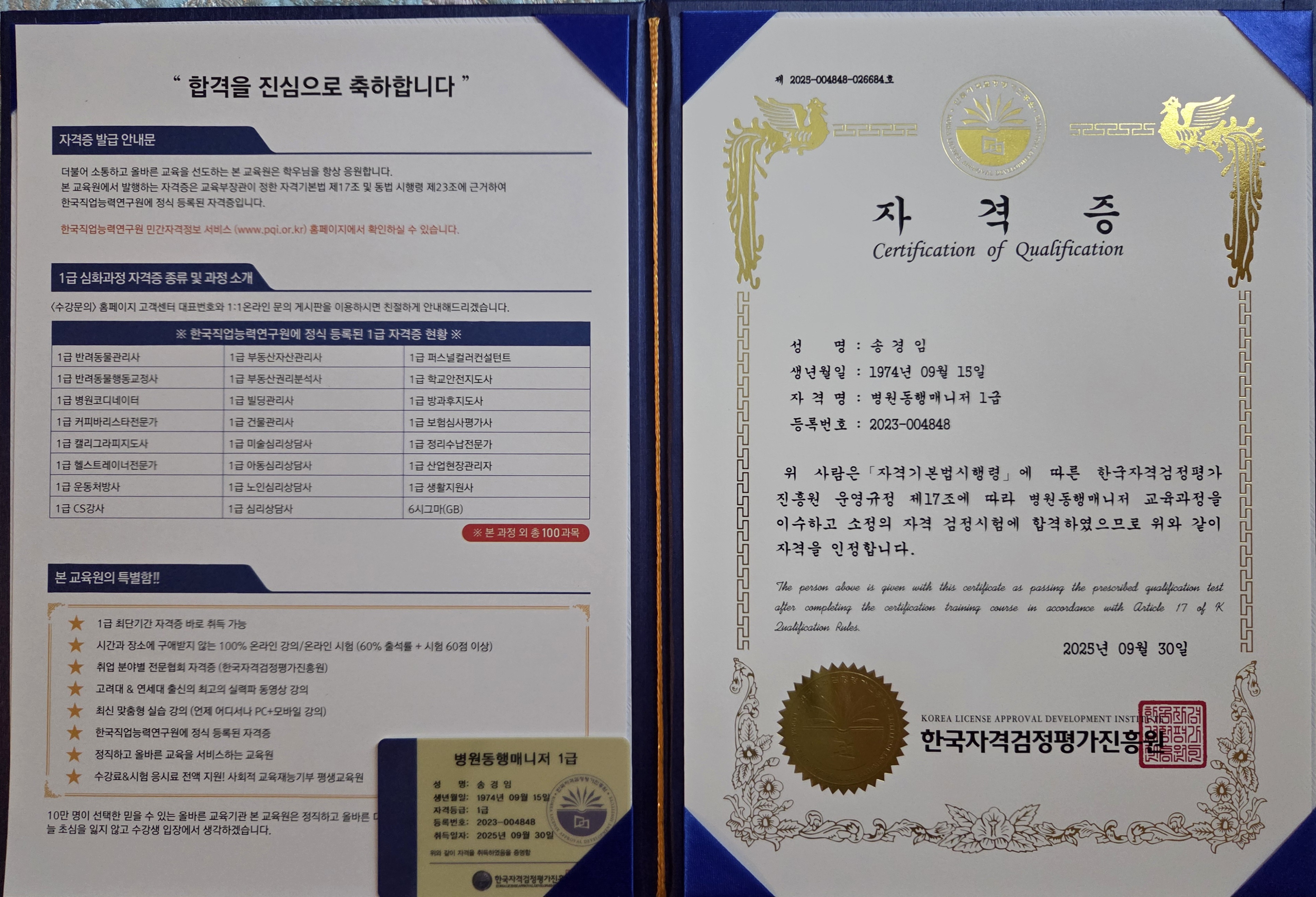 지금까지 어린이집에서 일하고 있었는데 또 다른 직업도 해보고 싶은 마음에 병원동행 매니저 자격증을 따보았어요. 시험도 쳐야해서 걱정을 했는데 예상 문제집을 참고 했더니 어렵지 않게 통과했어요. 여러번도 충분히 할 수 있으니 도전 해보셨으면 좋겠어요. 앞으로 취업 할 때 이 자격증이 저에게 큰 힘이 되었으면 좋겠습니다.
