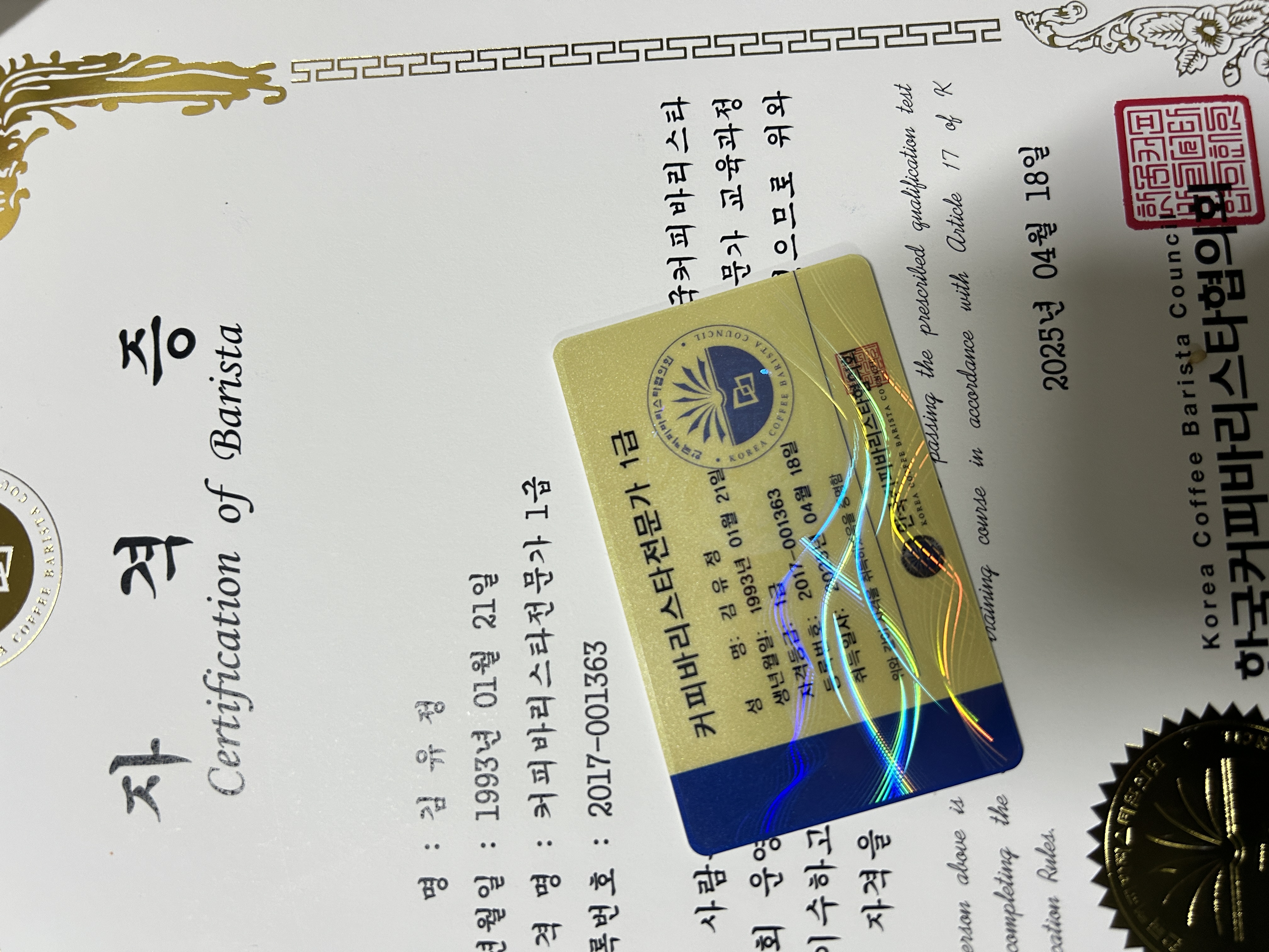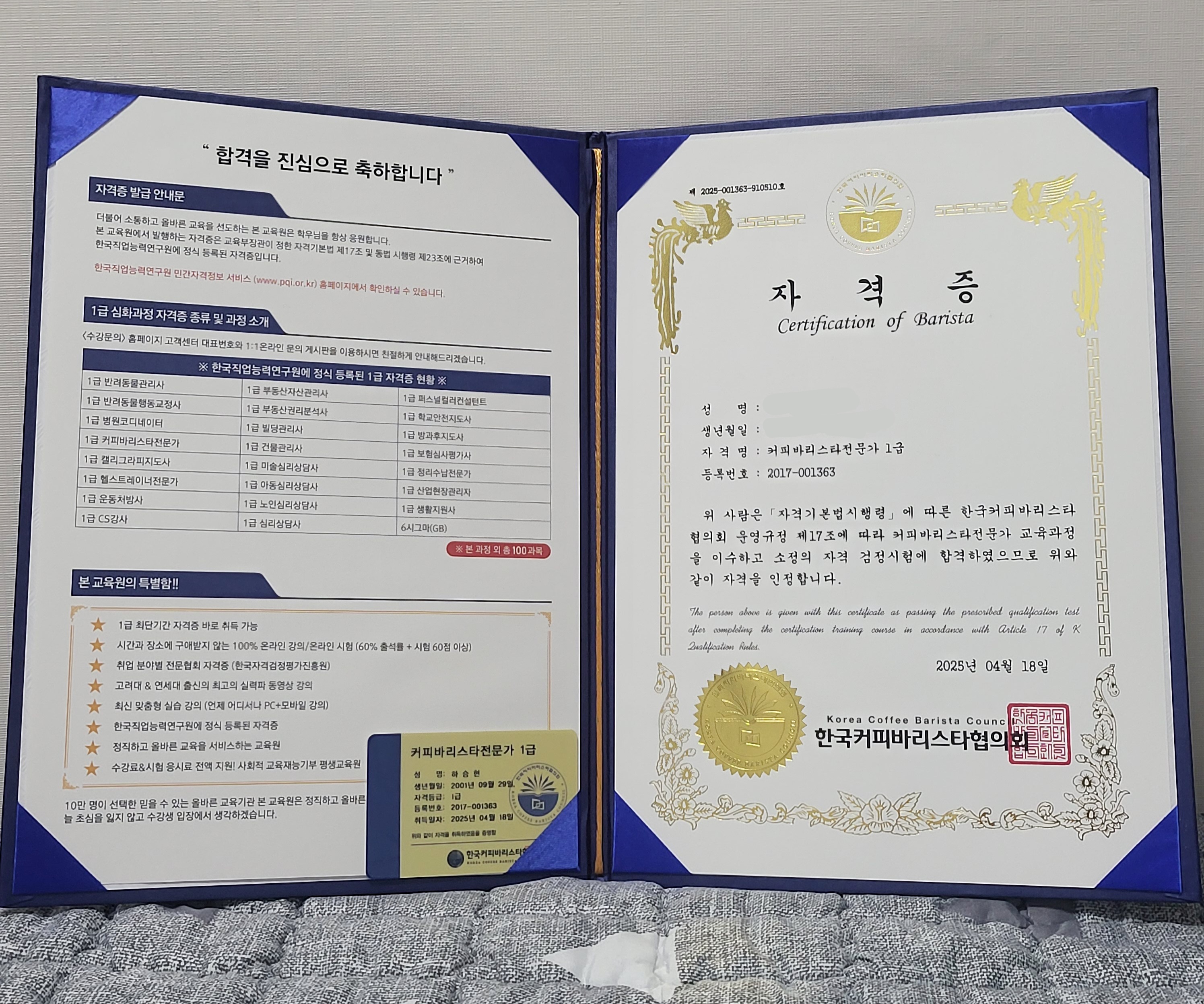 저는 처음에 인스타 통해서 광고가 나오길래 흥미로워 사이트에 접속했고 어쩌다보니 커피바리스타전문가 1급을 딸수있다고 돼있길래 거짓말이겠지하며 속는샘치고 수강 다듣고 자격증 신청하니 몇일뒤에 자격증이 나와서 놀랐습니다! 그래서 보니깐 진짜 자격증이 왔고 자격증 카드도 완벽하게 나왔습니다. 이렇게 진짜 간단하고 쉽게 자격증을 딸수있어서 너무 좋네요!! 다른것도 많아가지고 다른 부분도 더 따보고 싶습니다!