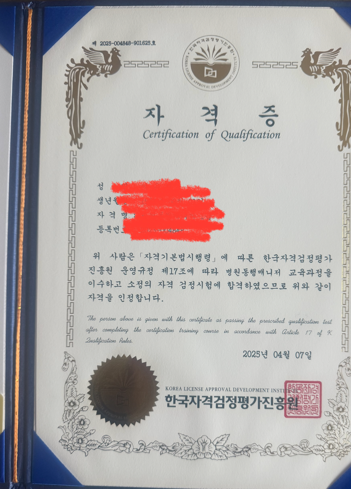 무슨 자격증이든 처음 나왔을 때 따는게 제일 좋은 것 같아서, 병원동행매니저자격증에 관심을 갖게 되었는데, 직장인이라 따로 시간을 내서 수강하러갈 시간이 부족했어요. 그런데, 온라인수강과 시험응시가 가능해서 맘 편히 신청하고 수업듣고 자격증도 땄어요. 부지런히 들었더니 며칠 안걸리고 딸 수 있었어요. 자격증도 소중하지만, 수업내용도 배울게 많고 좋았습니다.