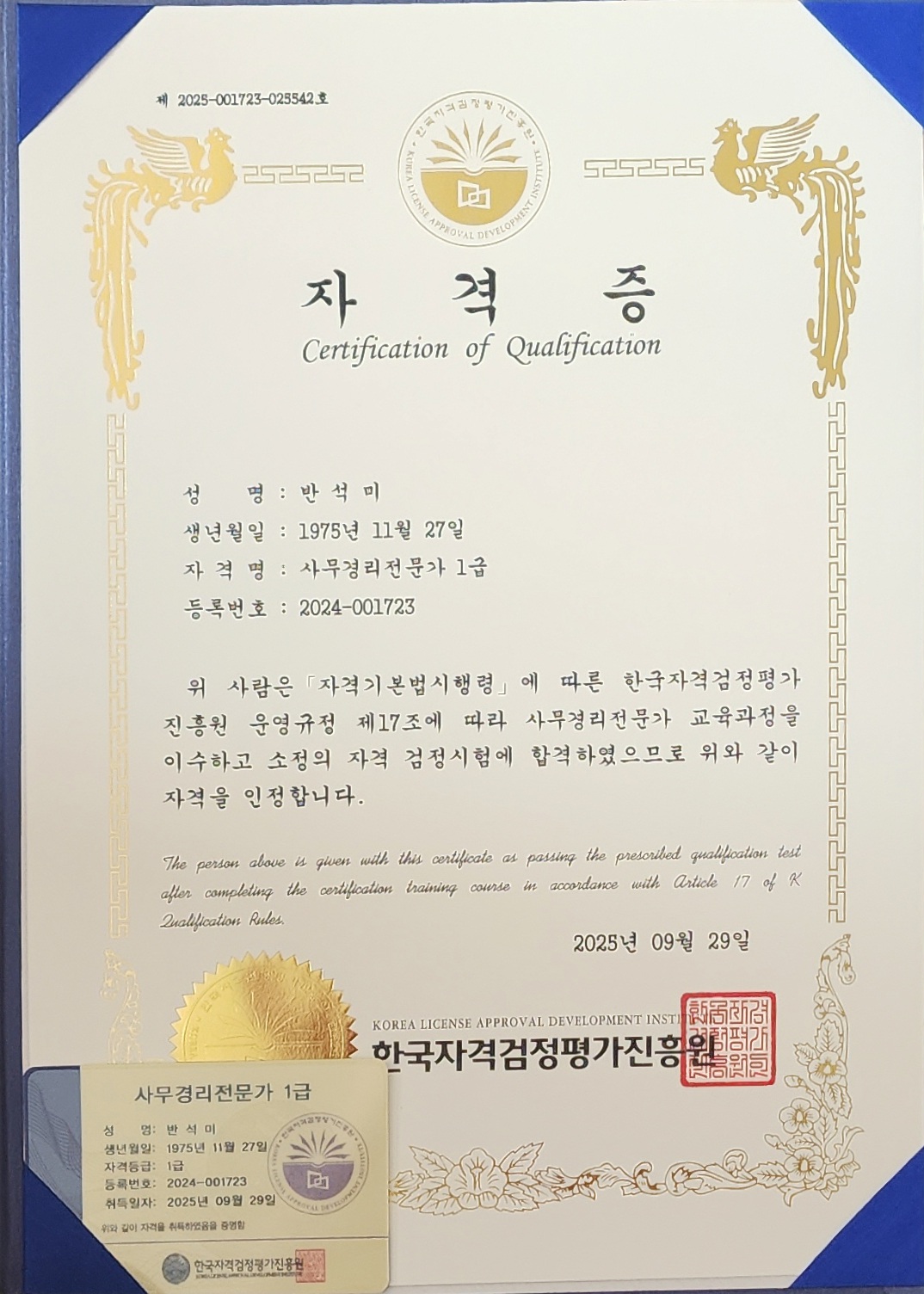 평균 수명 연장과 은퇴시기가 다가옴에 따라 무슨 준비를 할까 여러가지로 고민하던 중 핸펀에 올라온 자격증 취득 관련 글을 접하게 되었습니다. 너무나 많은 자격 종목에 놀랐고 무엇부터 해보나 고민하다 실생활에서 많이 접살 수 있는 것부터 선택했습니다. 짜임새 있는 내용과 교수님들의 열띤 강의, 기출 문제 등이 잘 배합되어 자격증은 무난히 받을 수 있었습니다. 계속해서 가지수를 확장해보려고 하고 있습니다. 쟈걱증에 도전하시는 모든 분들 화이팅 하시게요~~~