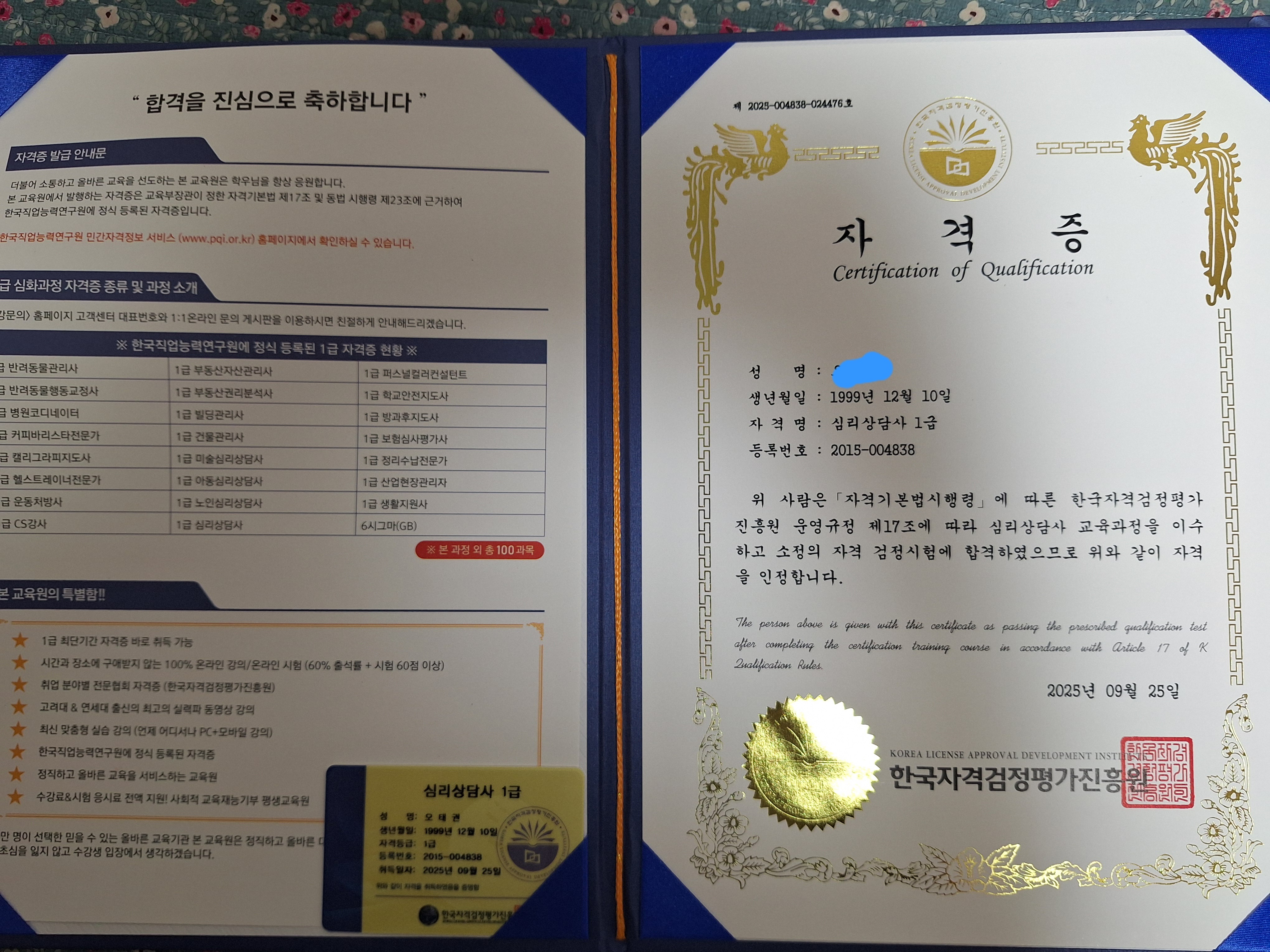50대인 제가 기억력과 정신력이 약해지기 전 도전해서 꿈을 이루는 것은 수준 높은 교수님께서 수업 내용을 이해하기 쉽도록 강의를 해주셔서 자격을 취득할 수 있는 기회를 얻게 되었습니다. 무엇보다 기출 문제를 풀이하고 집중하다보니시험 문제가 강의와 기출문제가 도움이 되어서 틈틈히 시간내 교육과 강의 들어서 취득한 한국자격증협회에 감사드립니다.