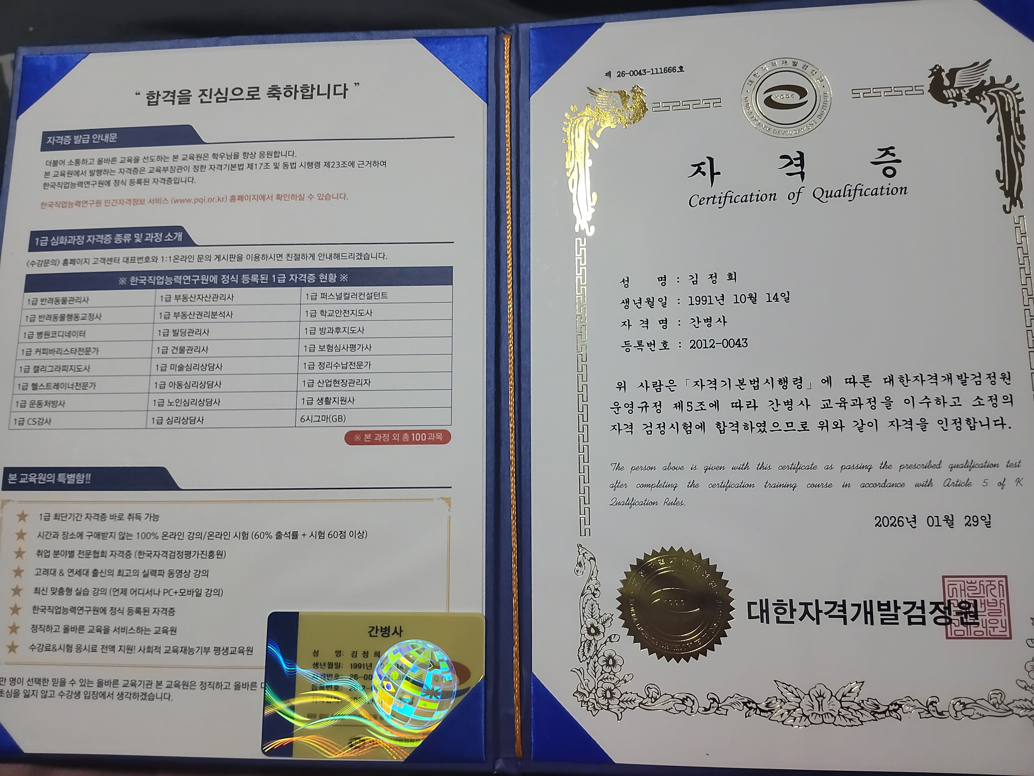 제가 교육받고 자격을 취득했네요