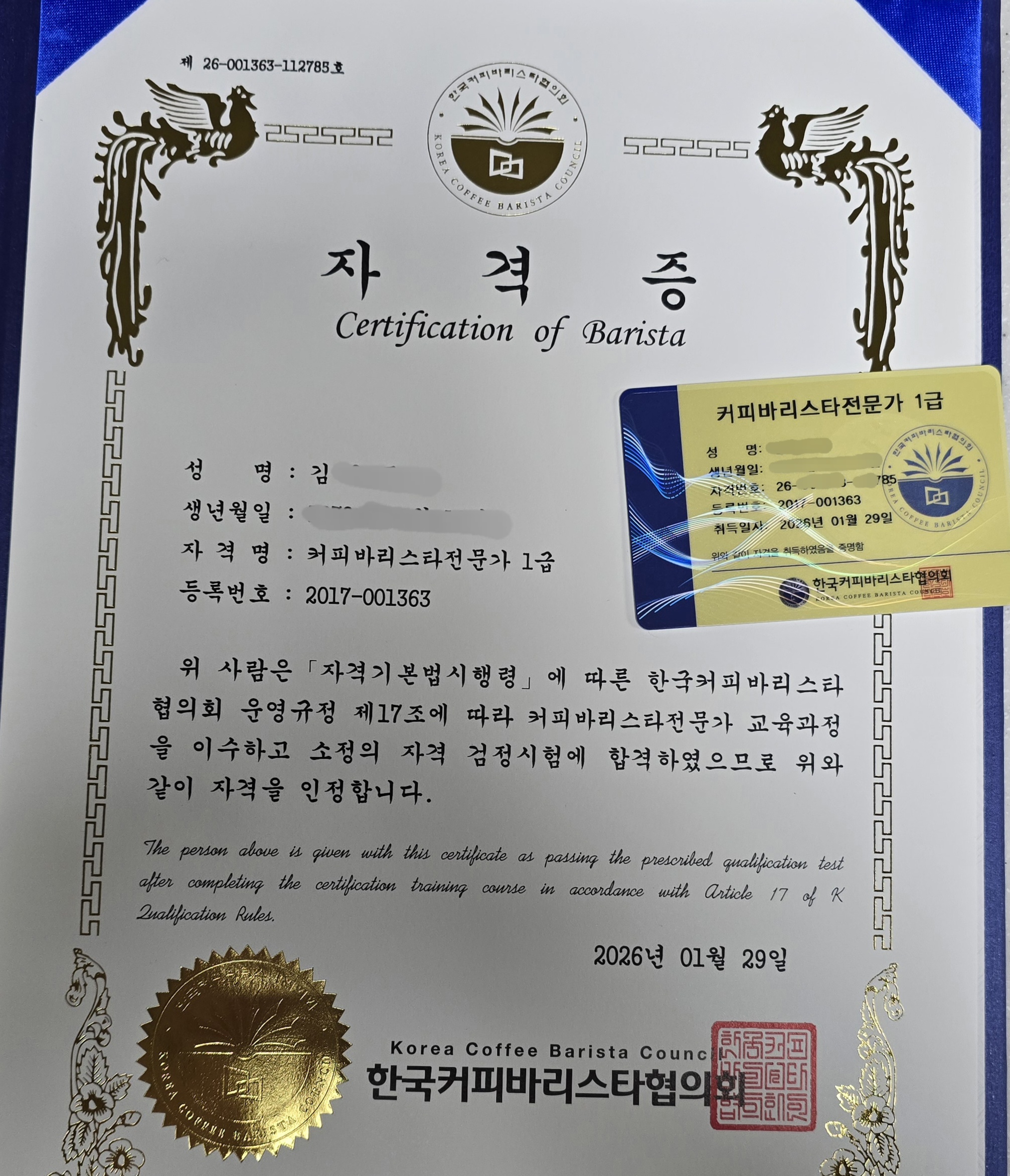 우연히 알게된 한국자격증협회 다른 바리스타 자격증이 있어서 관련된 자격증을 더 따두면 좋을거 같아 수강했는데 막상 자격증을 보니 은근 어깨에 힘이 들어가는 느낌입니다.