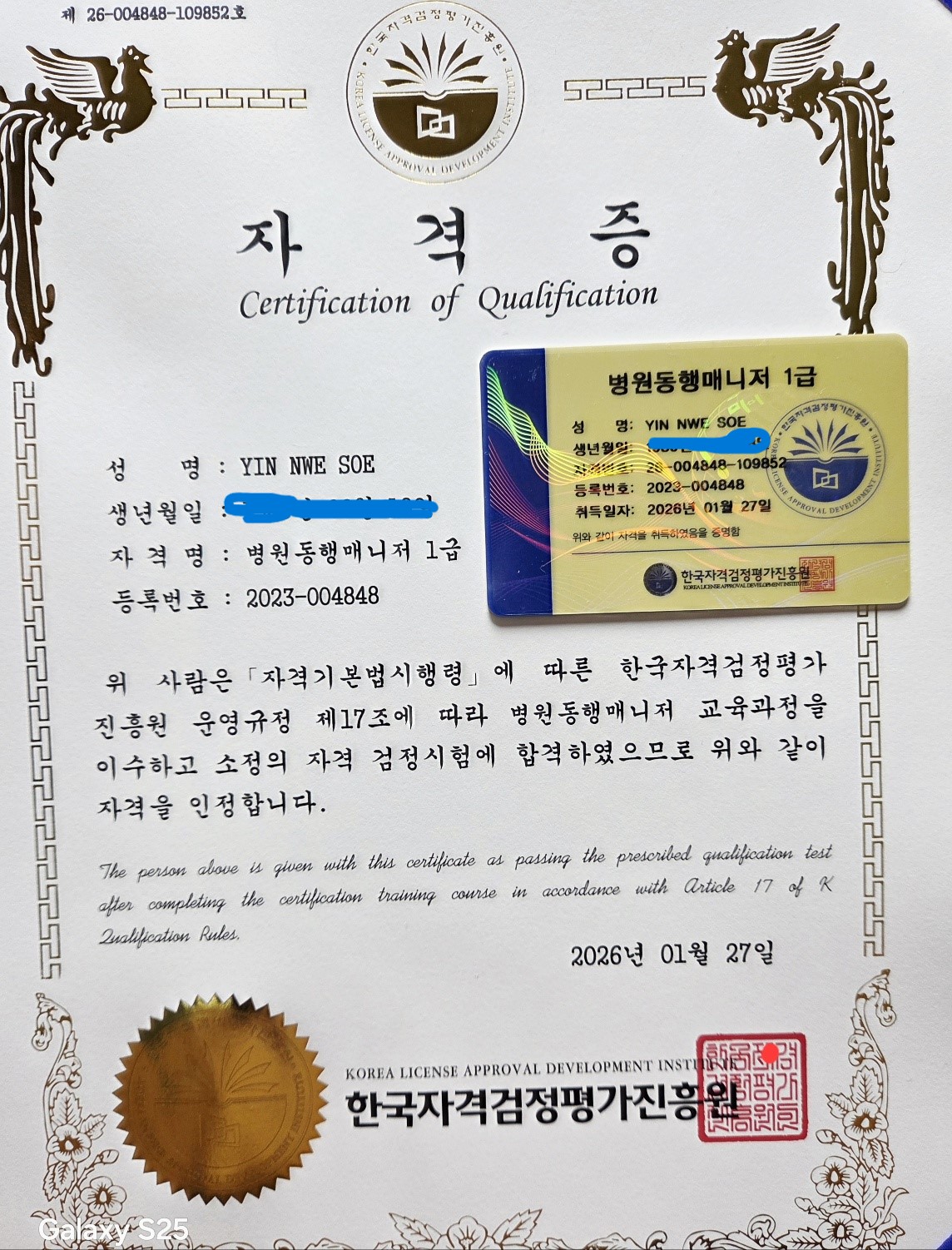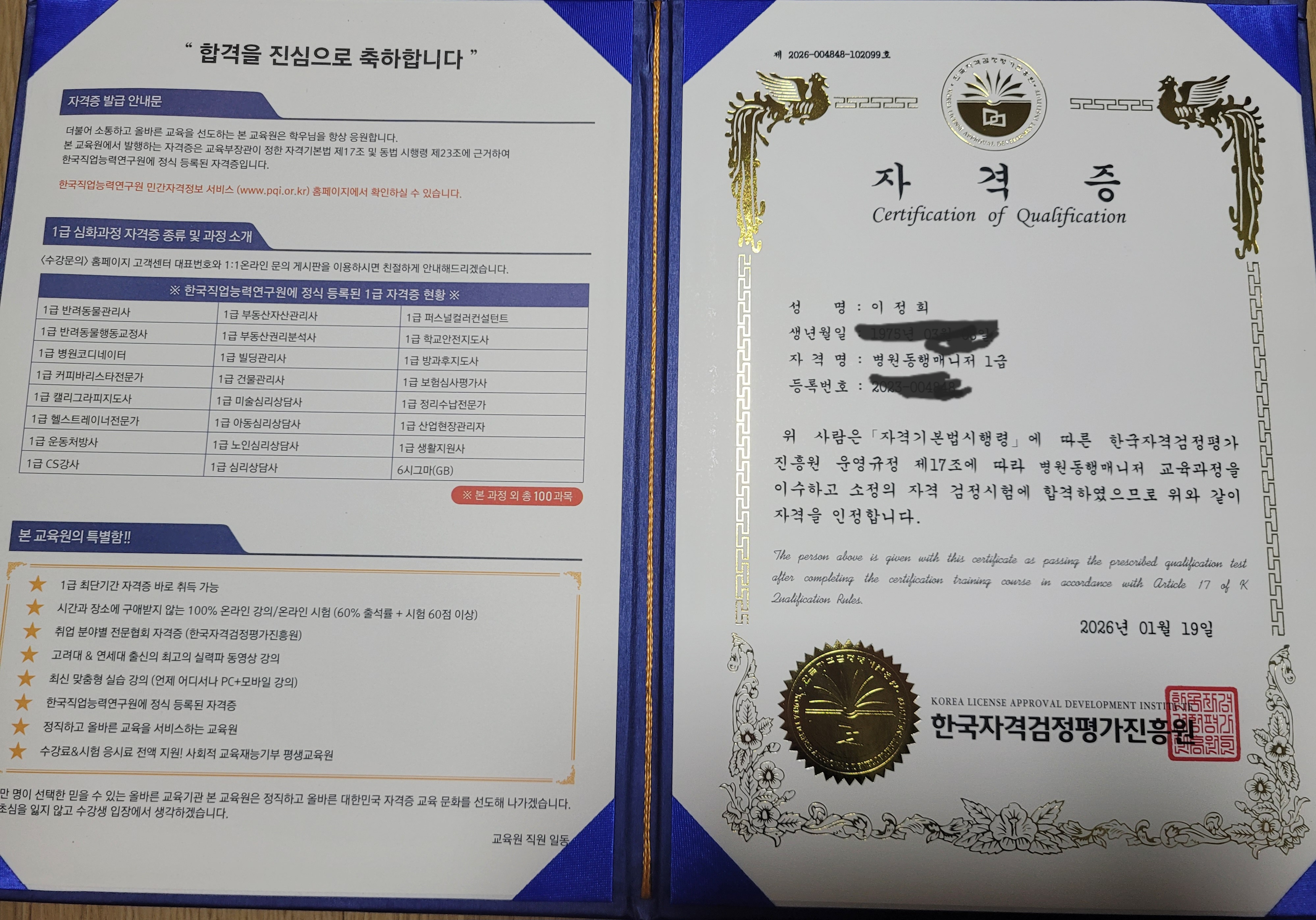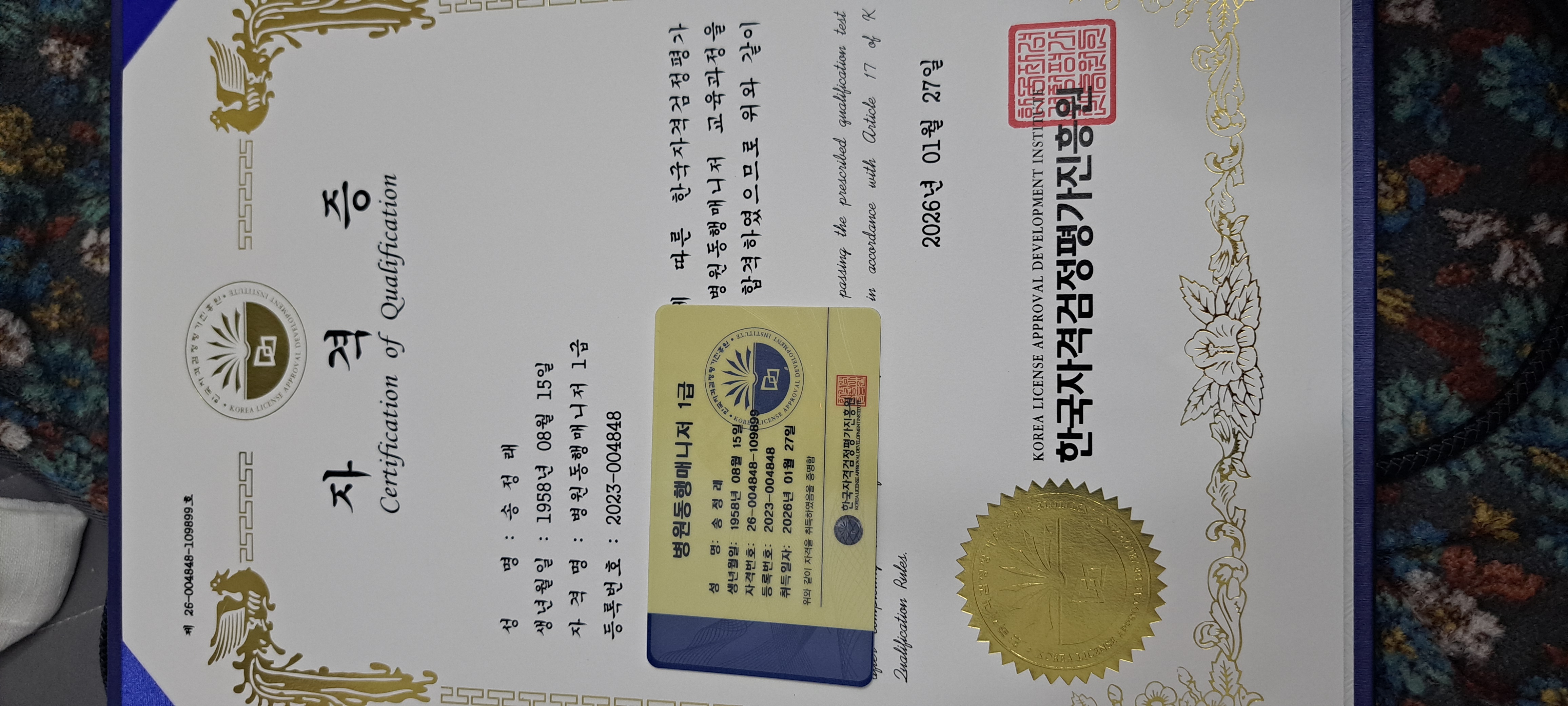 편찮으신 부모님 모시면서 병원동행매니져의 필요성을 많이 느꼈습니다. 한국자격증협회를 통해 시간 장소 걱정없이 배울수 있어서 좋습니다. 강사님을 통해 수업을 이해하기 쉽게 설명해주시니 시험도 바로 합격할수있었고 자격증 도착하는날 어머니 모시고 병원다녀오면서 잘 배웠다 생각되었습니다. 병원에 혼자 다니시기 어려운 수많은 분들을 위해 많은 분들이 배워두시면 꼭 도움이 되리라 생각됩니다.