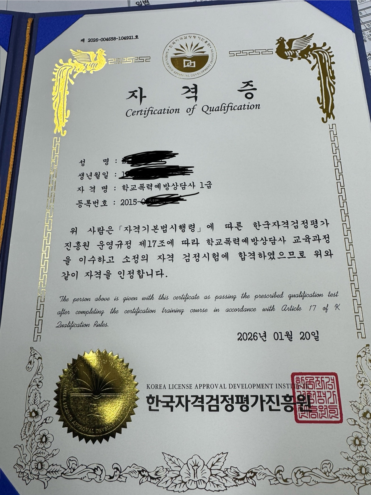 이번 강의와 자격 과정은 학교폭력을 예방의 관점에서 체계적으로 이해할 수 있게 해 준 매우 유익한 시간이었습니다. 막연히 “문제가 생기면 대응한다”가 아니라, 일상에서 무엇을 보고, 어떻게 개입하고, 어떤 신호를 놓치지 말아야 하는지를 구체적으로 배울 수 있었고, 보호자·교육자·상담가의 역할을 현실적으로 정리할 수 있었습니다. 이론에 그치지 않고 실제 사례와 적용 가능한 기준이 명확해 현장에서 바로 활용할 수 있다는 점이 특히 인상 깊었으며, 이번 교육과 자격증을 통해 학교폭력을 줄이기 위해 내가 할 수 있는 실질적인 행동이 분명해졌습니다.