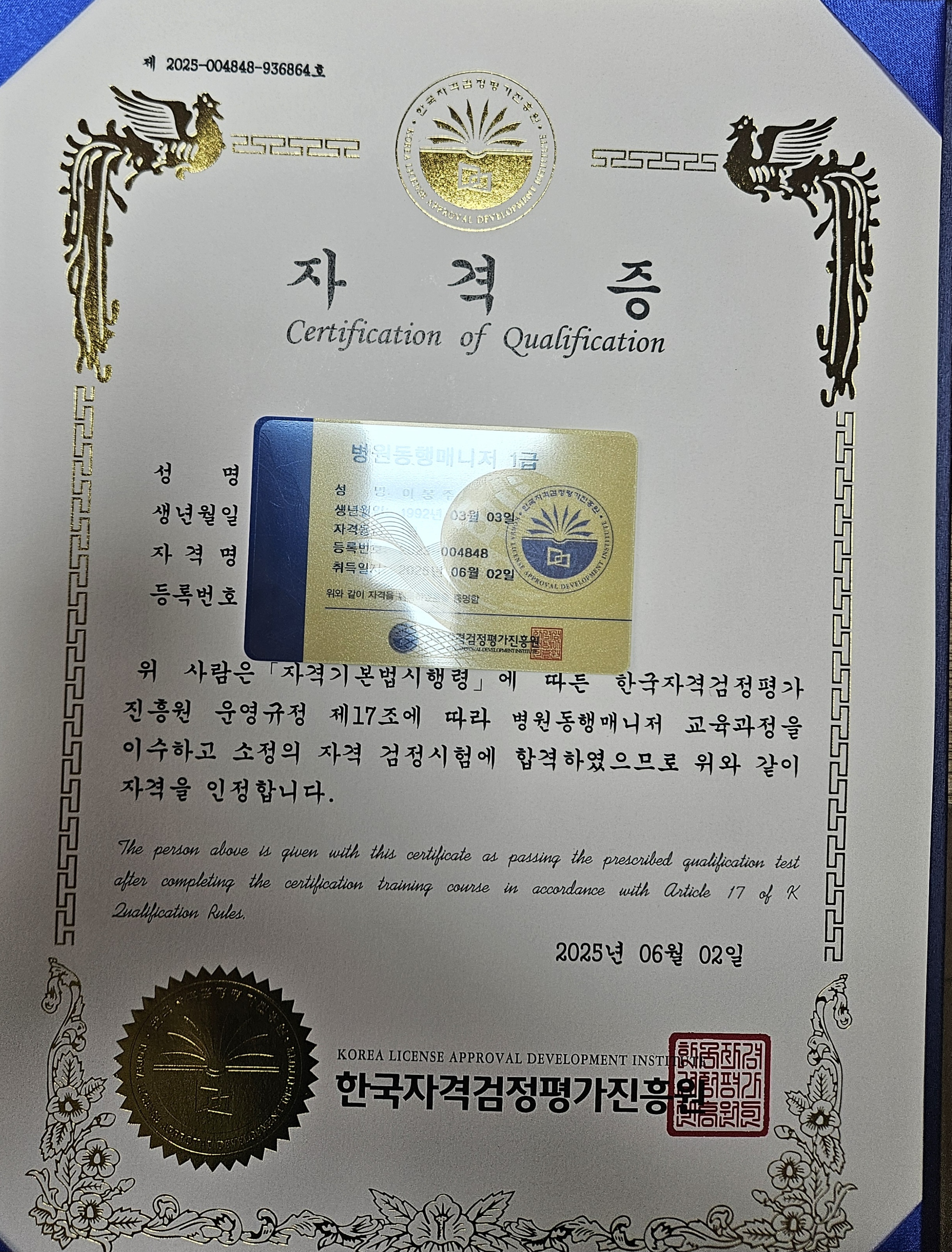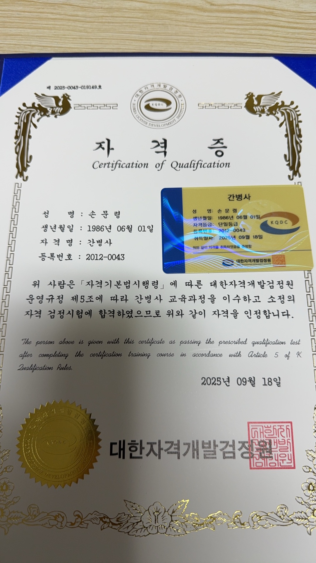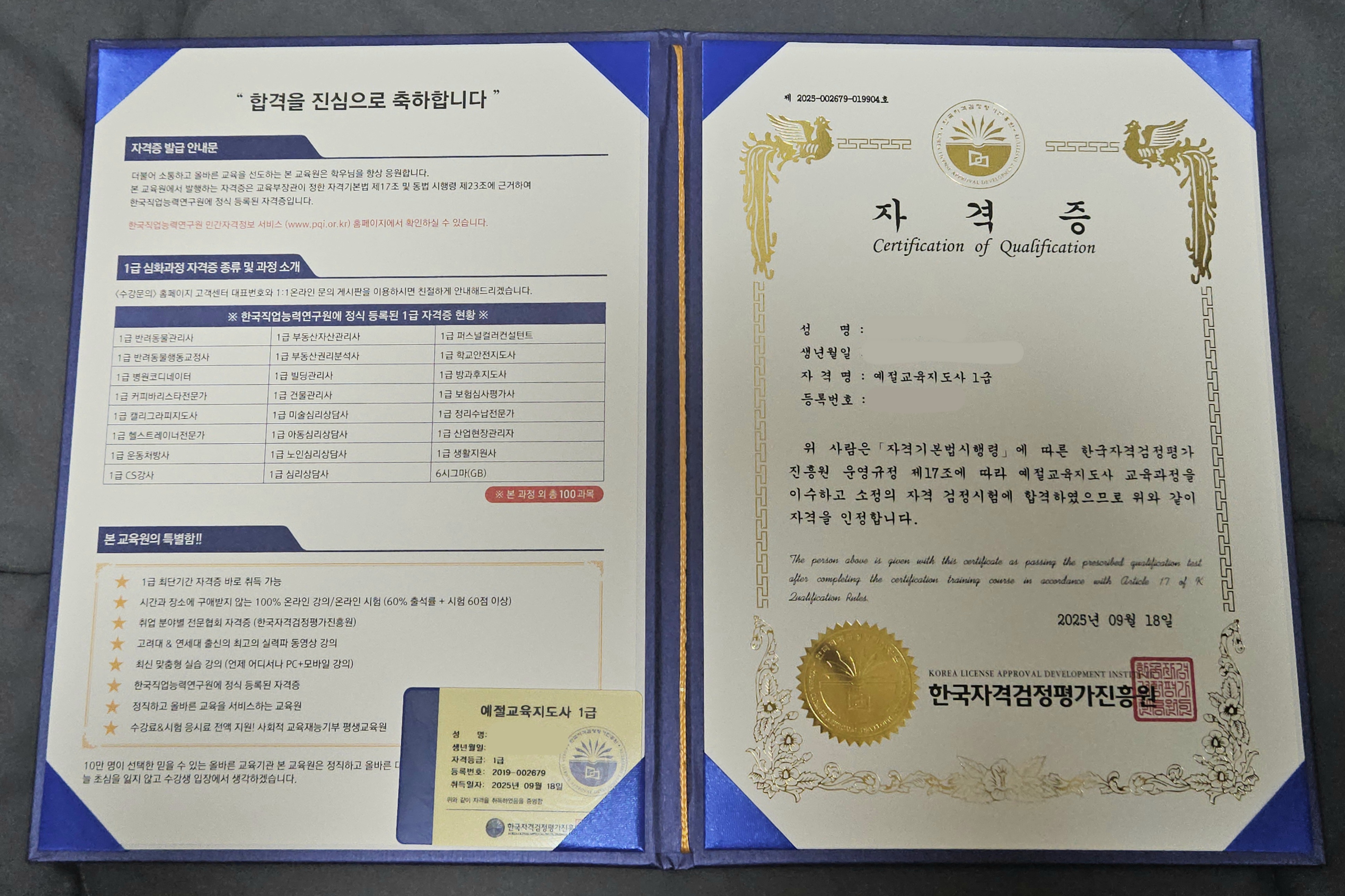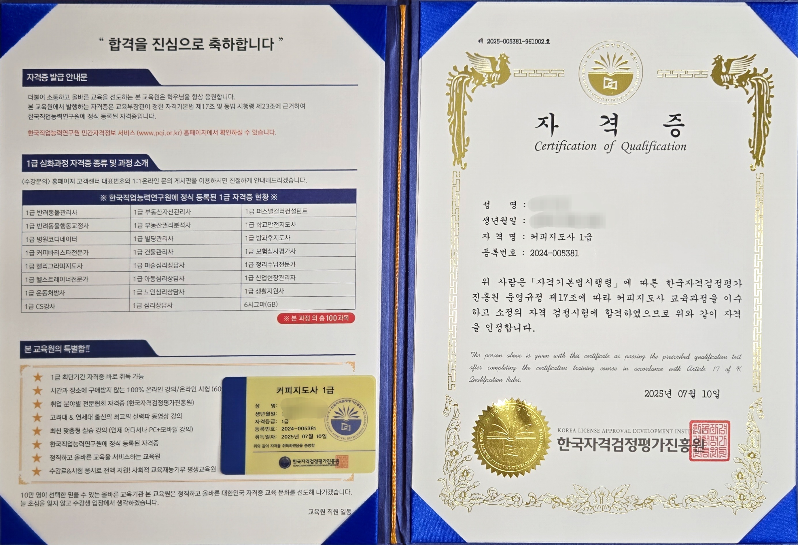 요즘 인기 있는 직업이라는 언니의 권유로 자격증 공부를 하게 되었습니다. 합격해서 기쁘고, 일 할 수 있어서 뿌듯합니다. 감사합니다