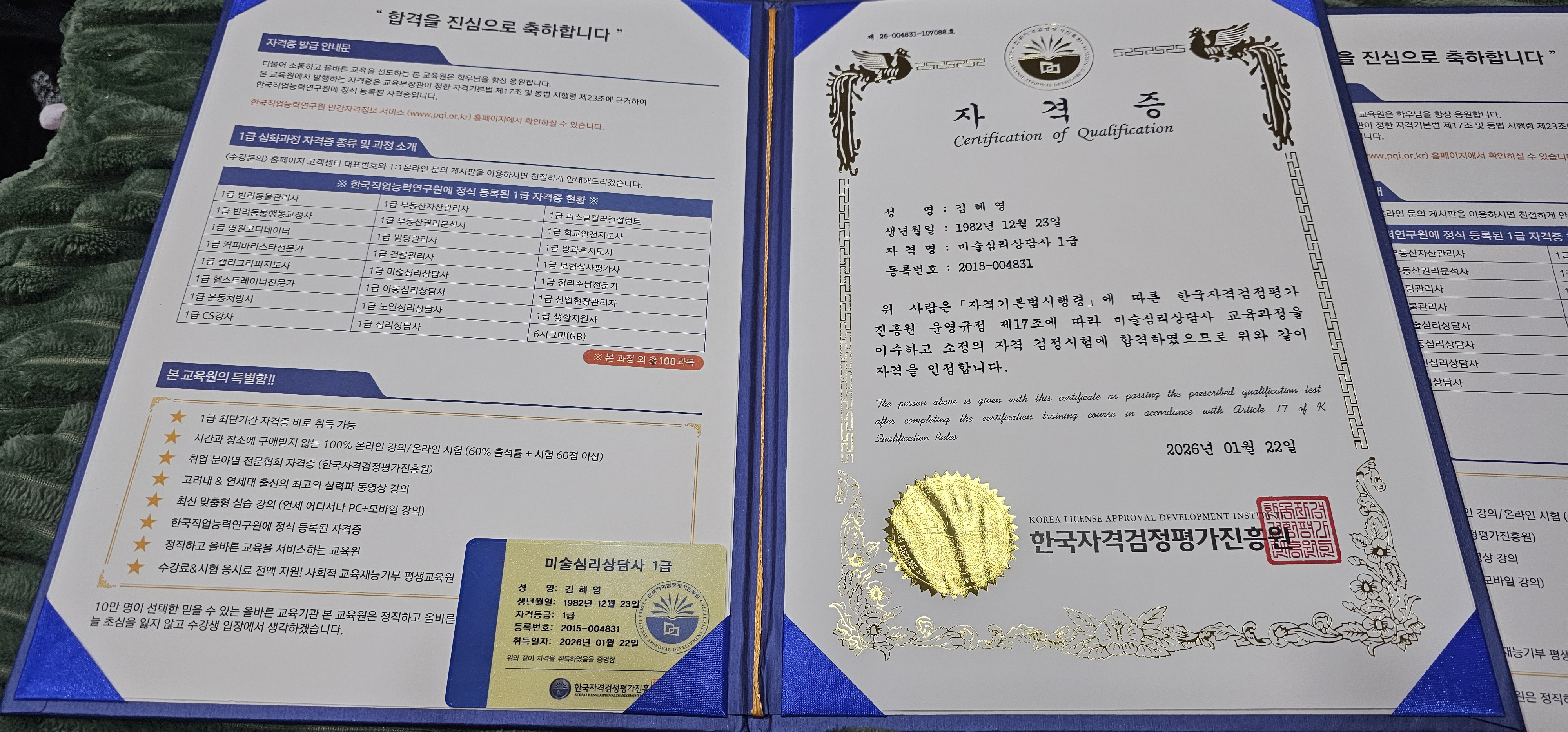 미술심리 어렸을때부터 관심사였는데 저도 취득했습니다~ 많은 사람들에게 도움이 되고 싶어서 취득하였습니다~ 자격증 취득 너무 든든하고 좋아요
