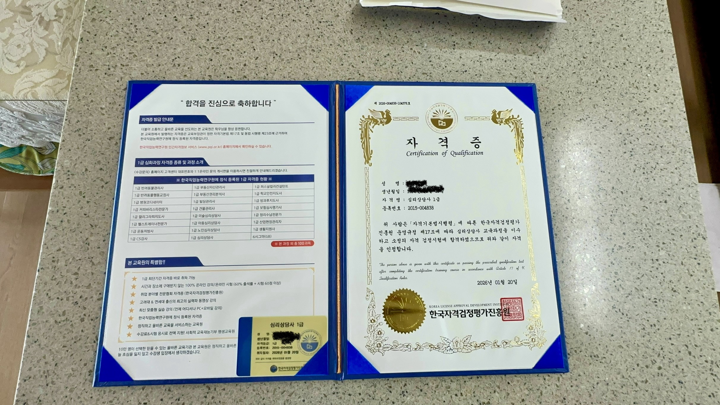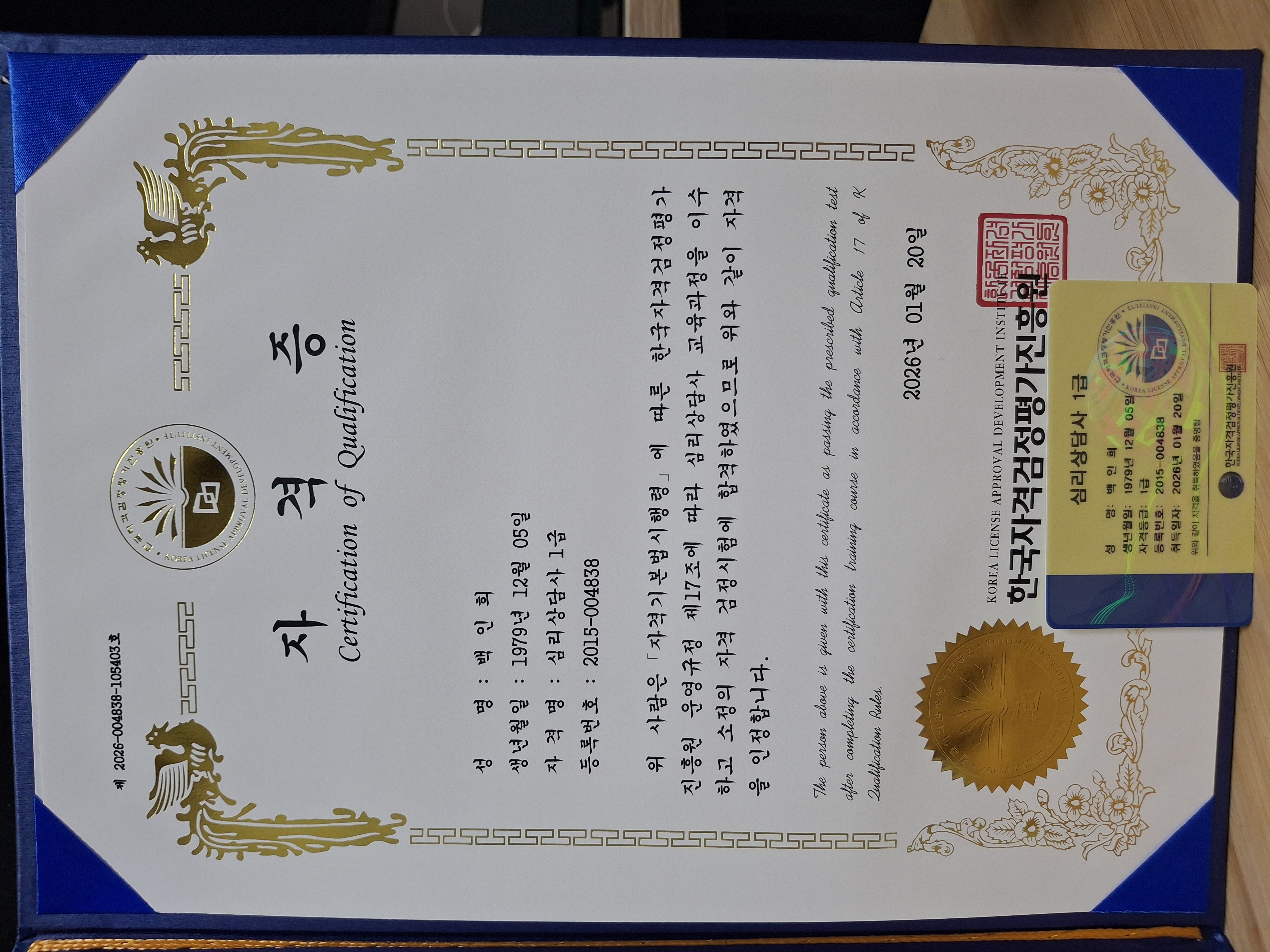 망설이기만 했던 심리상담사 자격증취득 어렵다고 두려워만 했었는데 뿌듯합니다 감사합니다